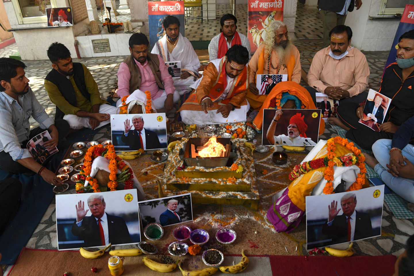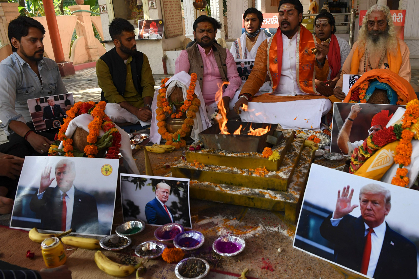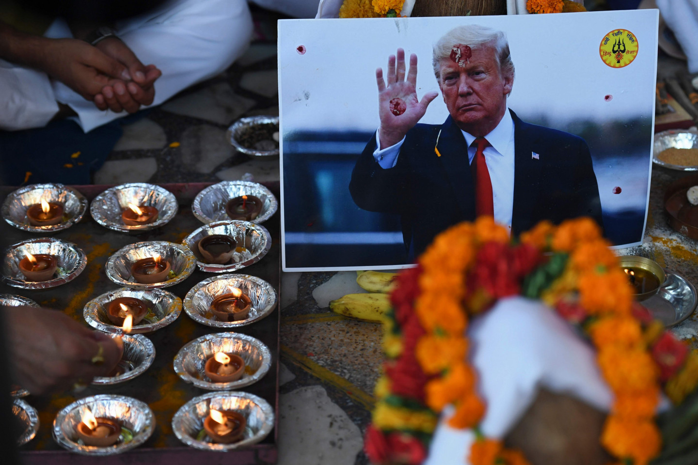 Labējā spārna grupas Hindu Sena aktīvisti piedalās lūgšanu ceremonijā par ASV prezidenta Donalda Trampa uzvaru ASV prezidenta vēlēšanās Ņūdeli 2020. gada 3. novembrī.