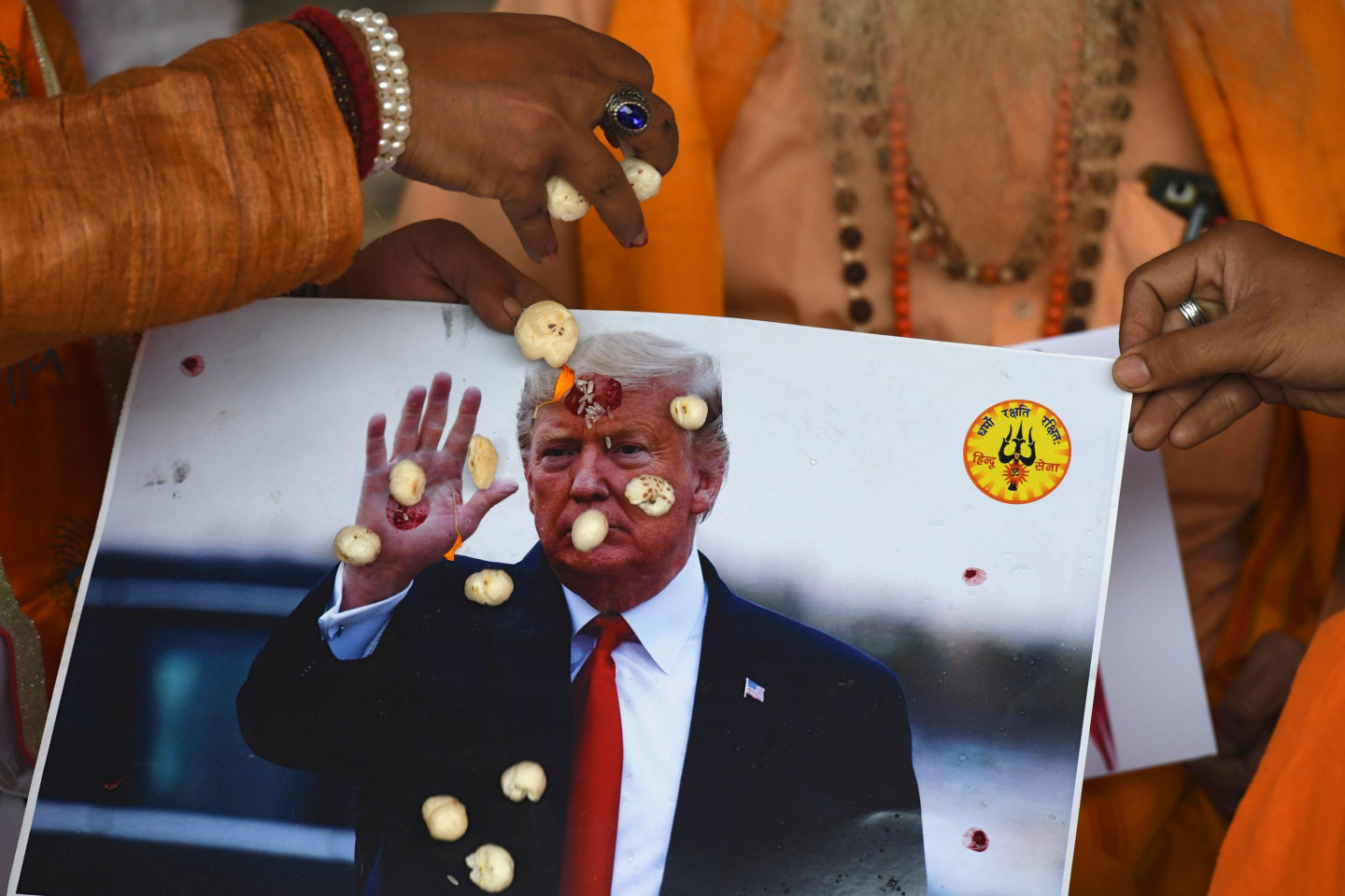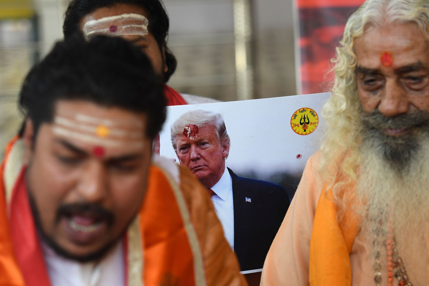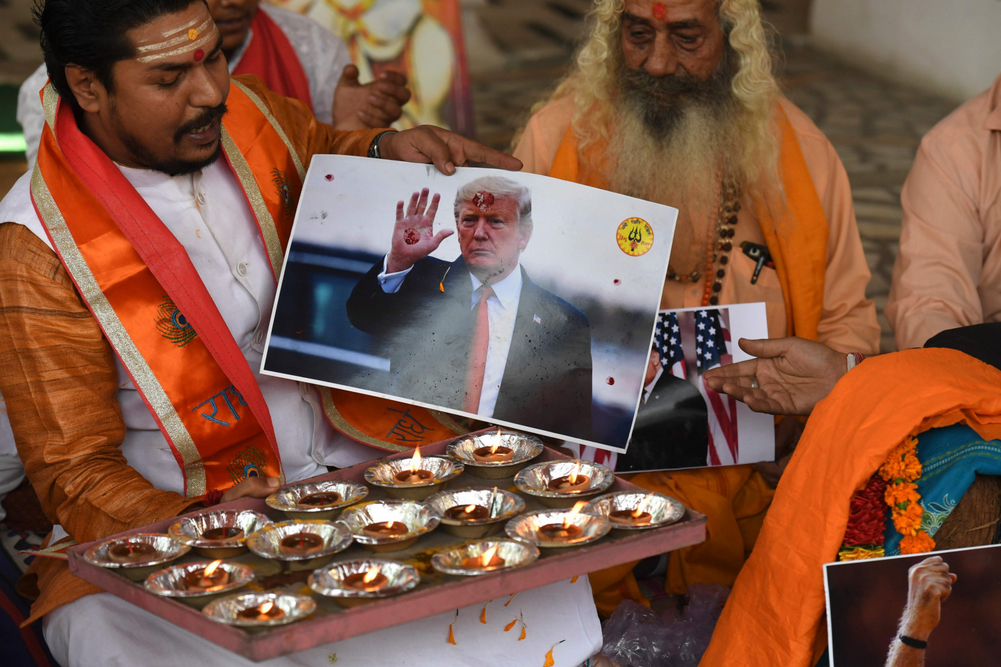 Labējā spārna grupas Hindu Sena aktīvisti piedalās lūgšanu ceremonijā par ASV prezidenta Donalda Trampa uzvaru ASV prezidenta vēlēšanās Ņūdeli 2020. gada 3. novembrī.