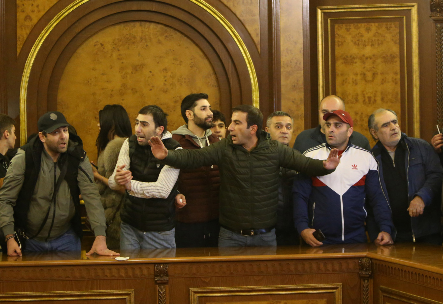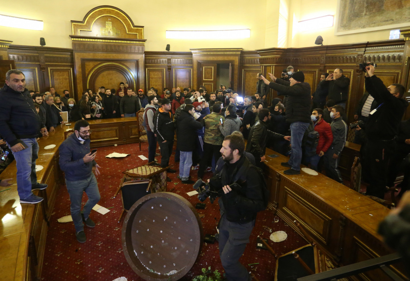 Protestētāji ieņēma parlamentu pēc tam, kad Armēnijas premjerministrs Nikols Pašinjans paziņoja, ka ir parakstījis "sāpīgu" vienošanos ar Azerbaidžānu un Krieviju par karadarbības izbeigšanu Kalnu Karabahā. Pirms tam tūkstošiem protestētāju bija sapulcējušies pie valdības ēkas un ieņēma to, izdauzot logus un izdemolējot birojus. Vietējie mediji ziņo, ka uzbrukts parlamenta spīkerim Araratam Mirzojanam, kurš piekauts un tagad atrodas slimnīcā.