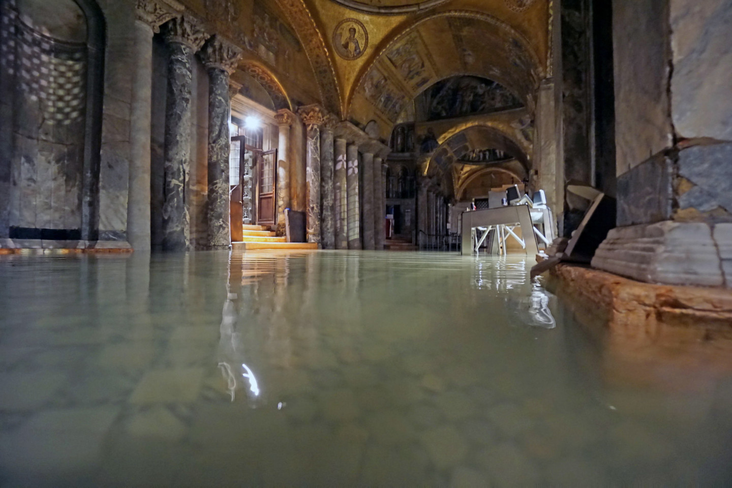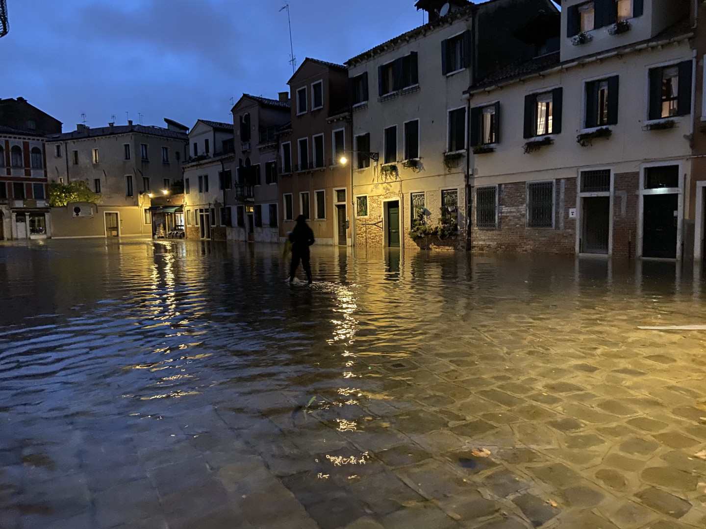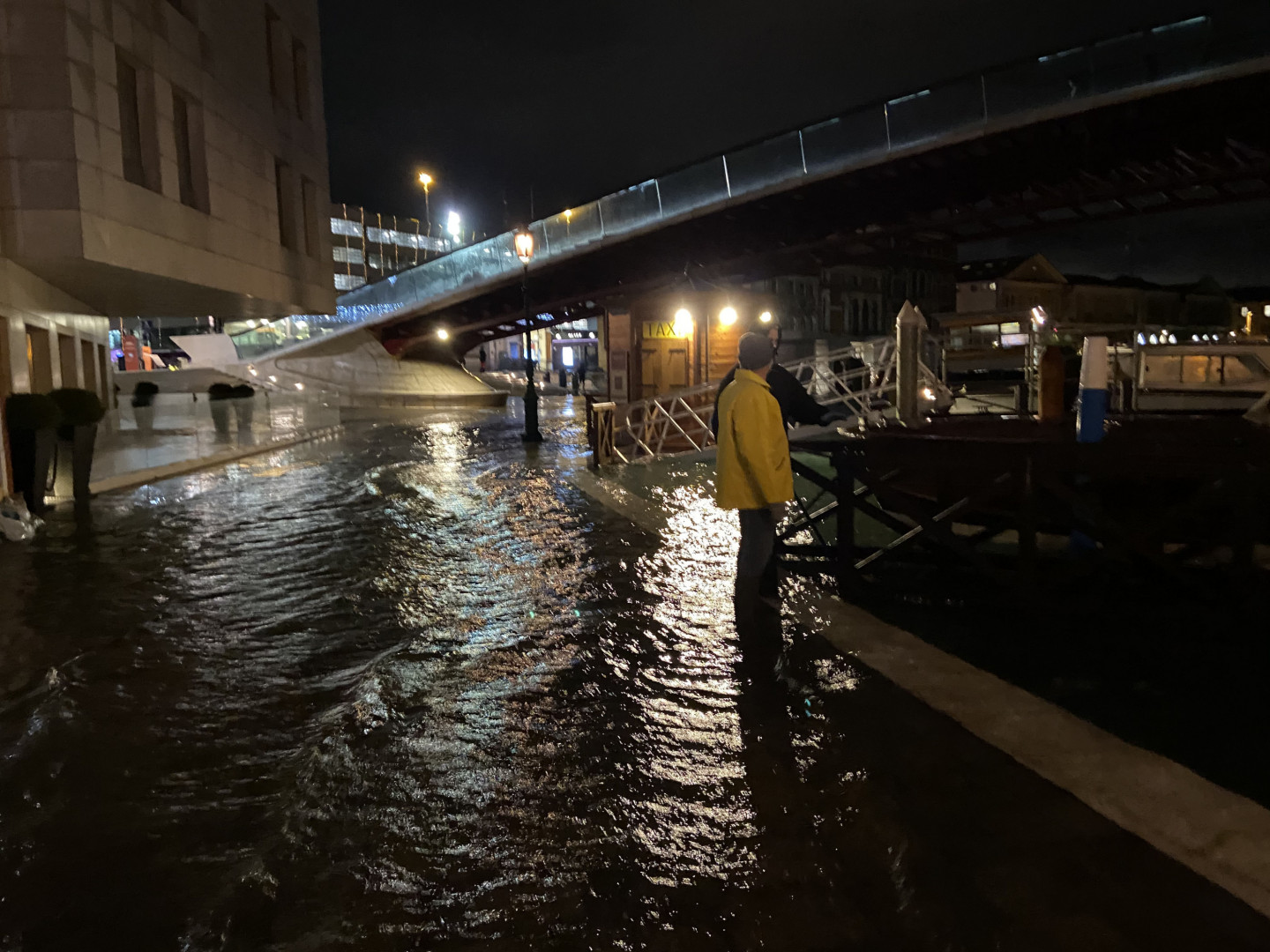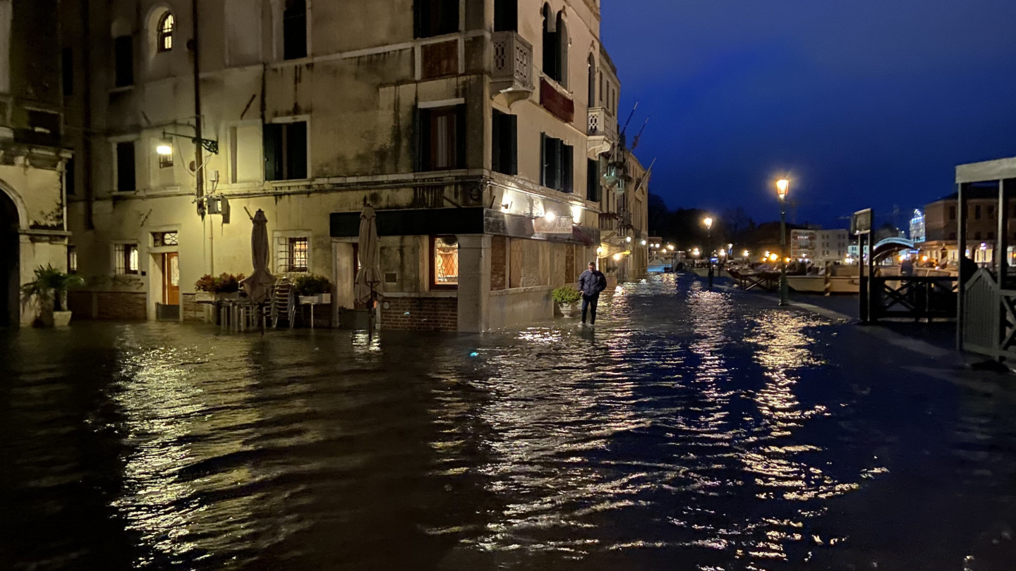 Itālijas pilsētu nesagatavotu pārsteidza spēcīgs vējš, kas "sadzina" ūdeni Venēcijas ielās un laukumos. Kraso laika apstākļu dēļ pašvaldība nepaguva iedarbināt plūdu aizsardzības sistēmu.