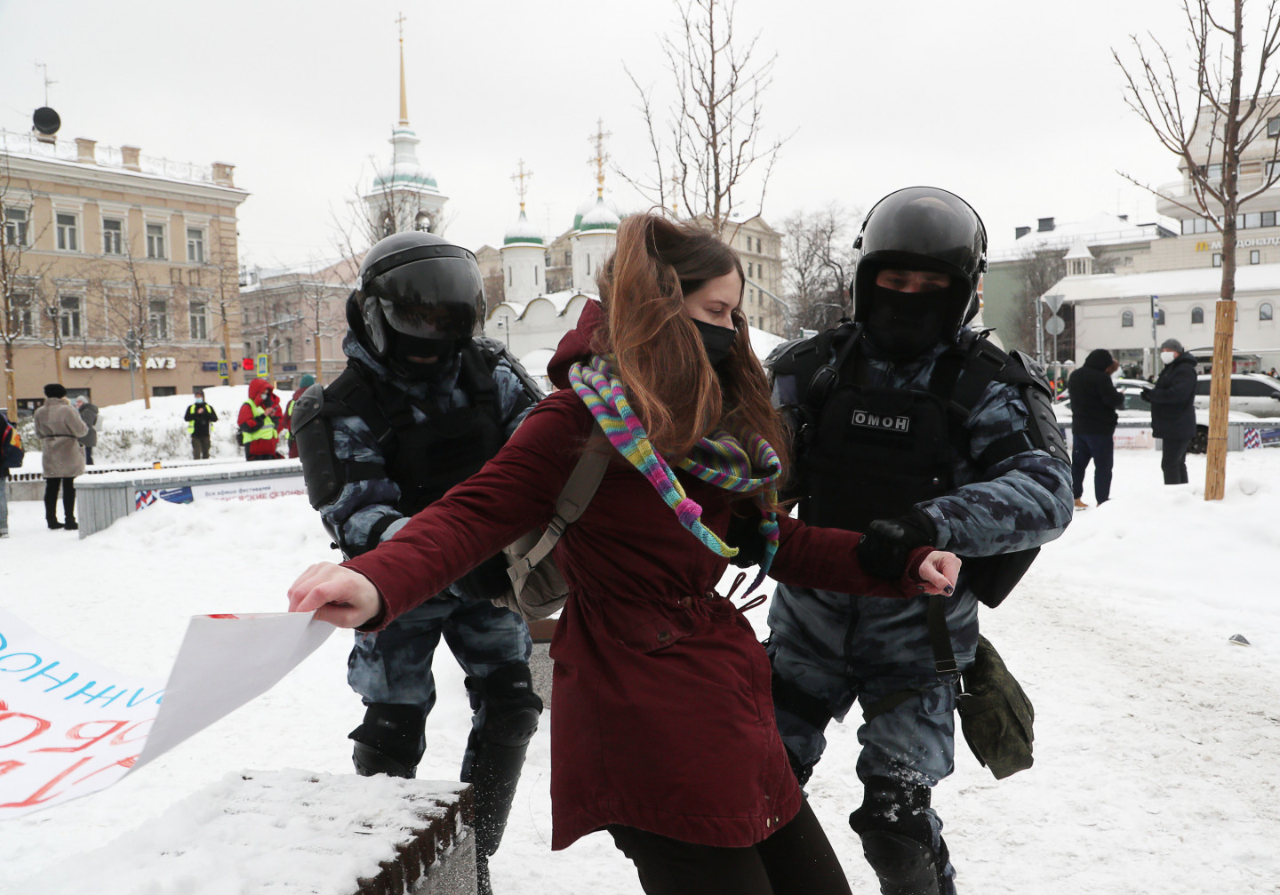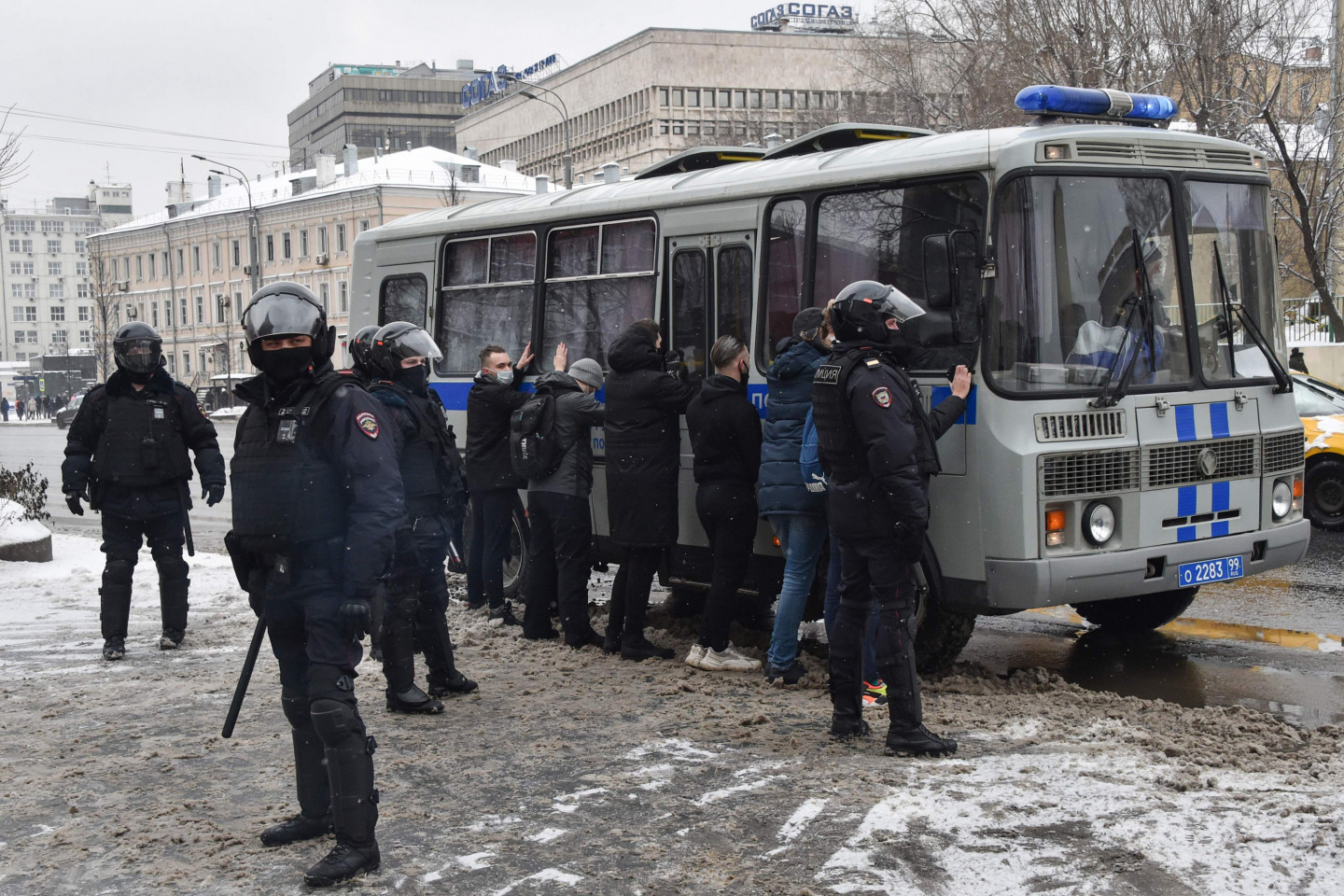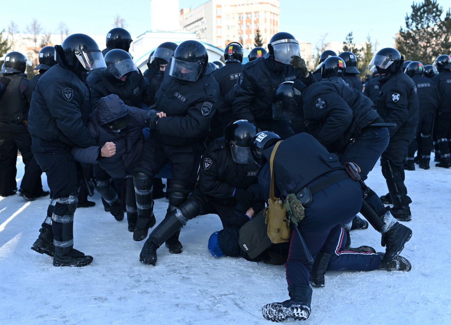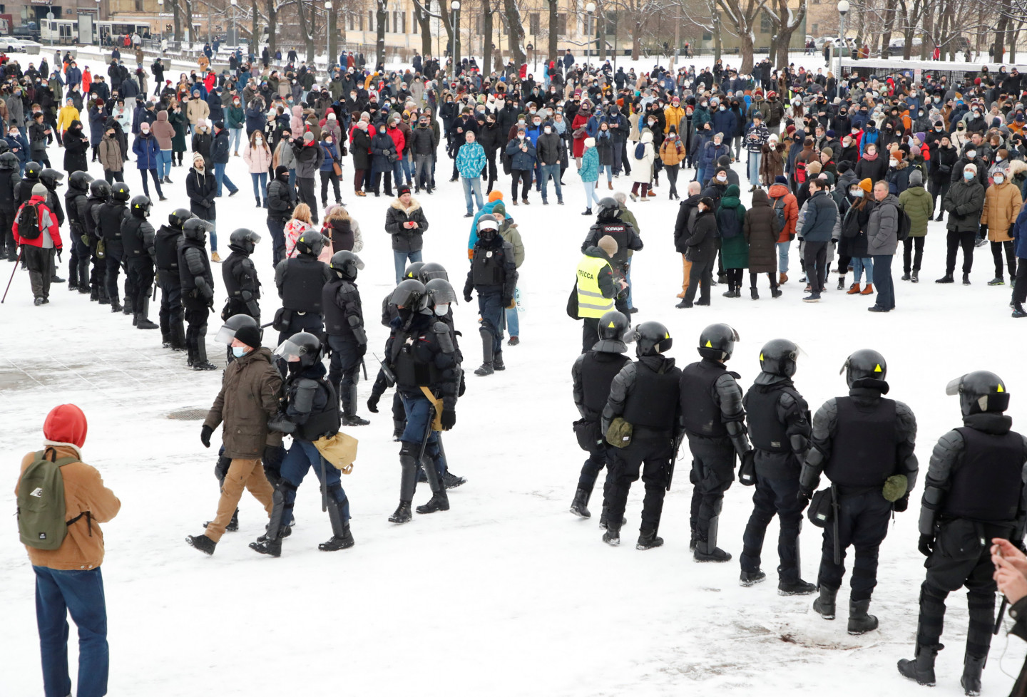 Krievijā notiekošajās protesta akcijās pret opozīcijas līdera Alekseja Navaļnija apcietināšanu aizturēto skaits svētdien sasniedzis vismaz 5021, ziņo nevalstiskā organizācija "OVD-Info", kas Krievijā veic politieslodzīto uzskaiti. Tas ir lielākais aizturēto skaits vienas protesta akcijas laikā, kāds jebkad reģistrēts mūsdienu Krievijā. Vladivostokā, kur protesta akcijas svētdien sākās pirmās, policija aizturējusi vismaz 129 cilvēkus. Daudz aizturēto ir arī Sibīrijas pilsētās. Piemēram, Krasnojarskā aizturēti 194 demonstranti. Īpaši liela demonstrācija notikusi Novosibirskā, kur ielās izgājuši vairāki tūkstoši cilvēku, kas skandēja "Putins zaglis". Arī te aizturēti 103 cilvēki. 180 cilvēki aizturēti Ņižņijnovgorodā, Tverā - 124, Voroņežā 122. Permā aizturēti 40, bet Novokuzņeckā 36 protestētāji. Starp aizturētajiem ir arī radiostacijas "Eho Moskvi" Samāras redakcijas galvenais redaktors. Kopumā saņemtas ziņas par aizturēšanām 87 pilsētās. Maskavā, kur akcijas sākums bija paredzēts plkst.12 (plkst.11 pēc Latvijas laika), intensīvas aizturēšanas sākās vēl pirms tam, un to varēja vērot neatkarīgā televīzijas kanāla "Doždj" tiešajā ēterā. Sākotnēji Navaļnija līdzgaitnieki aicināja ļaudis pulcēties pie Federālā drošības dienesta (FSB) galvenās mītnes, taču Maskavas centrs svētdien tika slēgts. Varasiestādes slēdza gājējiem Sarkano laukumu un galvenās ielas galvaspilsētas centrā, kā arī septiņas metro stacijas. Mainīti tika arī sabiedriskā virszemes transporta maršruti. "Pilsētas centrs pārvērties nepieejamā cietoksnī," ziņoja radiostacijas "Eho Moskvi" korespondents, piebilstot, ka visur redzami policisti, metāla barjeras un policijas autotransports aizturēto pārvietošanai. FSB galvenās mītnes apkārtnē bija slēgti vairāki veikali un kafejnīcas. Tāpēc protesta akcijas rīkotāji mainīja pulcēšanās vietas, un protestēji, izmantojot nelielas šķērsielas un pagalmus, devās gājienā uz cietumu "Motroskaja tišina", kur atrodas apcietinātais Navaļnijs. "Doždj" ziņo, ka arī tur notikusi cilvēku aizturēšana. Kopumā Maskavā aizturēti vairāk nekā 1600 cilvēki. Starp aizturētajiem bija arī Navaļnija dzīvesbiedre Jūlija. Aizturēts arī vēsturnieks, publicists un Cilvēktiesību padomes loceklis Nikolajs Svanidze. Jūlija Navaļnija pēc protokola sastādīšanas par mītiņu rīkošanas noteikumu pārkāpumu vakarā tikusi atbrīvota, taču pirmdien plkst.10 (plkst.9 pēc Latvijas laika) viņai jāierodas tiesā. "Doždj" vēsta, ka pie metro stacijas "Tverskaja" kāds vīrietis esot aplējies ar benzīnu un aizdedzinājies. Vīrietis ar stipriem apdegumiem nogādāts slimnīcā, un šobrīd atrodas reanimācijas nodaļā. Par viņa rīcības motīviem ziņu pagaidām nav. Lai gan Navaļnija štābs jau paziņojis, ka protesta akcija ir beigusies, ne visi ļaudis vēlējušies izklīst, un tiek ziņots, ka Maskavā un Sanktpēterburgā turpinās aizturēšanas. Arī Sanktpēterburgā dienas gaitā pilsētas centrs bija slēgts. Otrajā lielākajā Krievijas pilsētā notikušas arī nelielas sadursmes starp protestētājiem un policiju. Cita starpā Sanktpēterburgā uz neilgu laiku aizturēts Krievijā pazīstamais reperis "Oxxxymiron", bet kopumā aizturēti vismaz 1116 protestētāji. Saskaņā ar "OVD-Info" datiem starp aizturētajiem ir vismaz 93 žurnālisti. Cilvēktiesību aizstāvji ziņo, ka policisti vismaz 51 cilvēku aizturēšanas laikā piekāvuši. Atšķirībā no pagājušās nedēļas nogales policija svētdien lietojusi ne tikai stekus, bet arī elektrošoka ierīces. Solidaritātes akcijas ar Krievijas opozīciju notikušas arī citviet pasaulē. Piemēram, Parīzē ielās izgājuši aptuveni 200 cilvēku, vēsta laikraksts "Novaja Gazeta". Solidaritātes mītiņš noticis arī Amsterdamā. Tikmēr ASV nosodījušas vēršanos pret miermīlīgajiem demonstrantiem un pieprasījušas Navaļnija atbrīvošanu. "ASV nosoda pastāvīgu skarbas taktikas pielietošanu no Krievijas varasiestāžu puses pret miermīlīgiem protestētājiem un žurnālistiem, kas turpinās divas nedēļas pēc kārtas," tviterī paziņojis valsts sekretārs Entonijs Blinkens. Kā ziņots, iepriekšējā nedēļas nogalē notikušajās protesta akcijās visā Krievijā kopumā aizturēti 4002 cilvēki. Savukārt Maskava, reaģējot uz Blinkena paziņojumu, apsūdzējusi Vašingtonu par iejaukšanos Krievijas iekšējās lietās. Neskatoties uz aso varasiestāžu reakciju uz nesankcionētajām protesta akcijām, vietējie mediji lēš, ka svētdien vairākās pilsētās ielās izgājis lielāks skaits protestētāju nekā 23.janvārī. Kā vēsta vietējie izdevumi, vairāk cilvēku piedalījušies protestos Novosibirskā un Jekaterinburgā. Tur, pēc mediju apsēm, ielās izgājuši vairāk nekā 12 tūkstoši demonstrantu. Tīmekļa izdevums "Otkritije Media" raksta, ka 40 lielākajās Krievijas pilsētās protestos piedalījušies 60 līdz 100 tūkstoši cilvēku. Tikai Maskavā akcijas apogeja brīdī tās dalībnieku skaits varētu būt sasniedzis 15 000. Tajā pašā laikā Maskavas policija apgalvo, ka protesta akcijā galvaspilsētā piedalījušies tikai 2000 cilvēku.