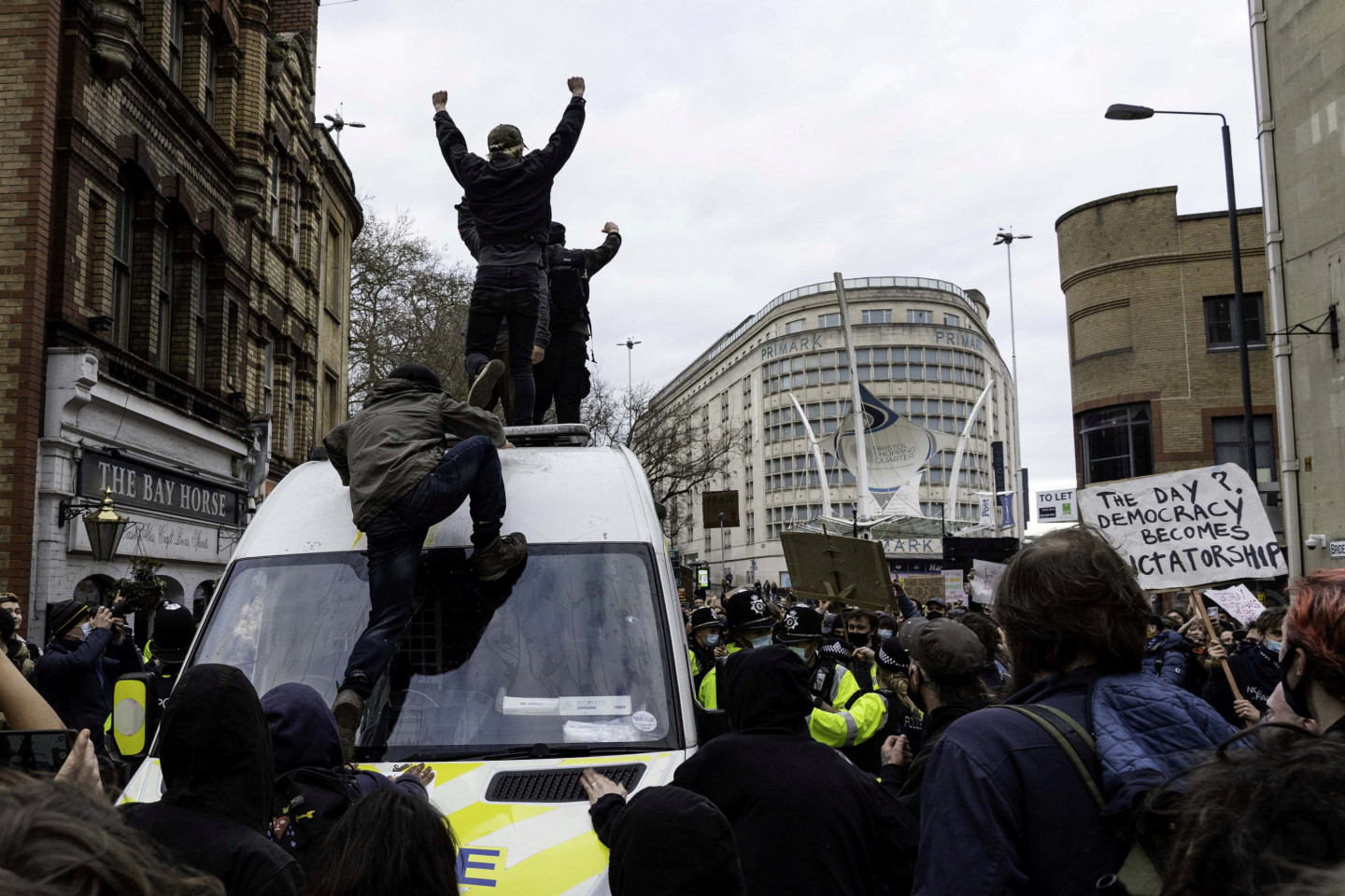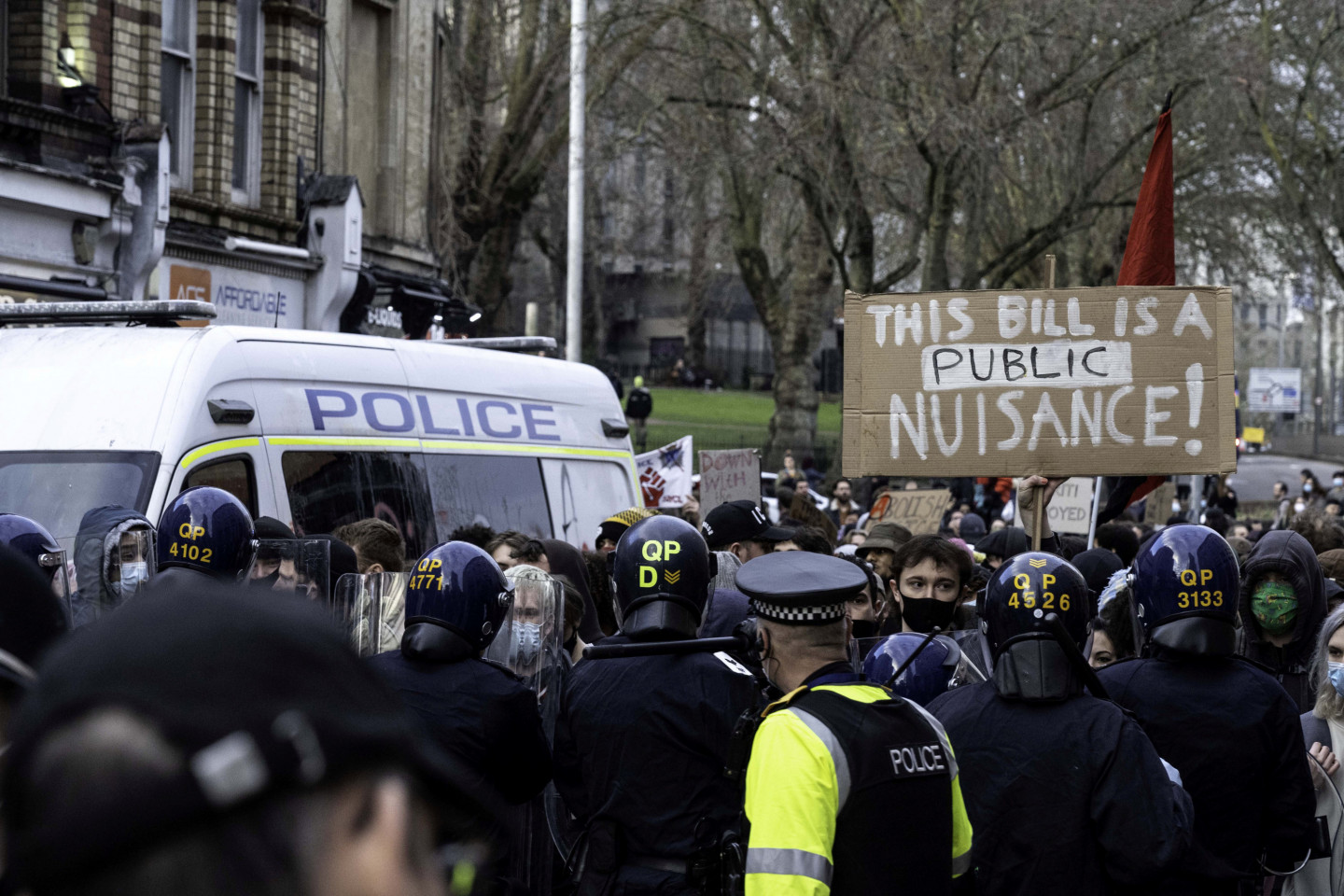 Anglijā Bristolē protestiem pret jauno policijas likumprojektu pāraugot vardarbībā, ievainoti vismaz 20 likumsargi, divi no viņiem nopietni, pirmdien pavēstīja policija. Lielbritānijas iekšlietu ministre Priti Patela protestus, kas sākās pēcpusdienā un turpinājās naktī, nosodīja, sakot, ka tie ir nepieņemami. Vardarbīgos izlēcienus viņa dēvēja par bandītismu, brīdinot, ka tie netiks pieciesti. Miermīlīgi sākusies demonstrācija pārauga vardarbībā, kad vairāki simti protestētāju uzbruka Ņūbraidvelas policijas iecirknim. Protestētāji pauda nosodījumu likumprojektam, kas policijai paredz plašākas pilnvaras protestu kontrolēšanā, vēsta LETA. Protestētāju plakātos bija lasāmi tādi saukļi kā "Teiksim "nē" policejiskai valstij Lielbritānijā" un "Brīvība protestēt ir demokrātijas pamatā". Protestu gaidā aizturēti septiņi cilvēki, sacīja Eivonas un Somersetas reģiona policijas komisāre Sjū Mauntstīvensa, pieļaujot, ka saistībā ar vardarbību tiks aizturēti daudzi citi. Protestētāji mēģināja izdauzīt policijas iecirkņa logus un durvis, kā arī aizdedzināja vienu policijas auto, tomēr liesmas ātri tika apdzēstas. Bojājumi nodarīti 12 policijas auto, bet Ņūbraidvelas policijas iecirknim nodarīti "nopietni postījumi", sacīja policijas konstebls Endijs Māršs. "Policisti tika apmētāti ar akmeņiem, dažādiem priekšmetiem un pirotehniku. Situācija, ar kuru viņiem bija jātiek galā, bija šausminoša," atzina Māršs. "Mums 20 policisti ir ievainoti, divi no viņiem nopietni, un es ar vienu no viņiem runāju slimnīcā."