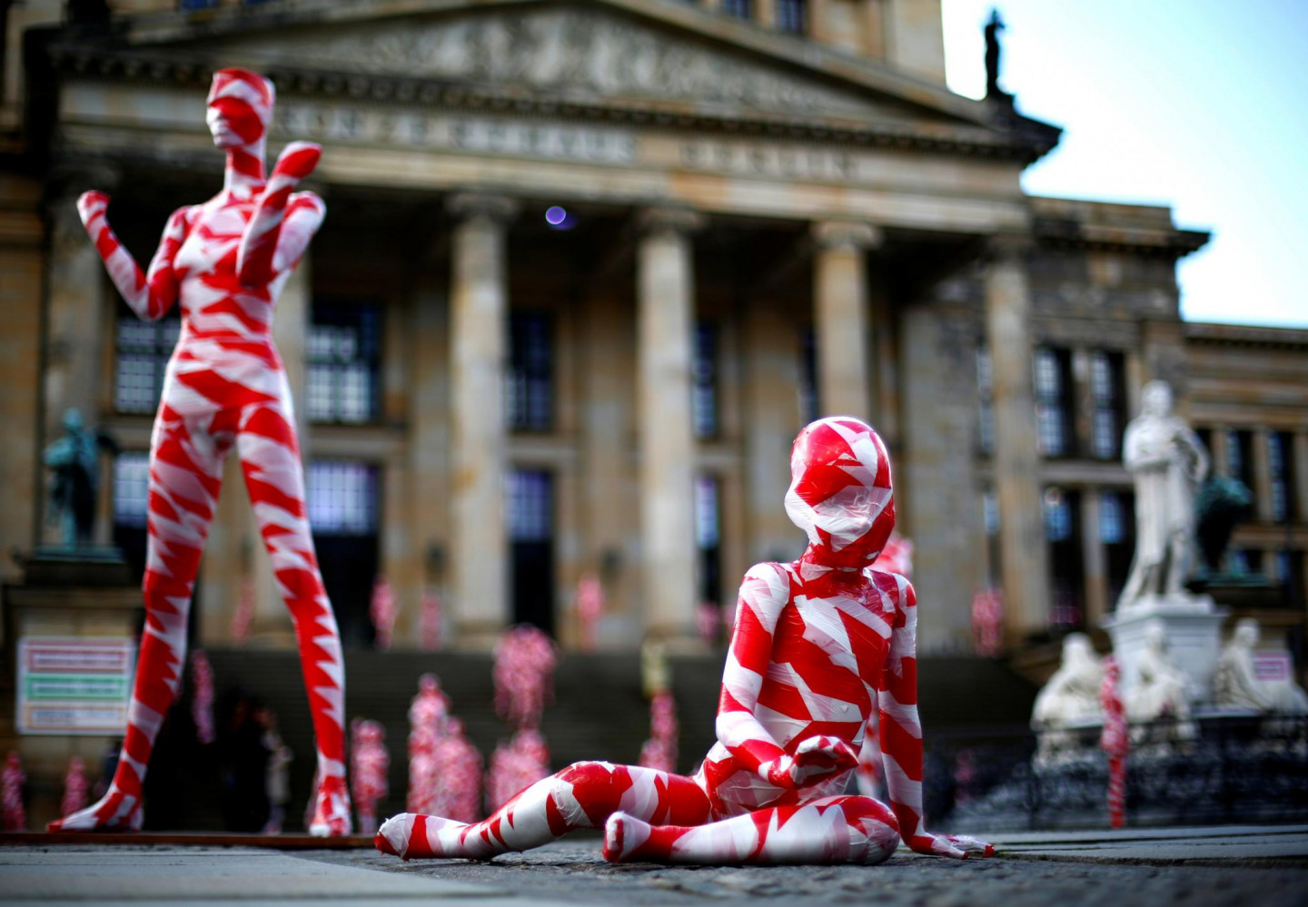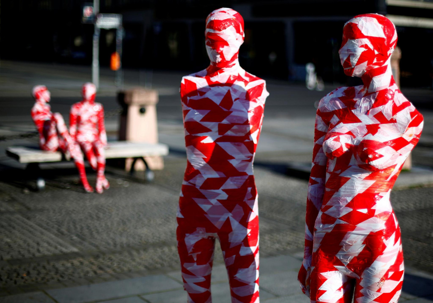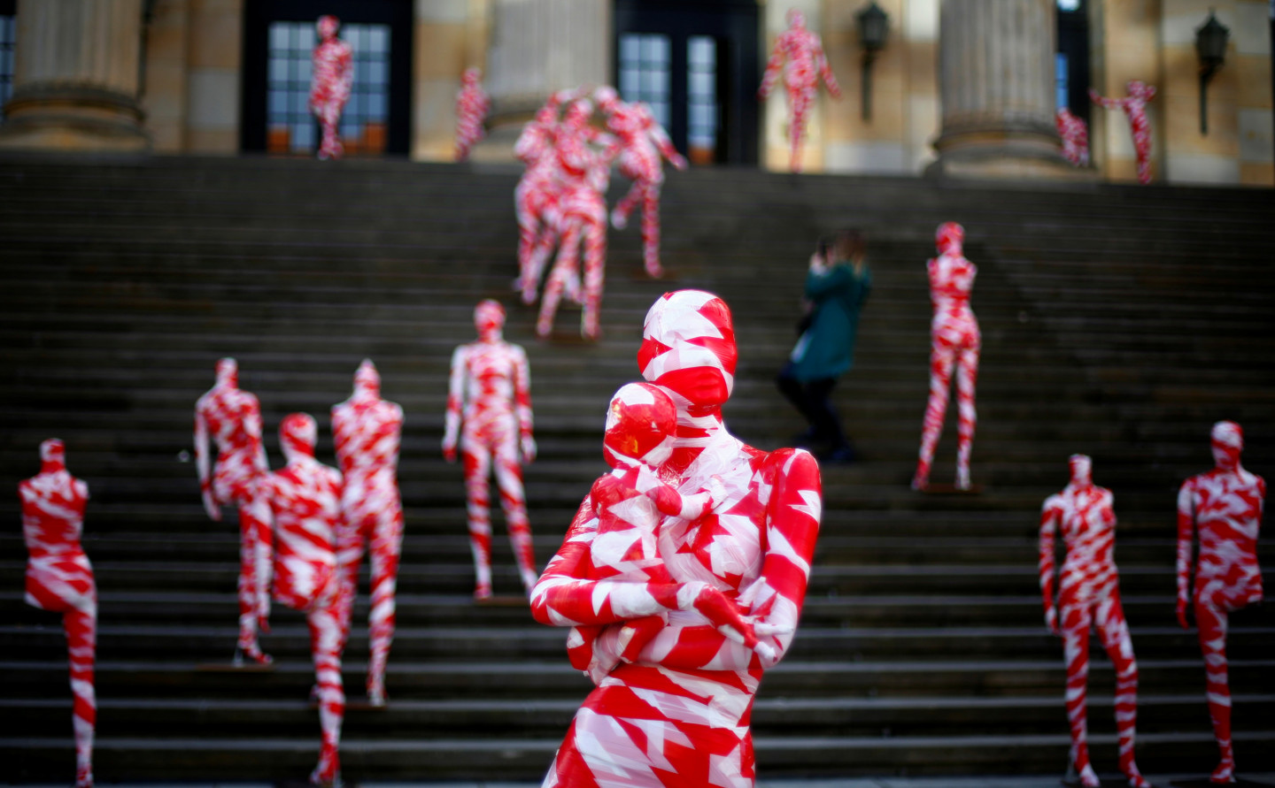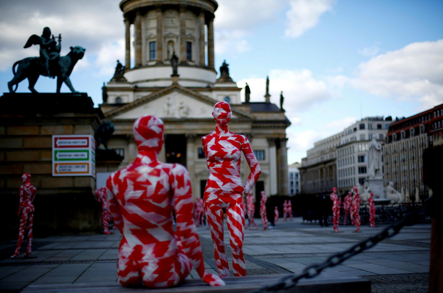 Vācijā, Berlīnē Gendarmenmarkta laukuma izvietoti vairāki manekeni. Tie ir ietīti sakarnbaltsarkanās letās. Šie manekeni simbolizē koronavīrusa izraisīto krīzi. Manekenus un kompozīciju ir veidojis vācu māksliniels Deniss Žozefs Mesega.
