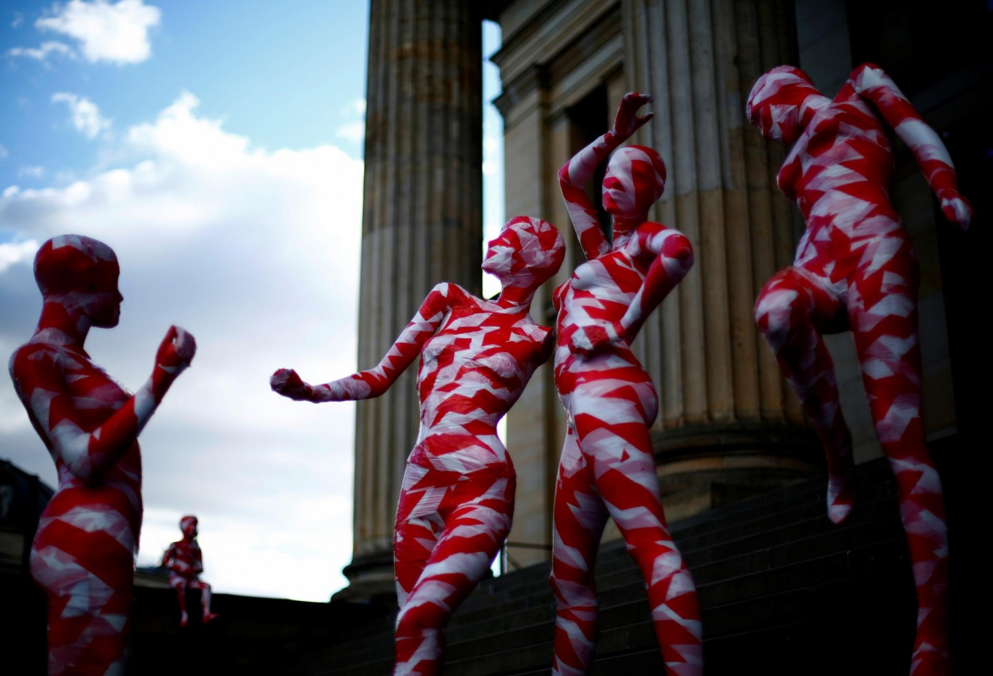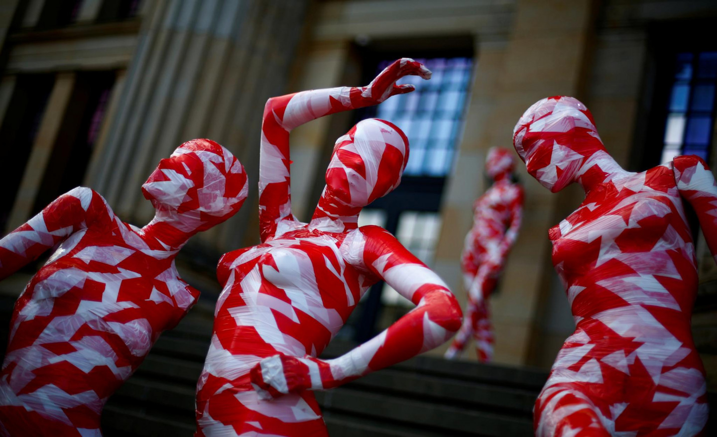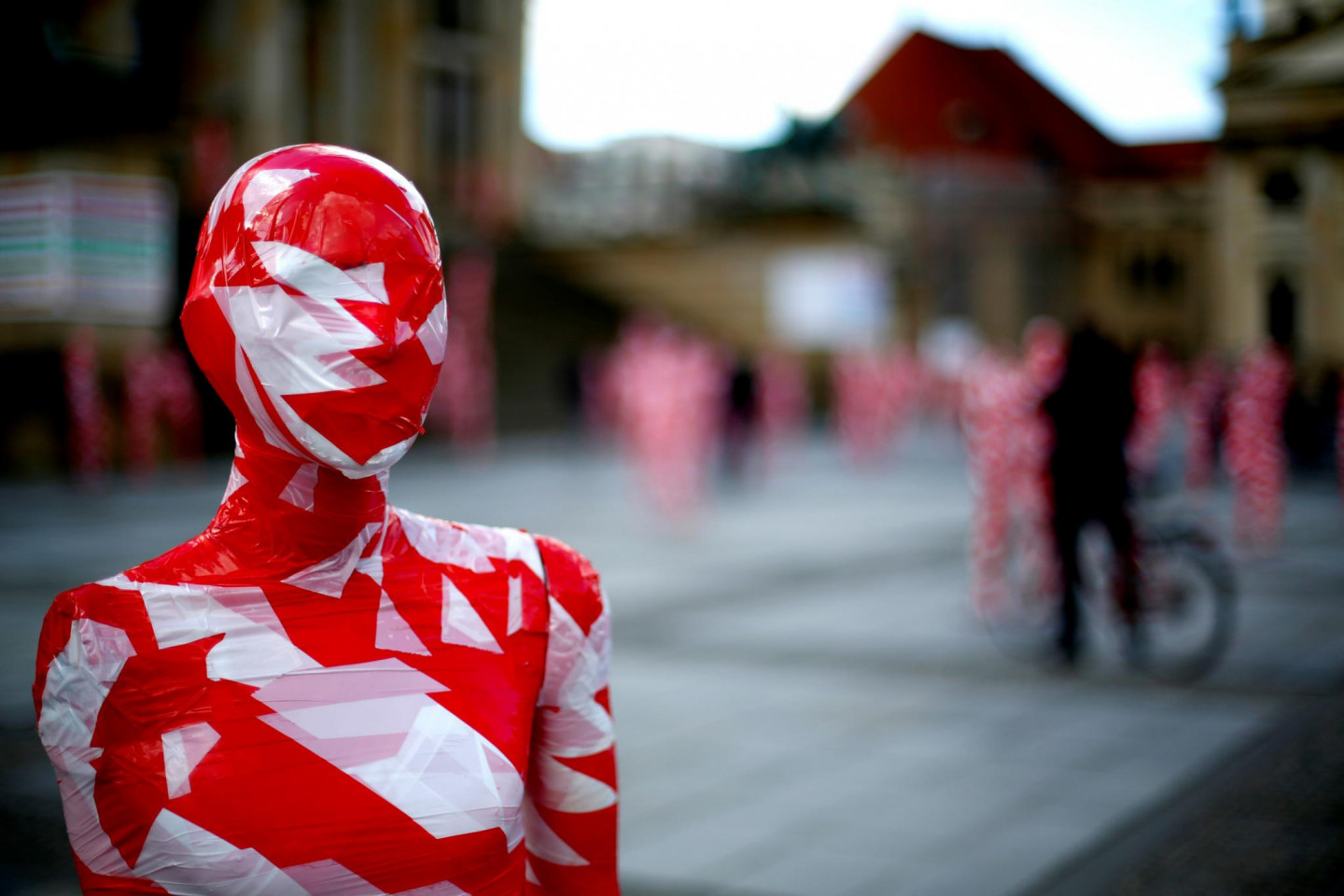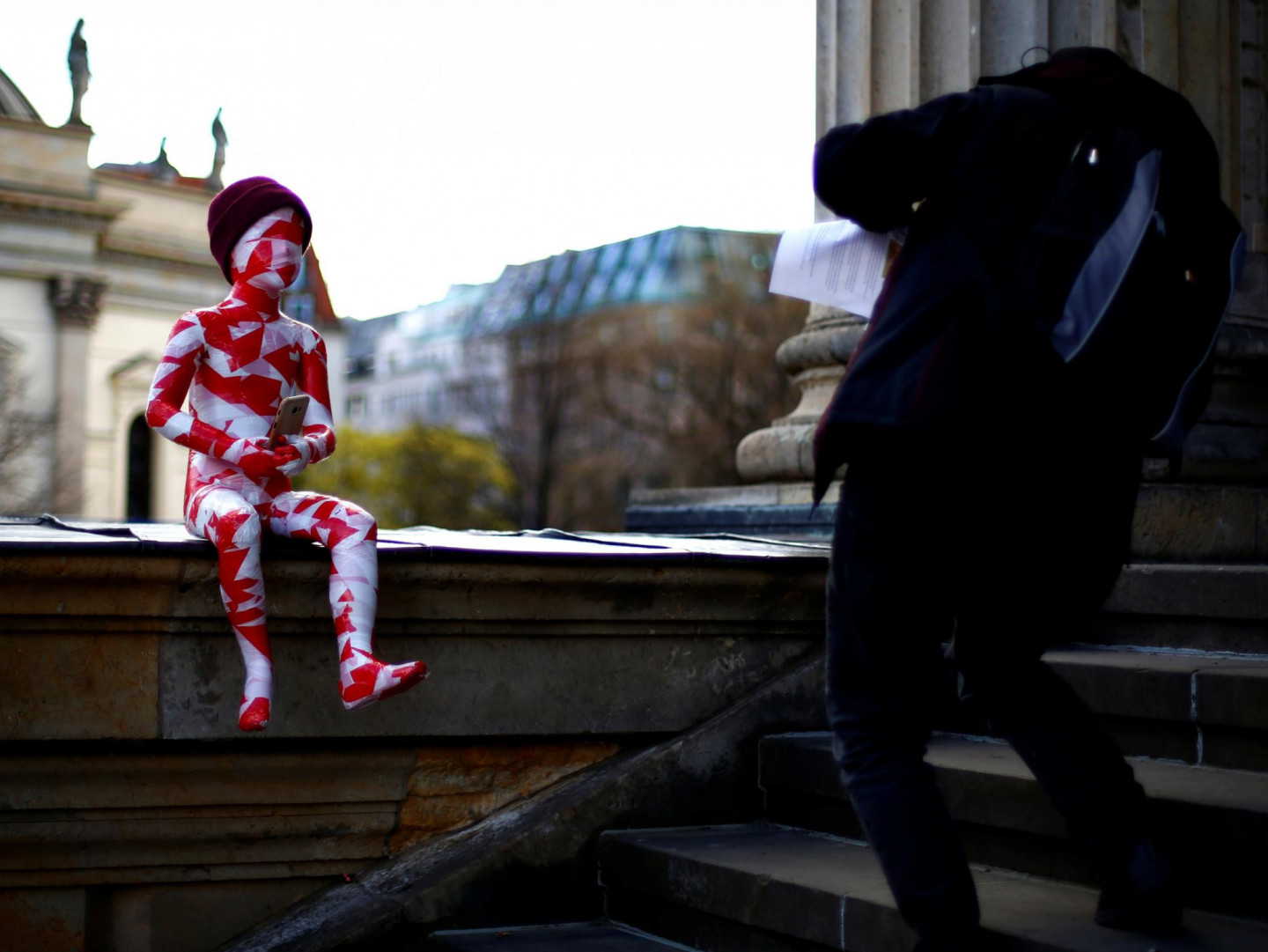 Vācijā, Berlīnē Gendarmenmarkta laukuma izvietoti vairāki manekeni. Tie ir ietīti sakarnbaltsarkanās letās. Šie manekeni simbolizē koronavīrusa izraisīto krīzi. Manekenus un kompozīciju ir veidojis vācu māksliniels Deniss Žozefs Mesega.