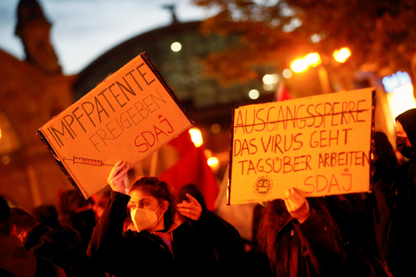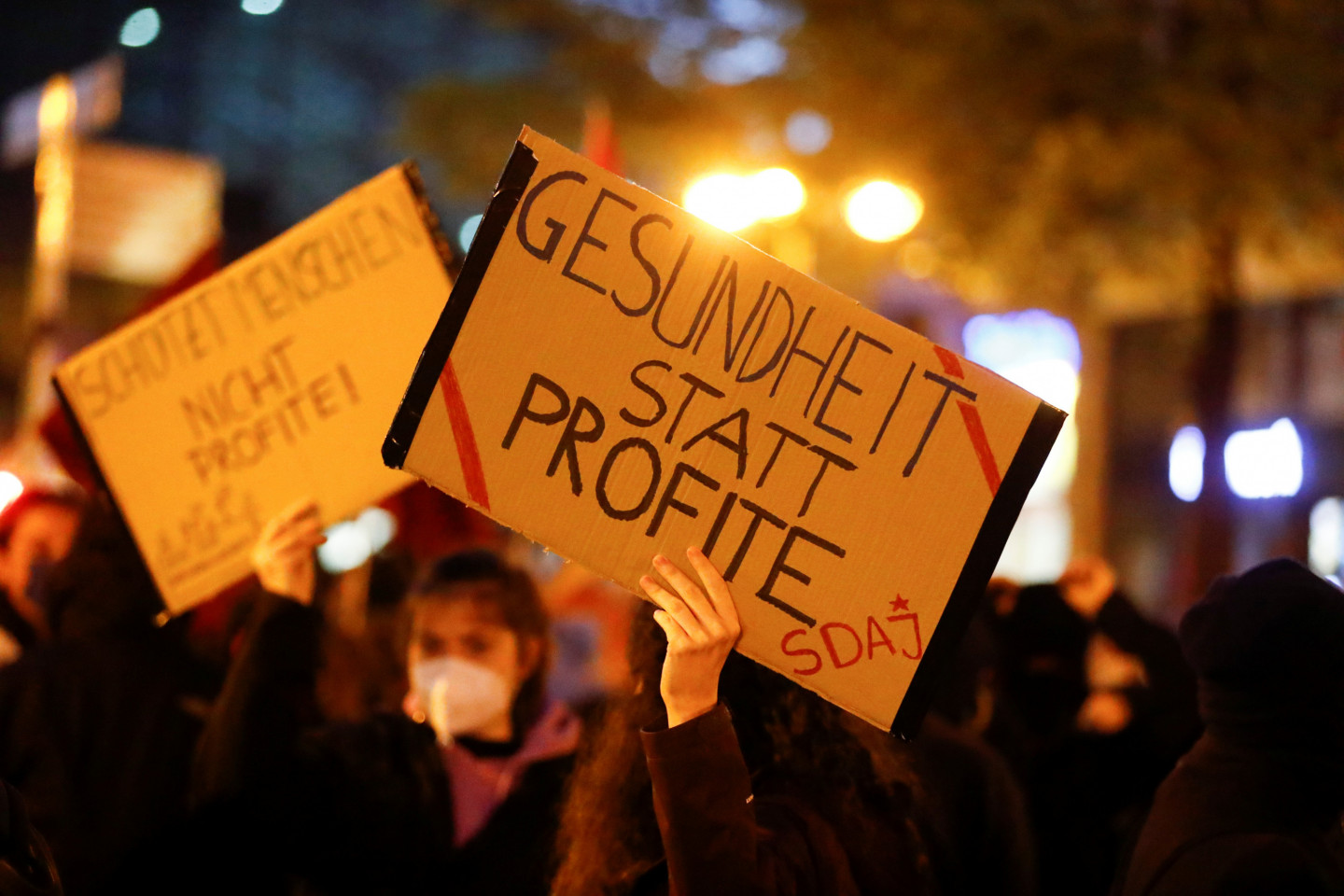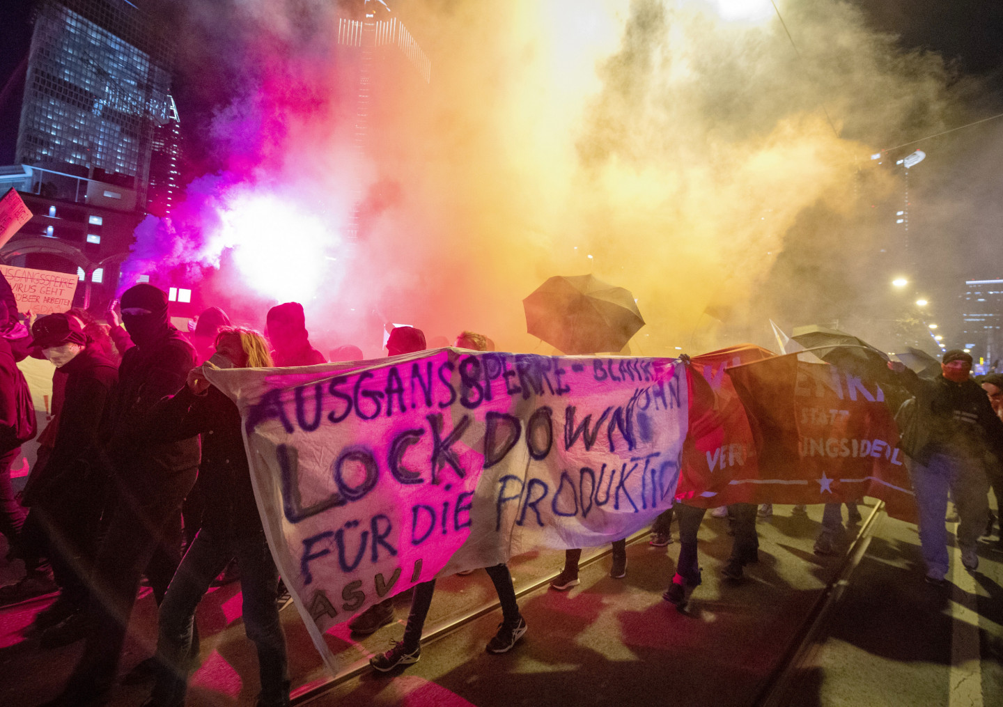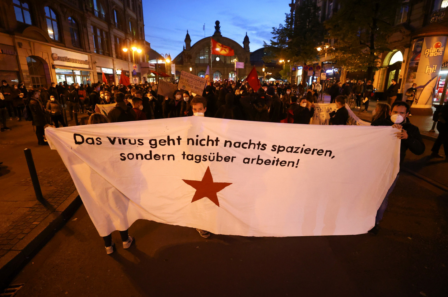 Sestdienas vakarā demonstranti izgājuši vairāku Vācijas pilsētu ielās, protestējot pret komandantstundu naktīs. Frankfurtē aptuveni 300 cilvēku devās gājienā cauri pilsētas centram, nesot plakātus ar protesta vēstījumiem. Daži aizdedzināja petardes, kas radīja daudz dūmu. Aptuveni 100 cilvēki piedalījās protestā Hannoverē. Berlīnē sapulcējās 20 līdz 30 riteņbraucēji uz protesta braucienu pēc sociālajos medijos publicēta aicinājuma. Policija paziņoja, ka demonstrācijas bijušas mierīgas. Vācija piektdien stājās spēkā likums par stingrā karantīnas režīma "avārijas bremzēm", kas ļauj ieviest ierobežojumus apvidos, kur ir augsts inficēšanās līmenis. "Avārijas bremzes" var tikt iedarbinātas apgabalos, kur nedēļas laikā reģistrēto inficēšanās gadījumu skaits uz 100 000 iedzīvotāju trīs dienas pēc kārtas pārsniedz 100. Pasākumu vidū ir nakts komandantstunda, vairuma veikalu slēgšana, ierobežojumi tikties tikai vienai mājsaimniecībai un vēl vienam cilvēkam, neskaitot par 14 gadiem jaunākus bērnus. Skolām būs jāatsakās no nodarbībām klātienē, ja inficēšanās līmenis pārsniegs 165. Bēres varēs apmeklēt ne vairāk kā 30 sērotāji. Daudzos valsts apgabalos inficēšanās līmenis jau šobrīd pārsniedz 100.