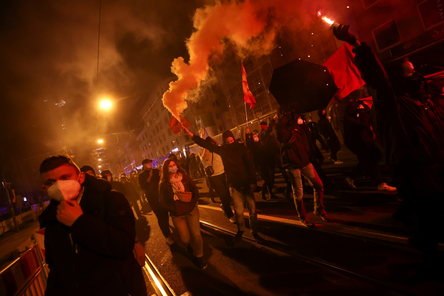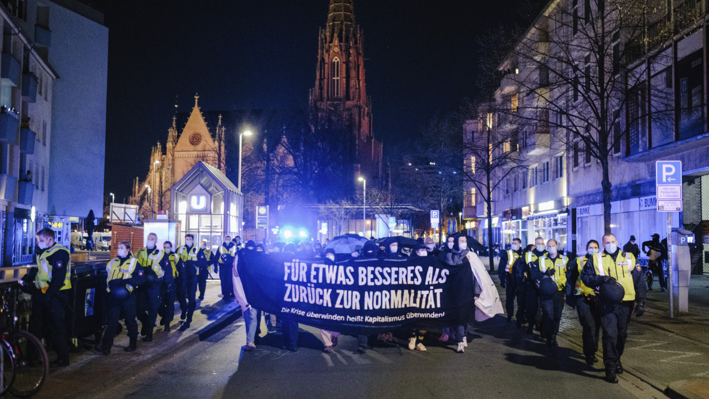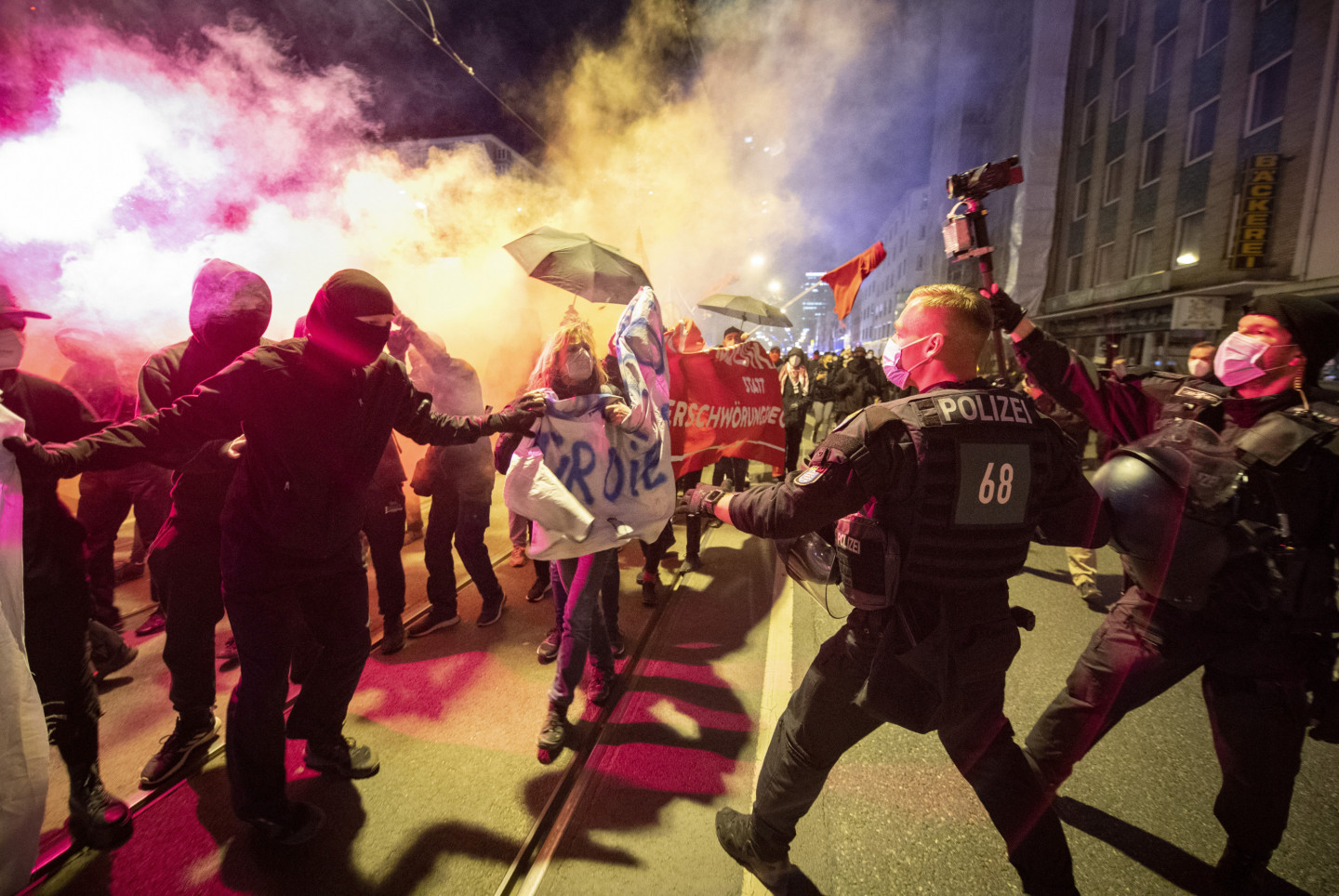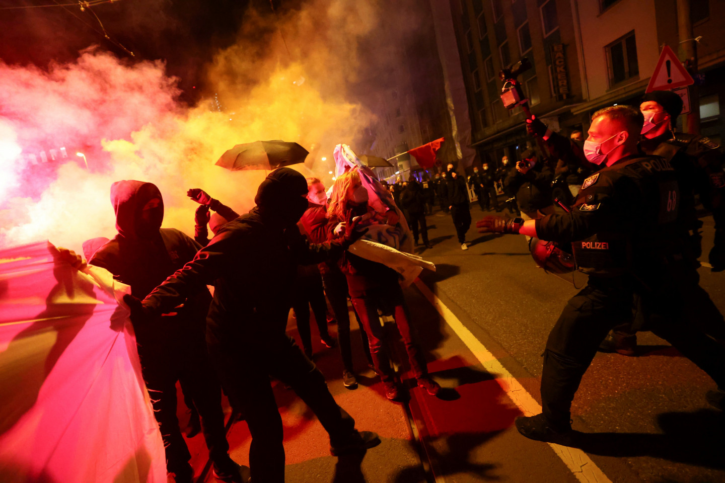 Sestdienas vakarā demonstranti izgājuši vairāku Vācijas pilsētu ielās, protestējot pret komandantstundu naktīs. Frankfurtē aptuveni 300 cilvēku devās gājienā cauri pilsētas centram, nesot plakātus ar protesta vēstījumiem. Daži aizdedzināja petardes, kas radīja daudz dūmu. Aptuveni 100 cilvēki piedalījās protestā Hannoverē. Berlīnē sapulcējās 20 līdz 30 riteņbraucēji uz protesta braucienu pēc sociālajos medijos publicēta aicinājuma. Policija paziņoja, ka demonstrācijas bijušas mierīgas. Vācija piektdien stājās spēkā likums par stingrā karantīnas režīma "avārijas bremzēm", kas ļauj ieviest ierobežojumus apvidos, kur ir augsts inficēšanās līmenis. "Avārijas bremzes" var tikt iedarbinātas apgabalos, kur nedēļas laikā reģistrēto inficēšanās gadījumu skaits uz 100 000 iedzīvotāju trīs dienas pēc kārtas pārsniedz 100. Pasākumu vidū ir nakts komandantstunda, vairuma veikalu slēgšana, ierobežojumi tikties tikai vienai mājsaimniecībai un vēl vienam cilvēkam, neskaitot par 14 gadiem jaunākus bērnus. Skolām būs jāatsakās no nodarbībām klātienē, ja inficēšanās līmenis pārsniegs 165. Bēres varēs apmeklēt ne vairāk kā 30 sērotāji. Daudzos valsts apgabalos inficēšanās līmenis jau šobrīd pārsniedz 100.