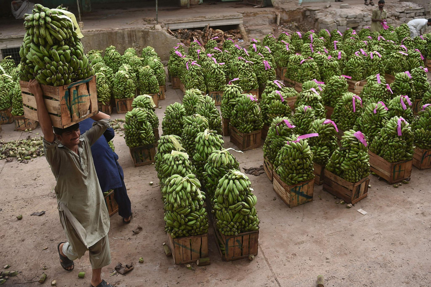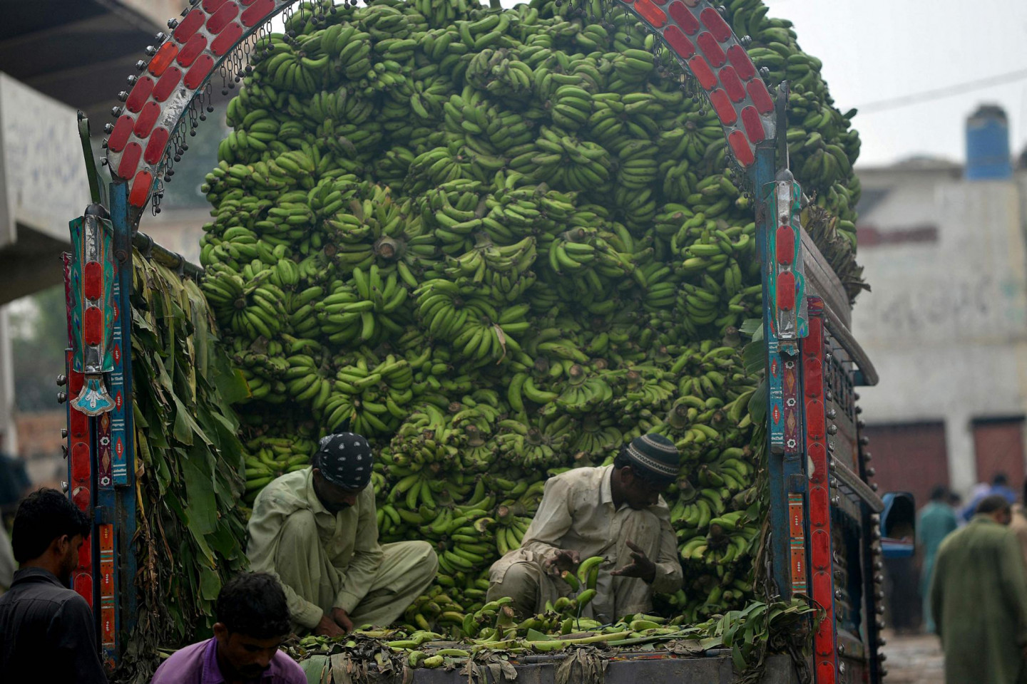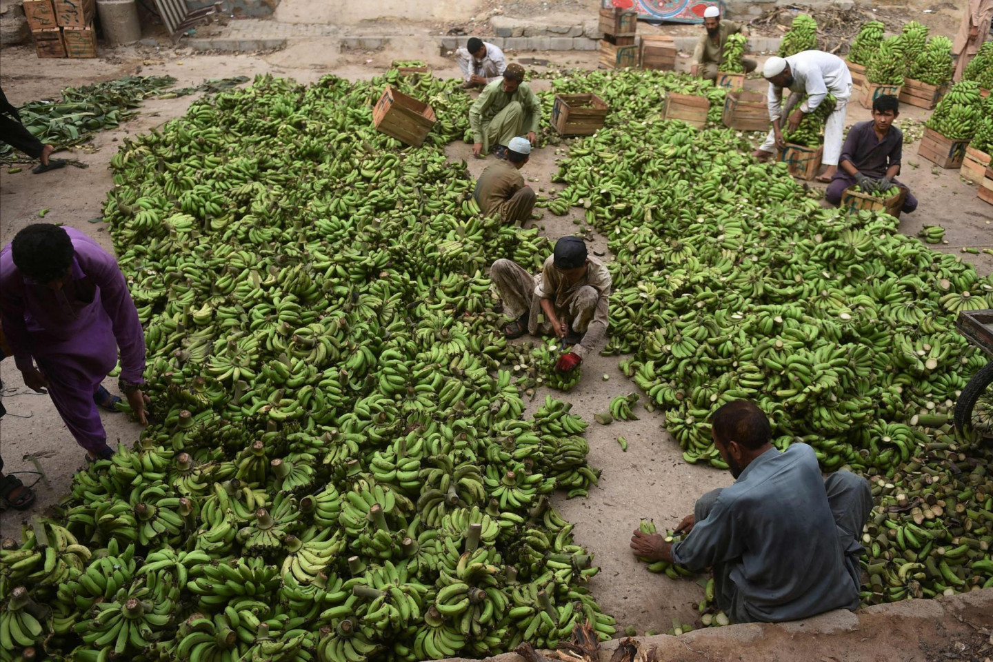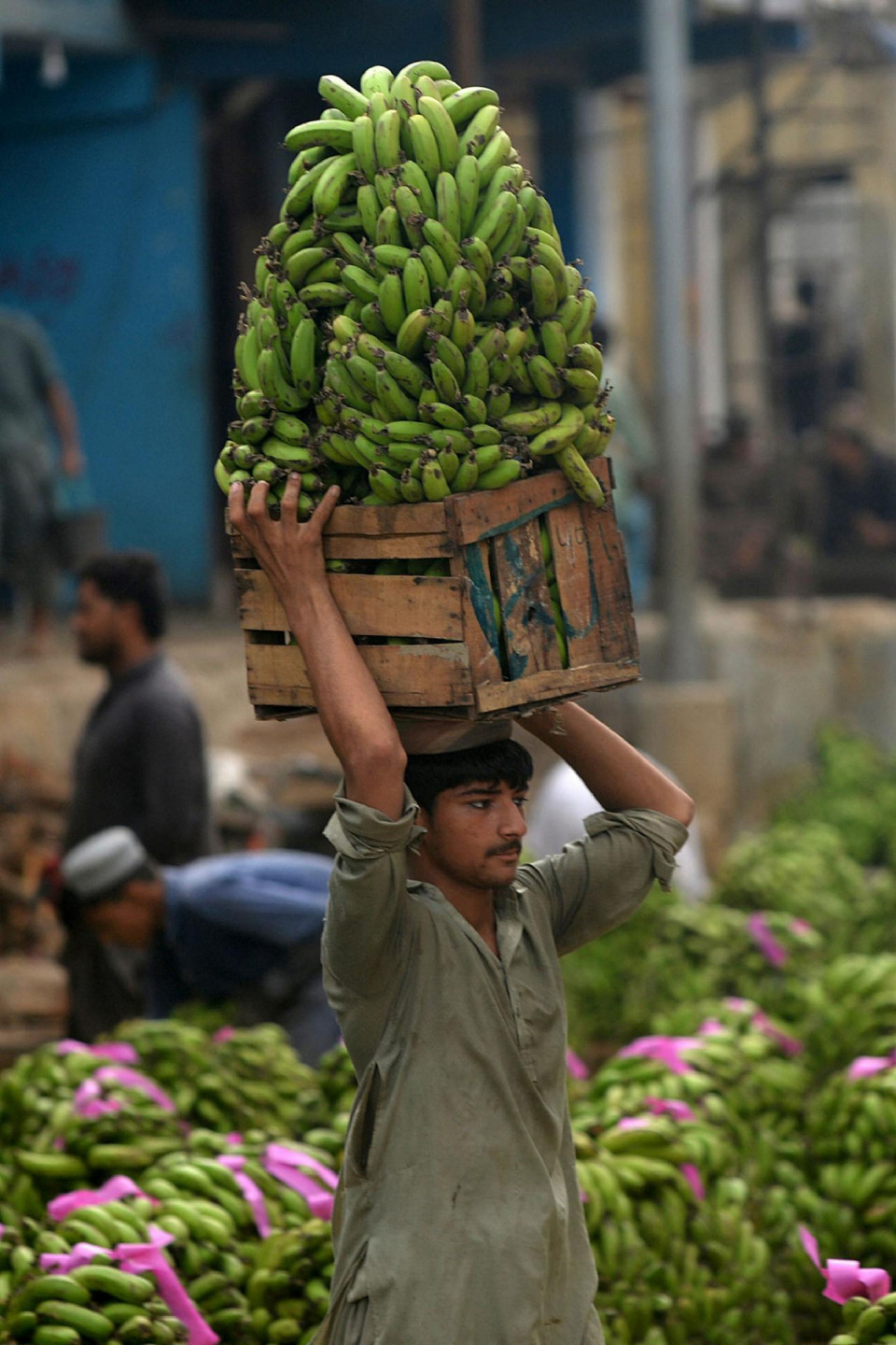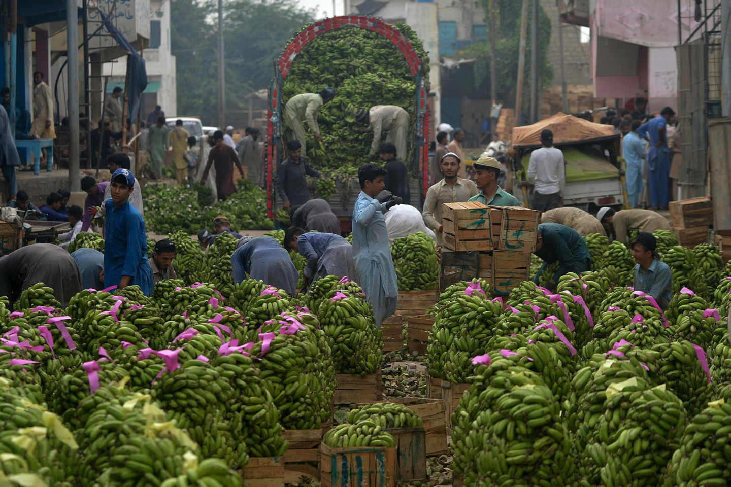 Pakistānas dienvidos esošājā Karanči pilsētā vietējie iedzīvotāji piegādājuši tirgum jaunu banānu kravu. Turpat pie tirgus noris banānu šķirošana un nogādāšana tirgotājiem. Dažādi augļi un rieksti ir viena no vislielākajām Pakistānas eksportējošajām precēm uz ārvalstīm.