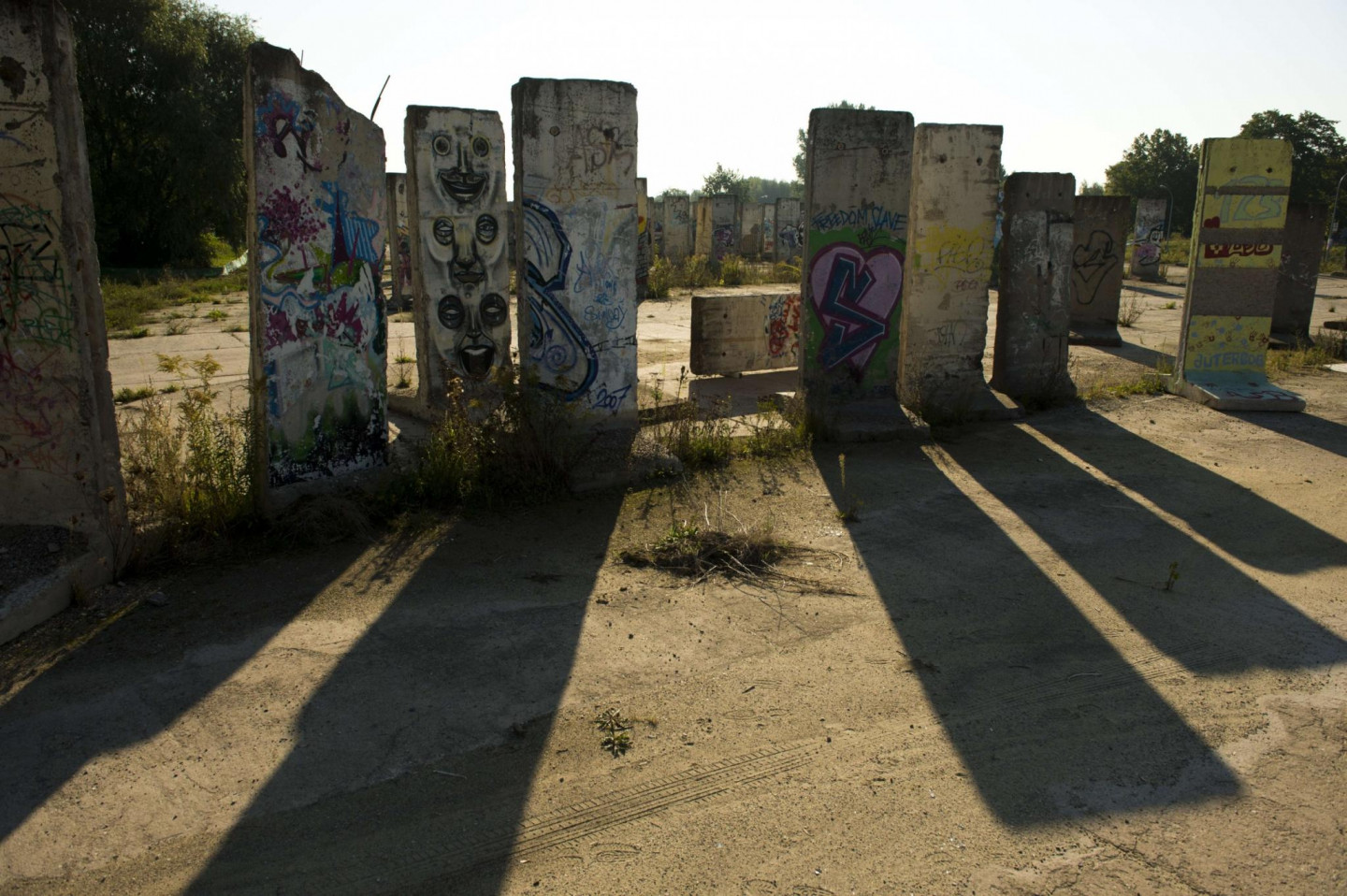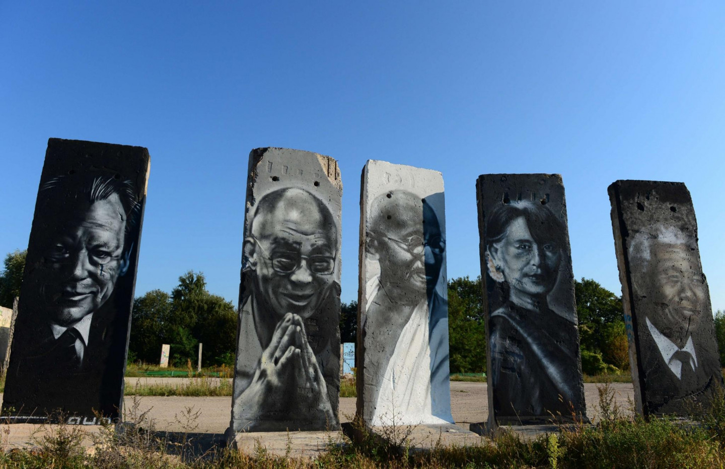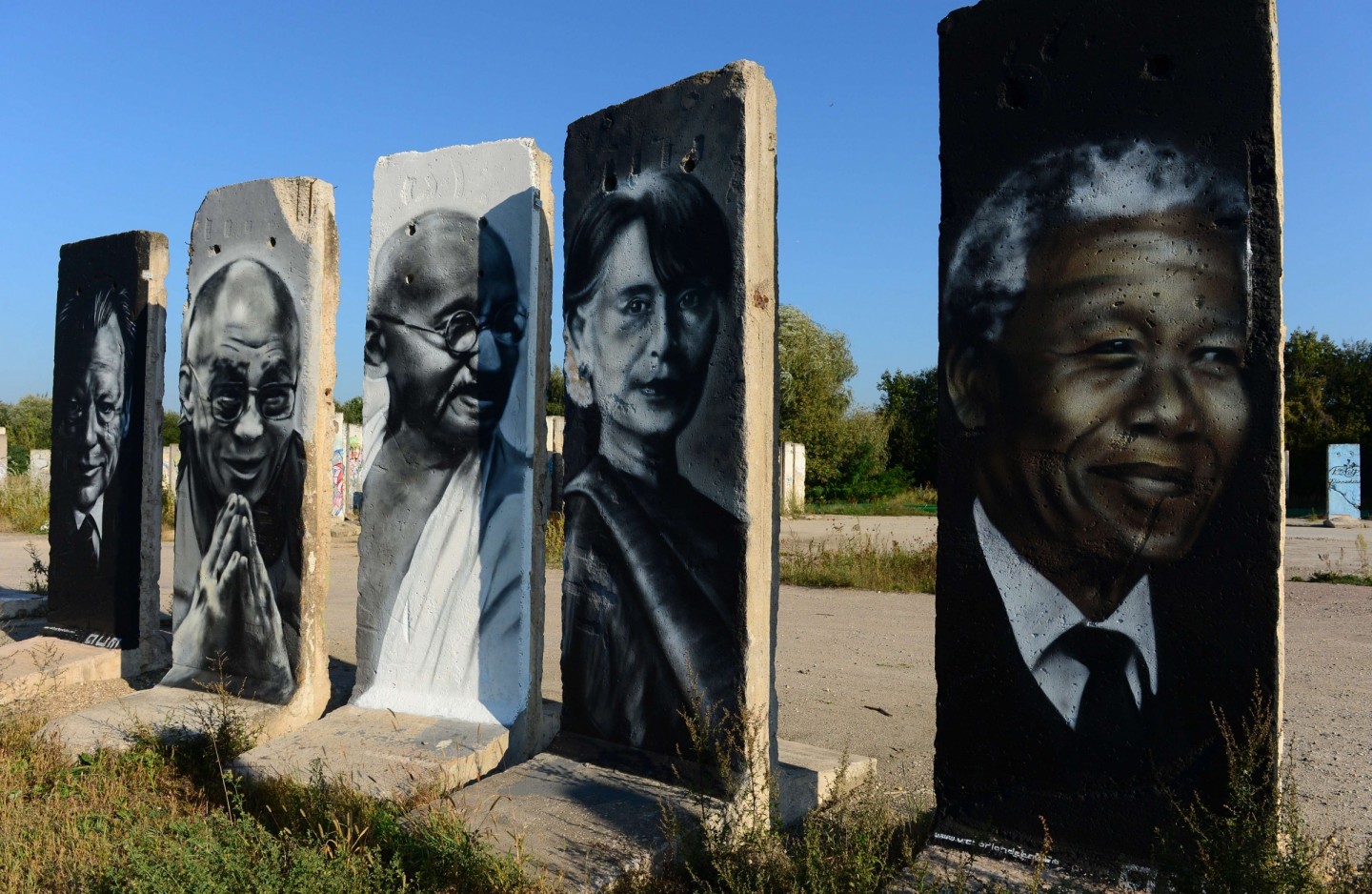 Berlīnes mūra fragmenti ar politiķa Villija Branta, Dalailamas, Mahatmas Gandija, Nelsona Mandelas portretiem izstādītas netālu no Berlīnes Teltovas līdzenumā.