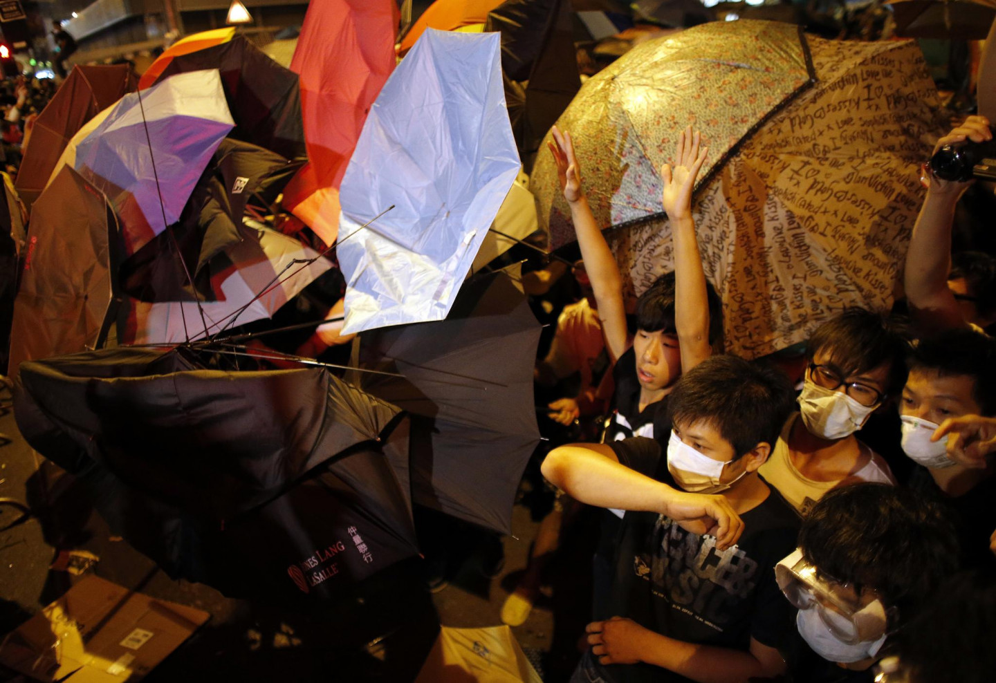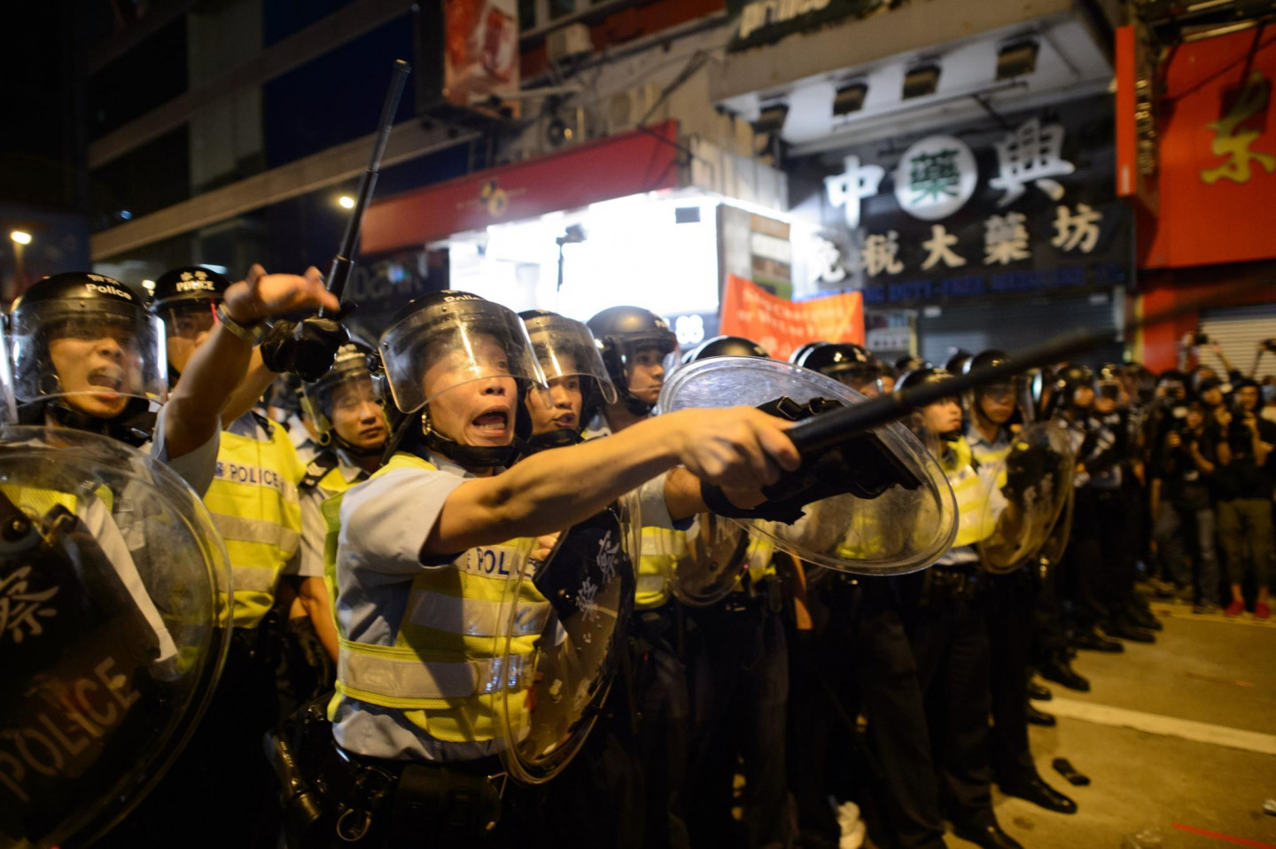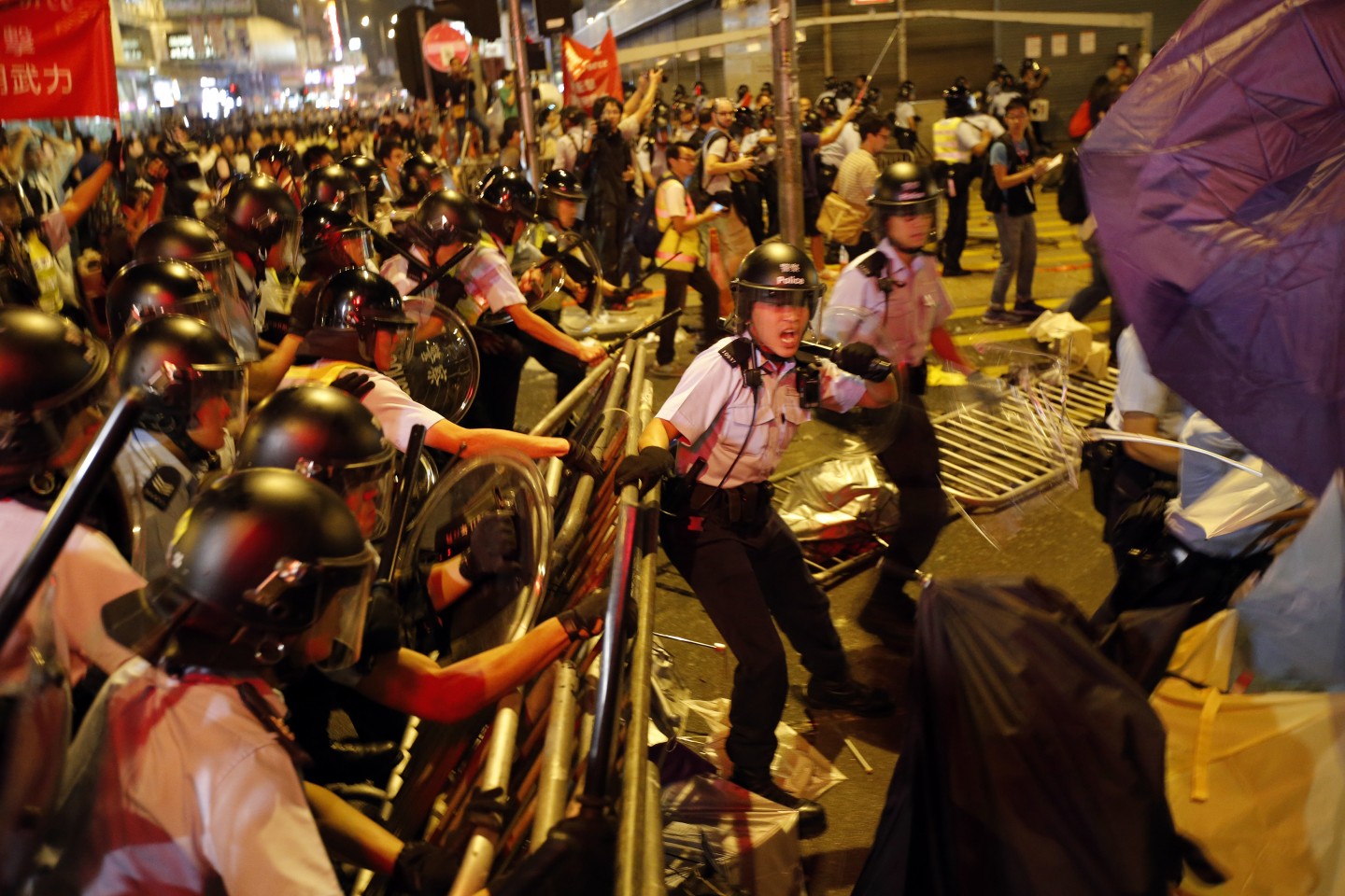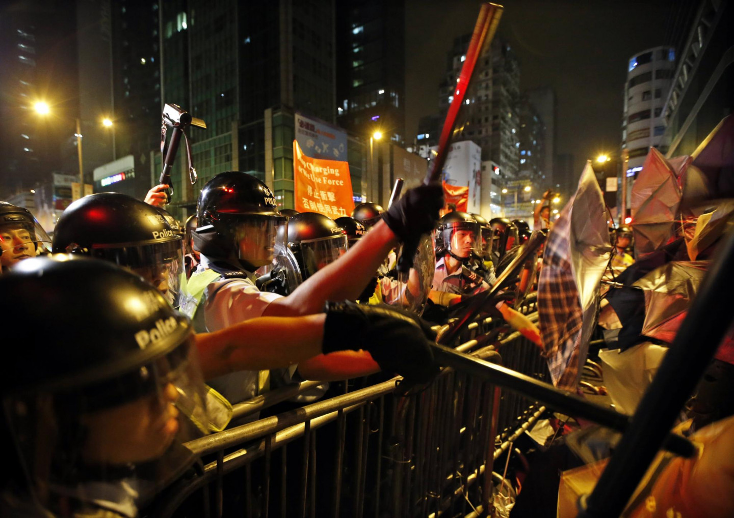 Honkongā sestdien turpinājās policijas sadursmes ar demonstrantiem, kuri no jauna ieņēma iepriekšējā dienā likvidēto protestētāju nometni. Policija pret protestētājiem pielietoja stekus un piparu gāzi. Demonstranti aizsargājās ar lietussargiem, taču pret rītausmu, viņiem nācās atkāpties.Šī bija jau trešā nakts pēc kārtas, kad starp protestētājiem un policistiem izceļas vardarbīgas sadursmes, kas apdraud iespējamās sarunas starp Honkongas varasiestādēm un studentu līderiem, kuri pieprasa demokrātisku vēlēšanu sarīkošanu 2017.gadā.