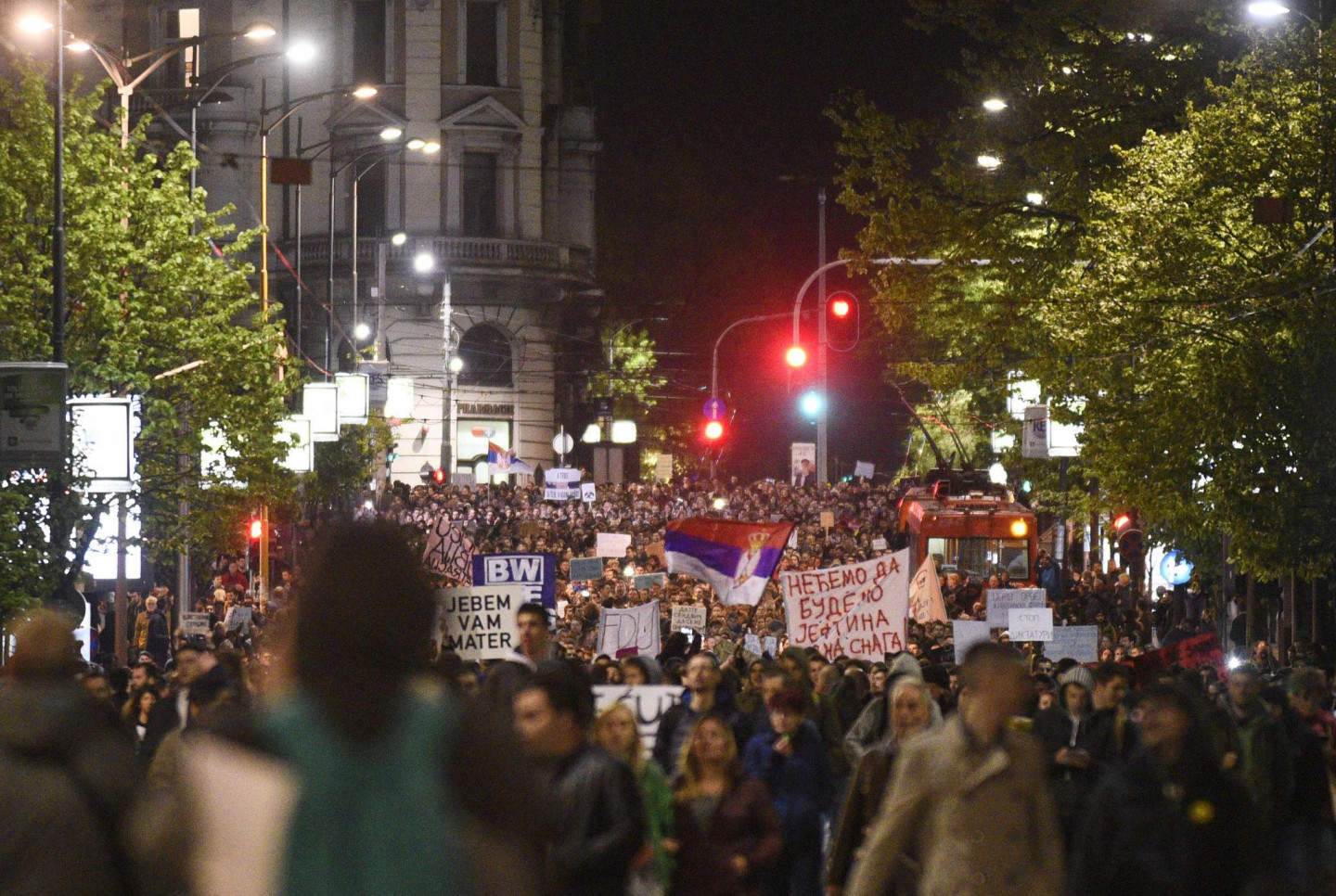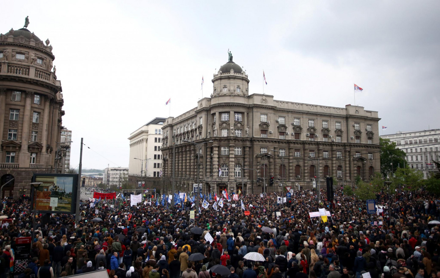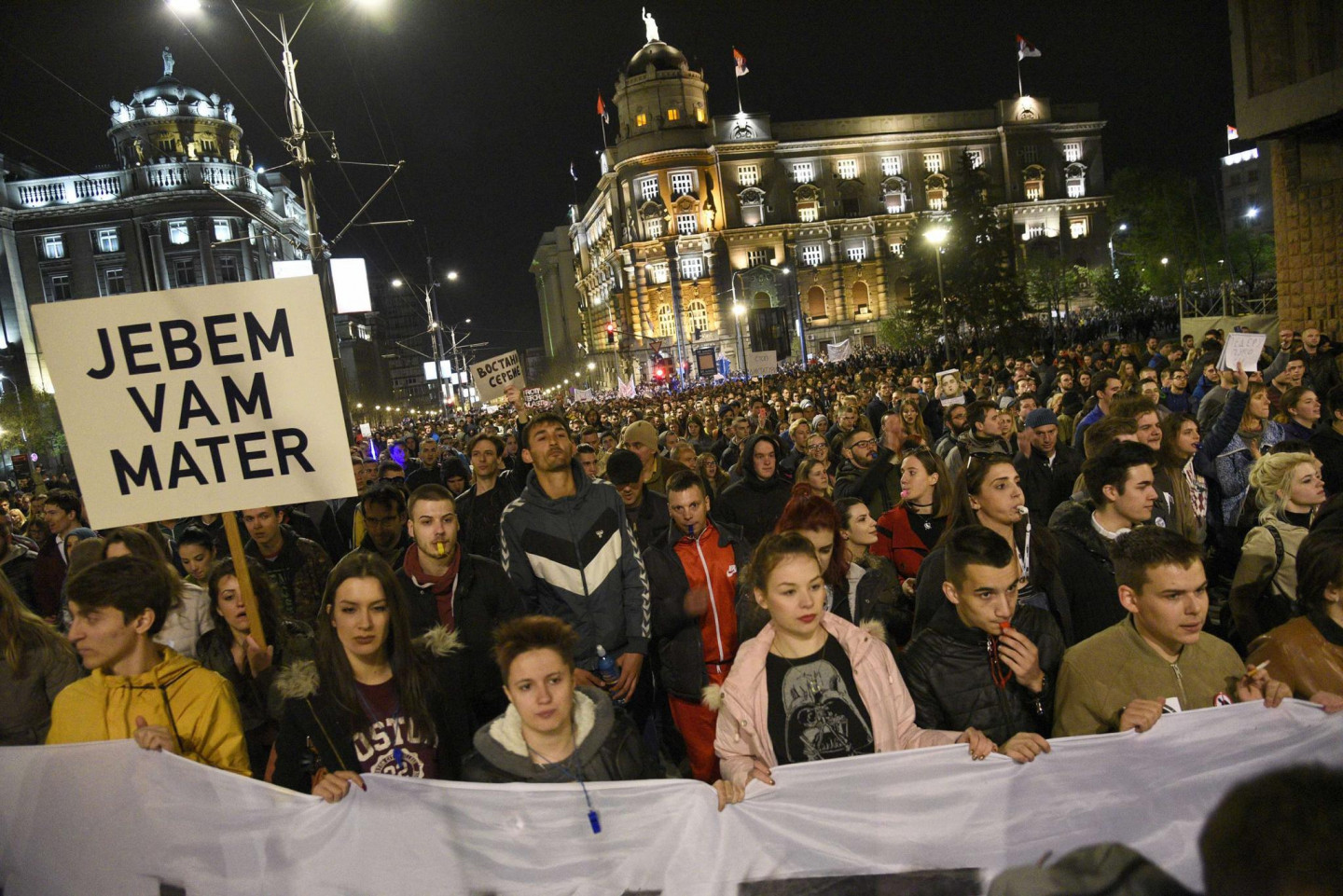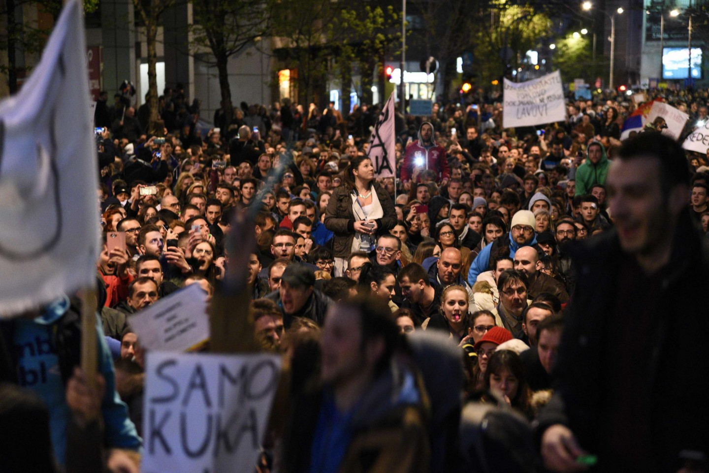 Belgradā sestdien ielās izgājuši vairāki tūkstoši cilvēku, turpinoties protestiem pret līdzšinējo premjerministru Aleksandru Vučiču, kurš pagājušajā nedēļā uzvarēja prezidenta vēlēšanās. Protesti pēc 2.aprīlī notikušajām vēlēšanām turpinās jau sesto dienu pēc kārtas. Opozīcija apgalvo, ka vēlēšanās pieļauts milzums pārkāpumu, tostarp mediju ietekmēšana, vēlētāju iebiedēšana un balsu pirkšana. Demonstrantiem Belgradā pievienojušies arī vairāki simti policistu un karavīru, kas pauž neapmierinātību ar zemajām algām un zemo dzīves līmeni. Kā ziņots, Vučičs jau pirmajā vēlēšanu kārtā ieguva 55% balsu, un tādējādi atkrita vajadzība rīkot otro balsošanas kārtu.