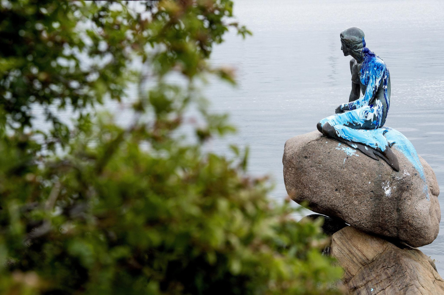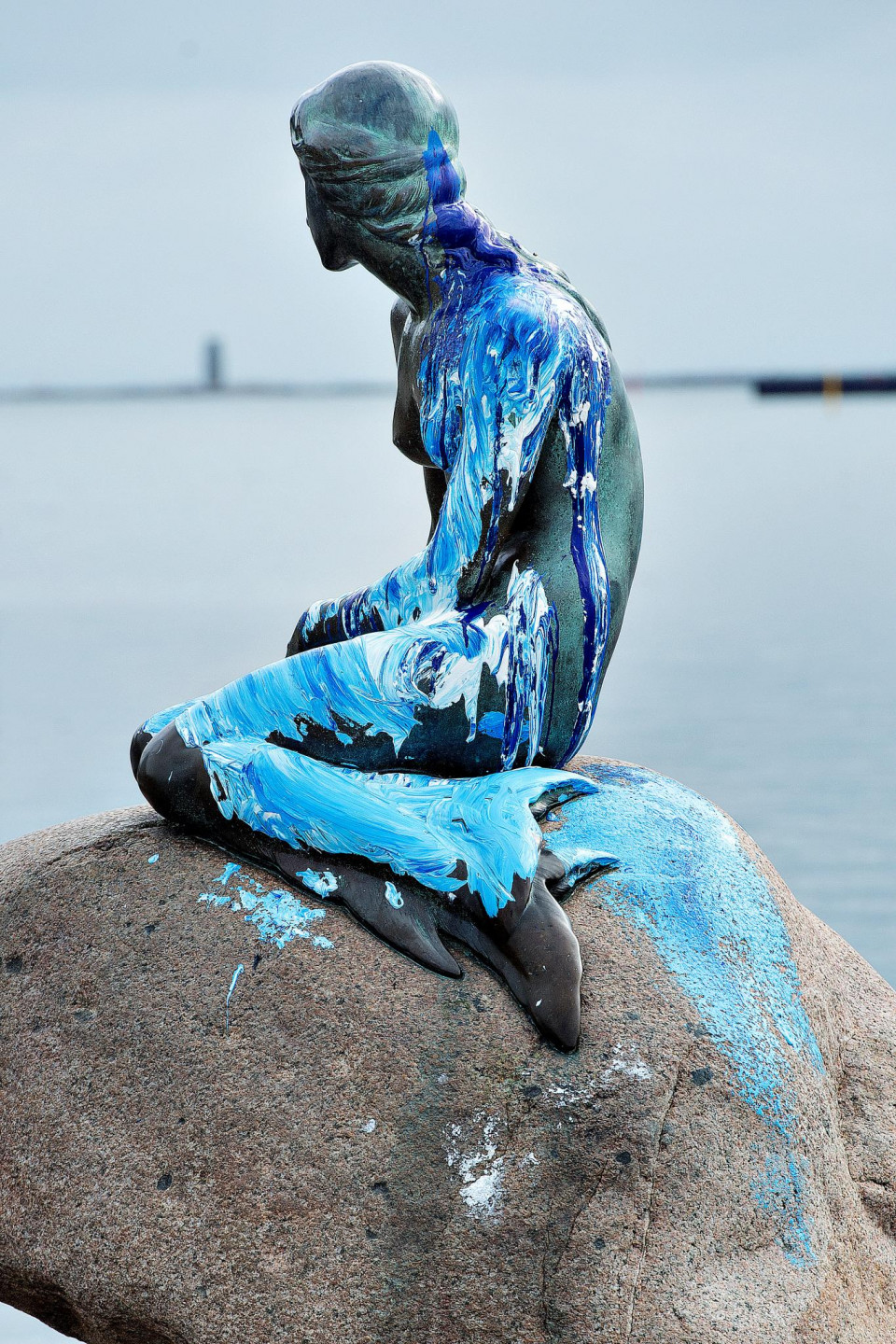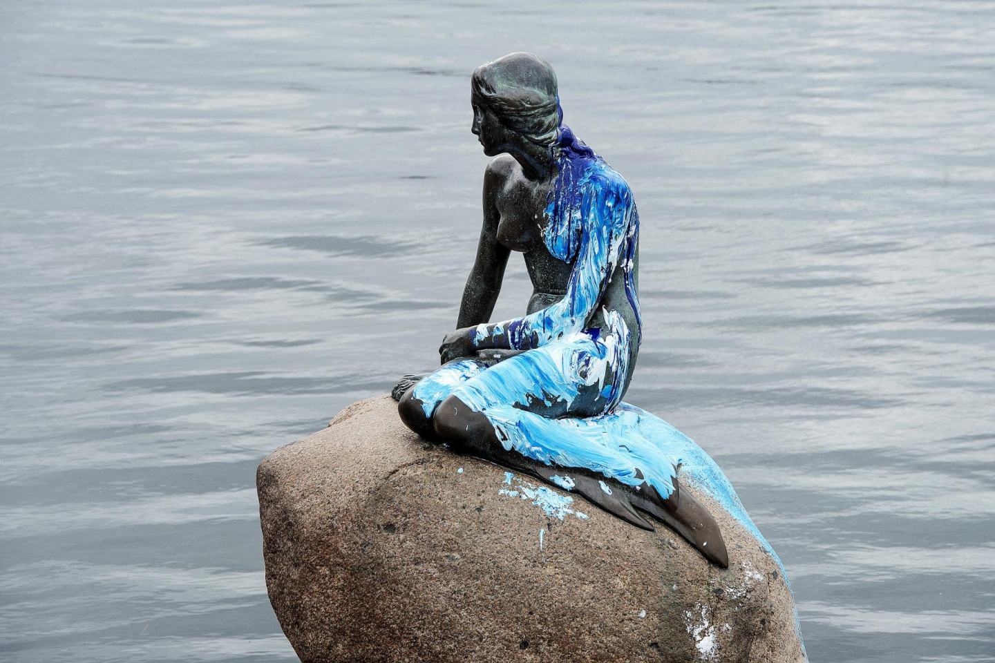 Slavenā dāņu Mazā nāriņa atkal cietusi no uzbrucējiem - kārtējo reizi aplieta ar krāsu. Iepriekš tā bija sarkanā krāsa, bet šoreiz zilie toņi.