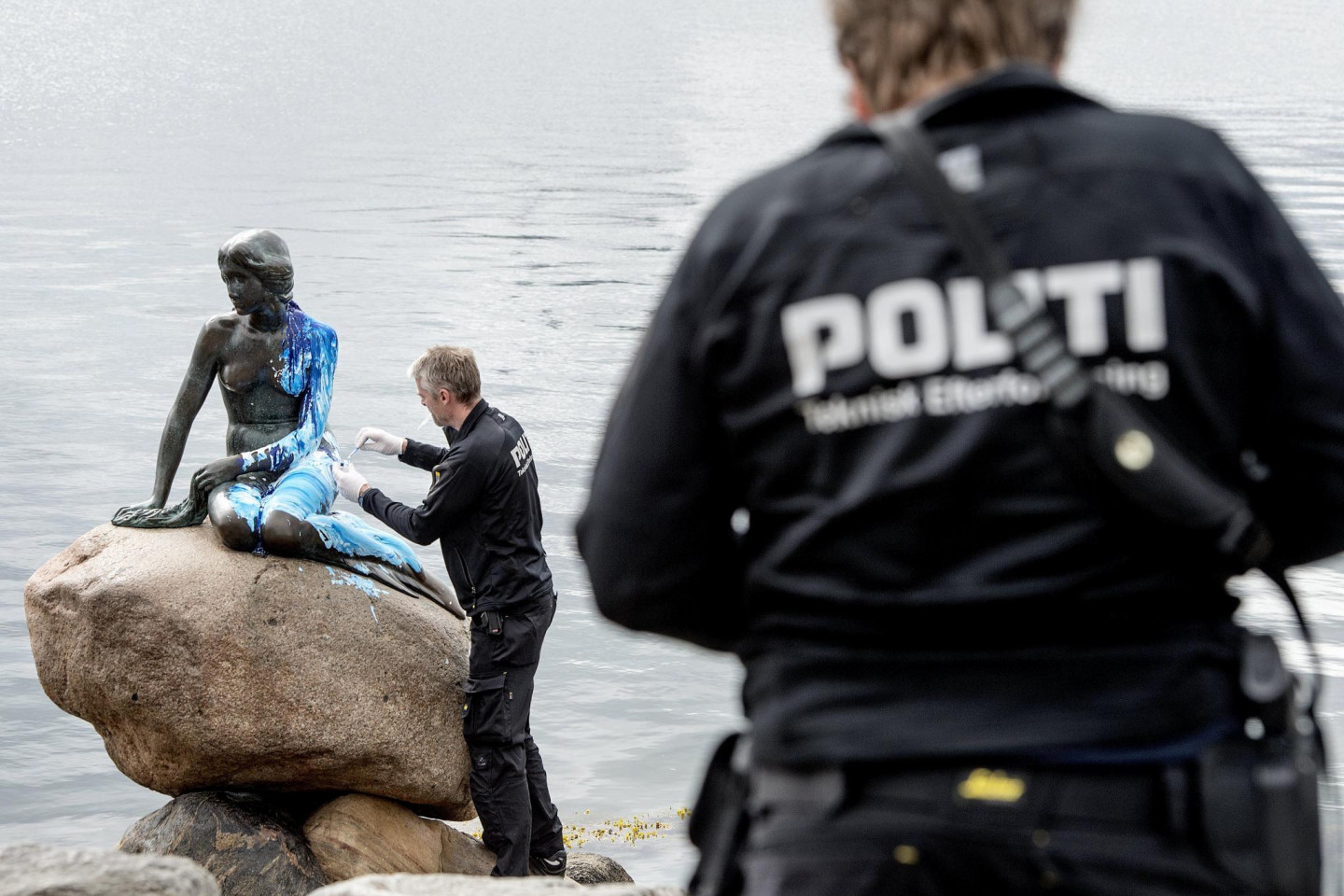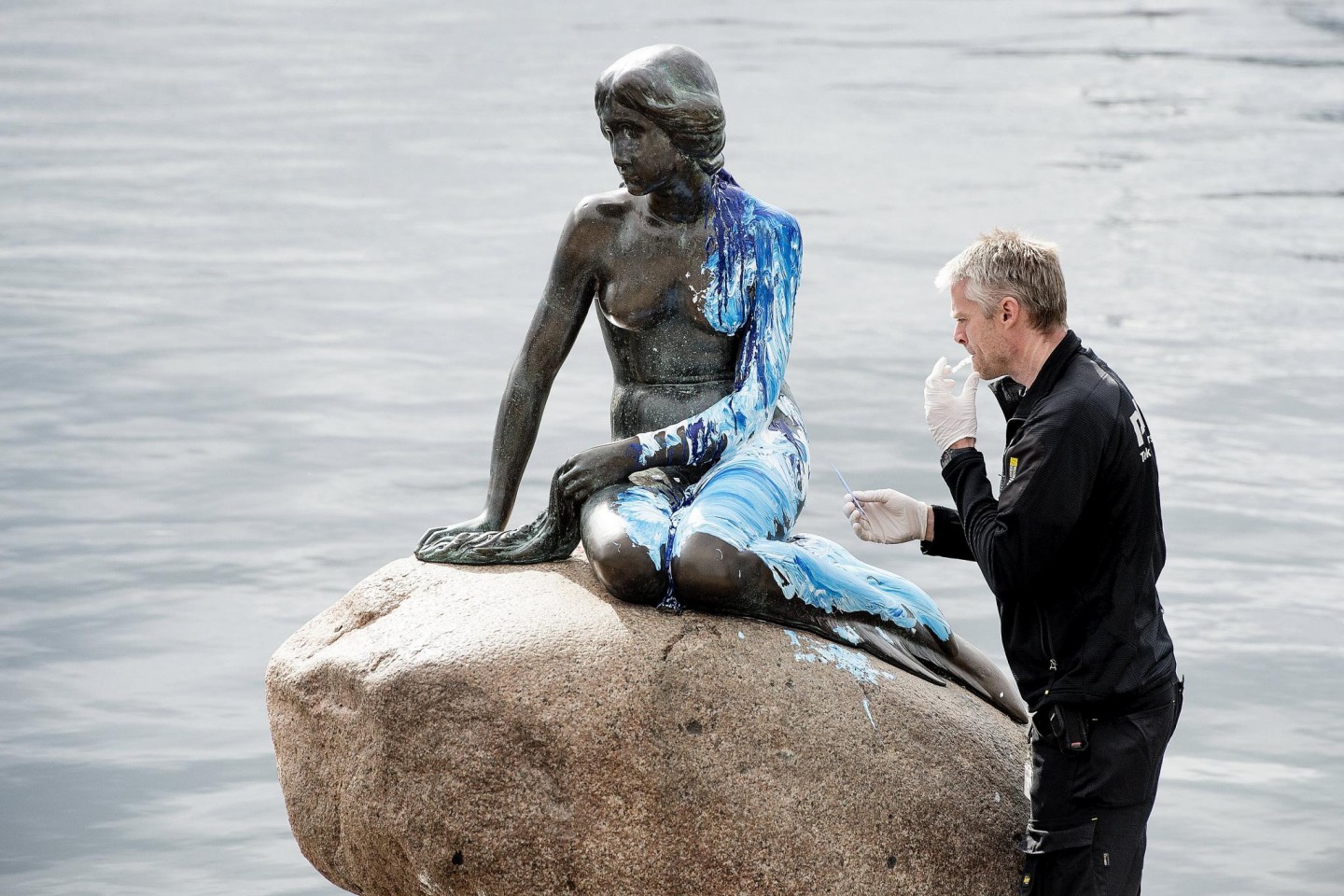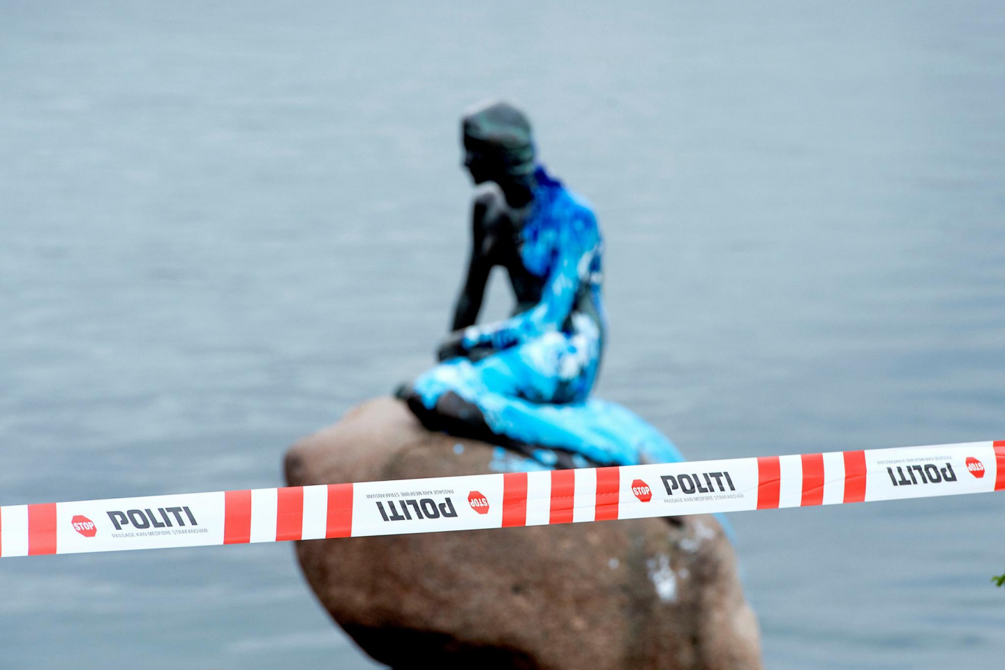 Slavenā dāņu Mazā nāriņa atkal cietusi no uzbrucējiem - kārtējo reizi aplieta ar krāsu. Iepriekš tā bija sarkanā krāsa, bet šoreiz zilie toņi.