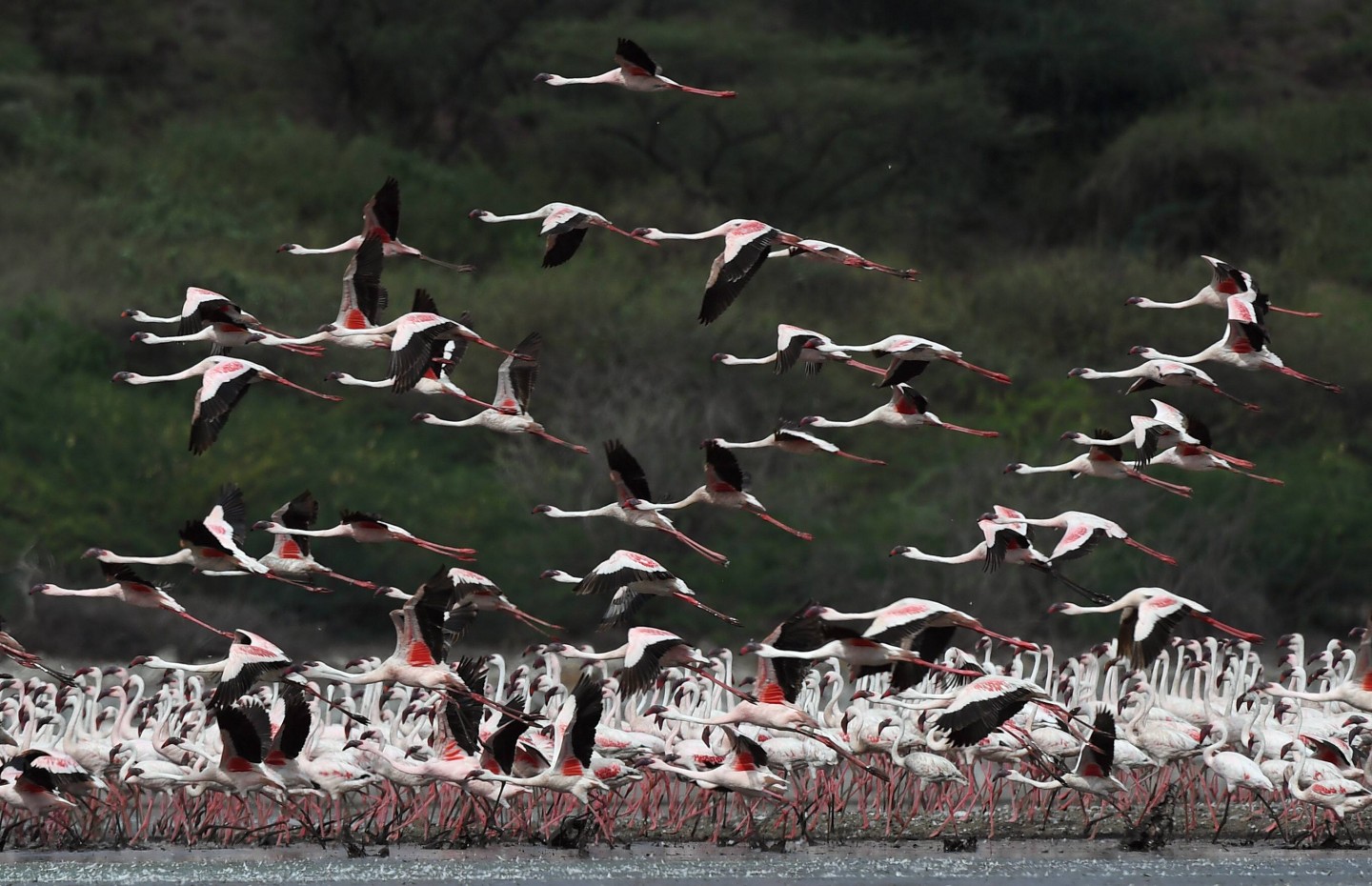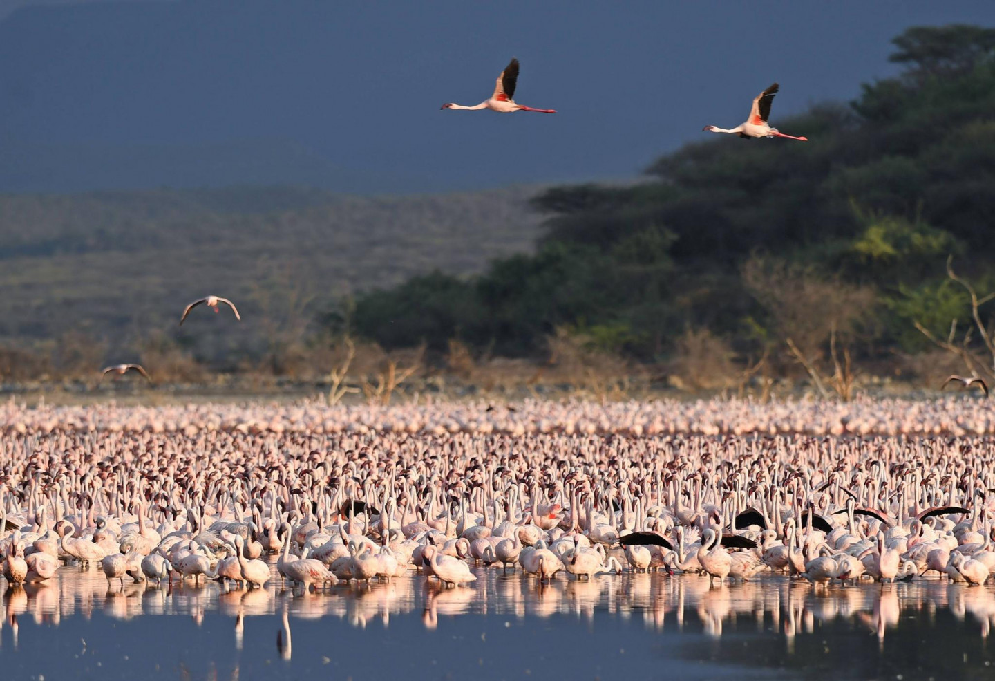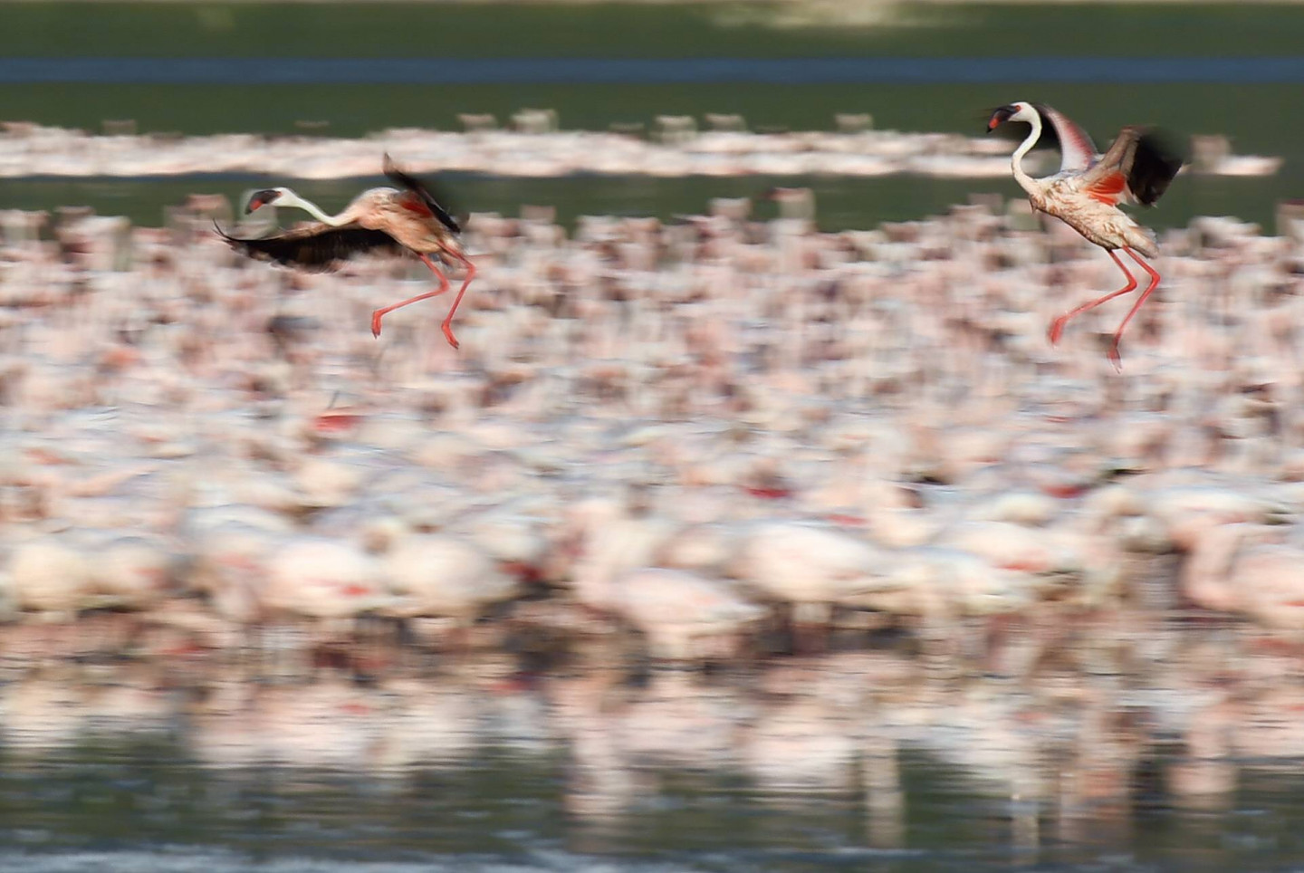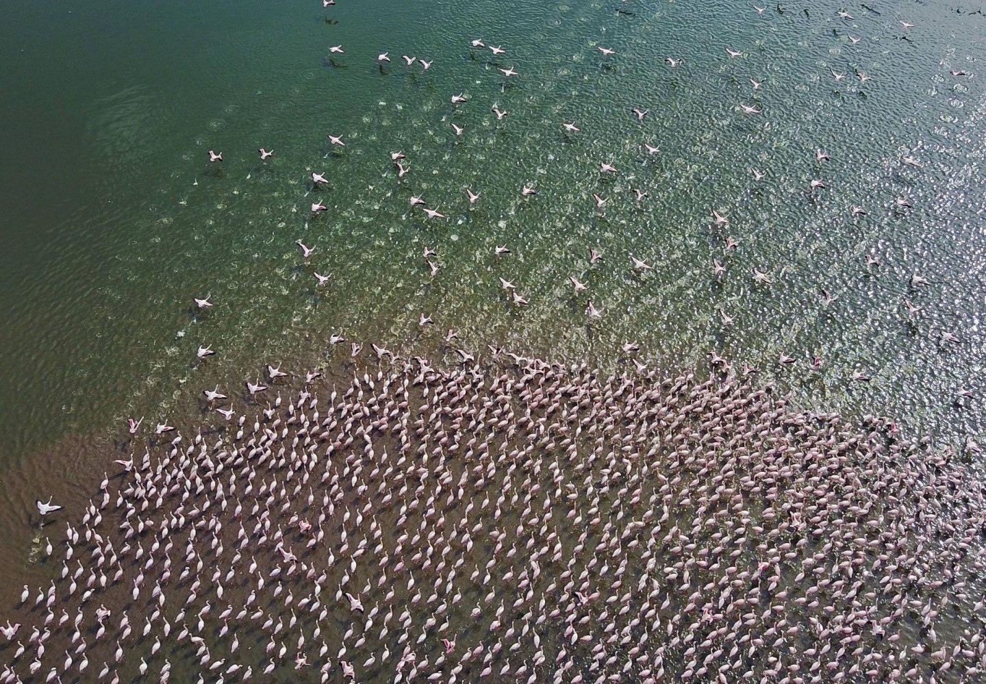 Ārvalstu fotogrāfiem izdevies iemūžināt fantastisku skatu- simtiem flamingo pulcējušies kādā ezerā Kenijā.