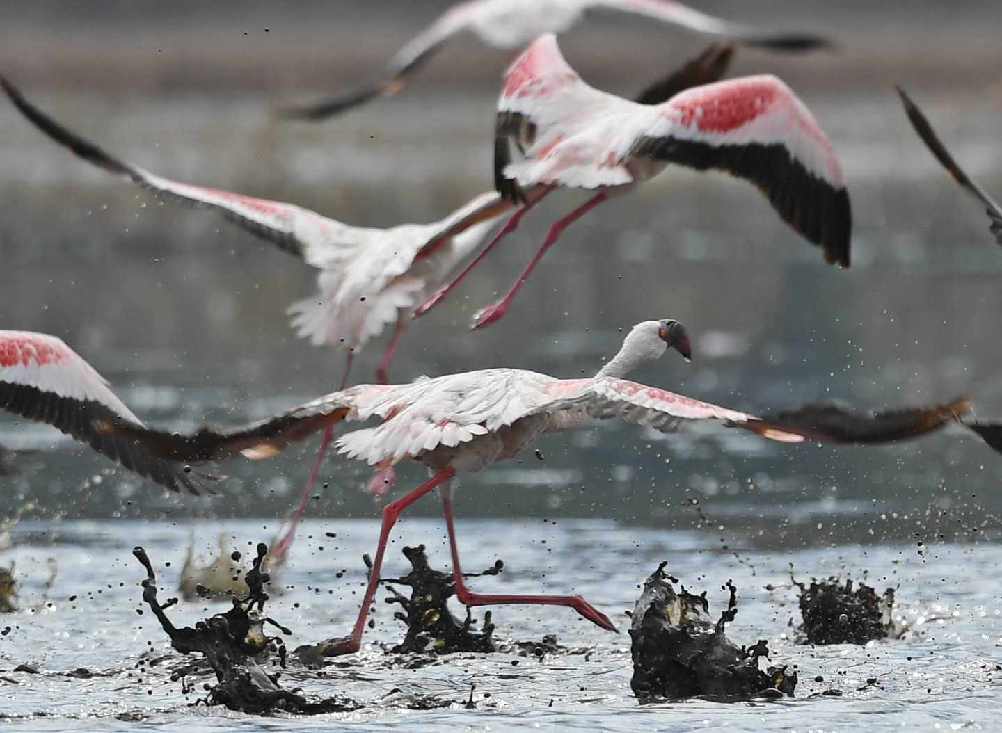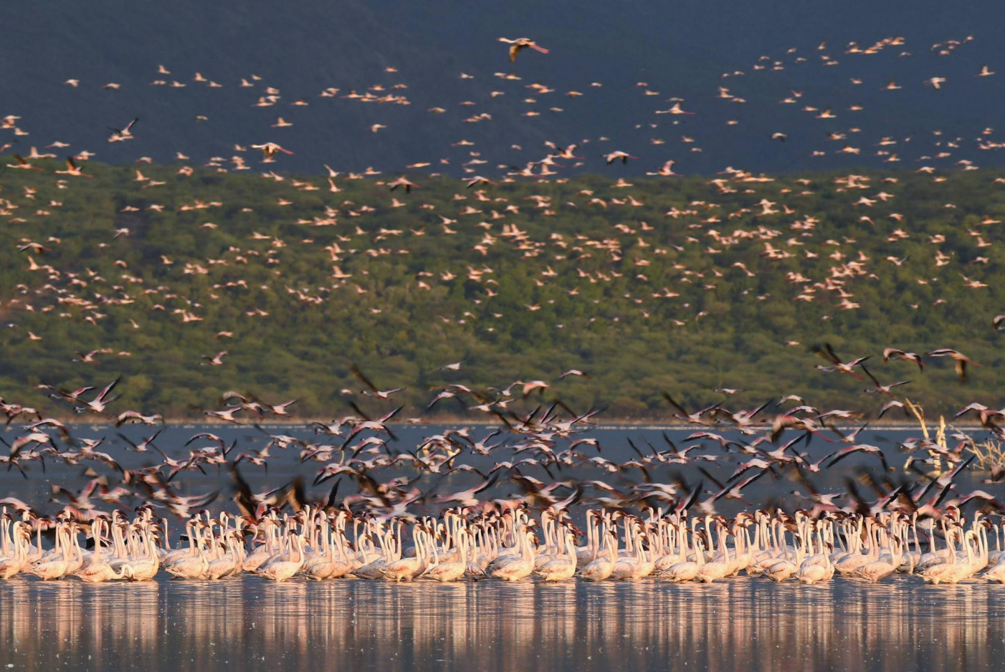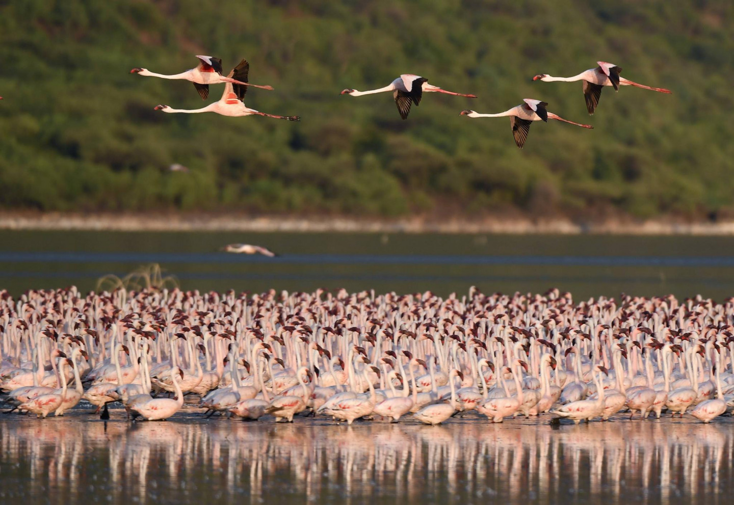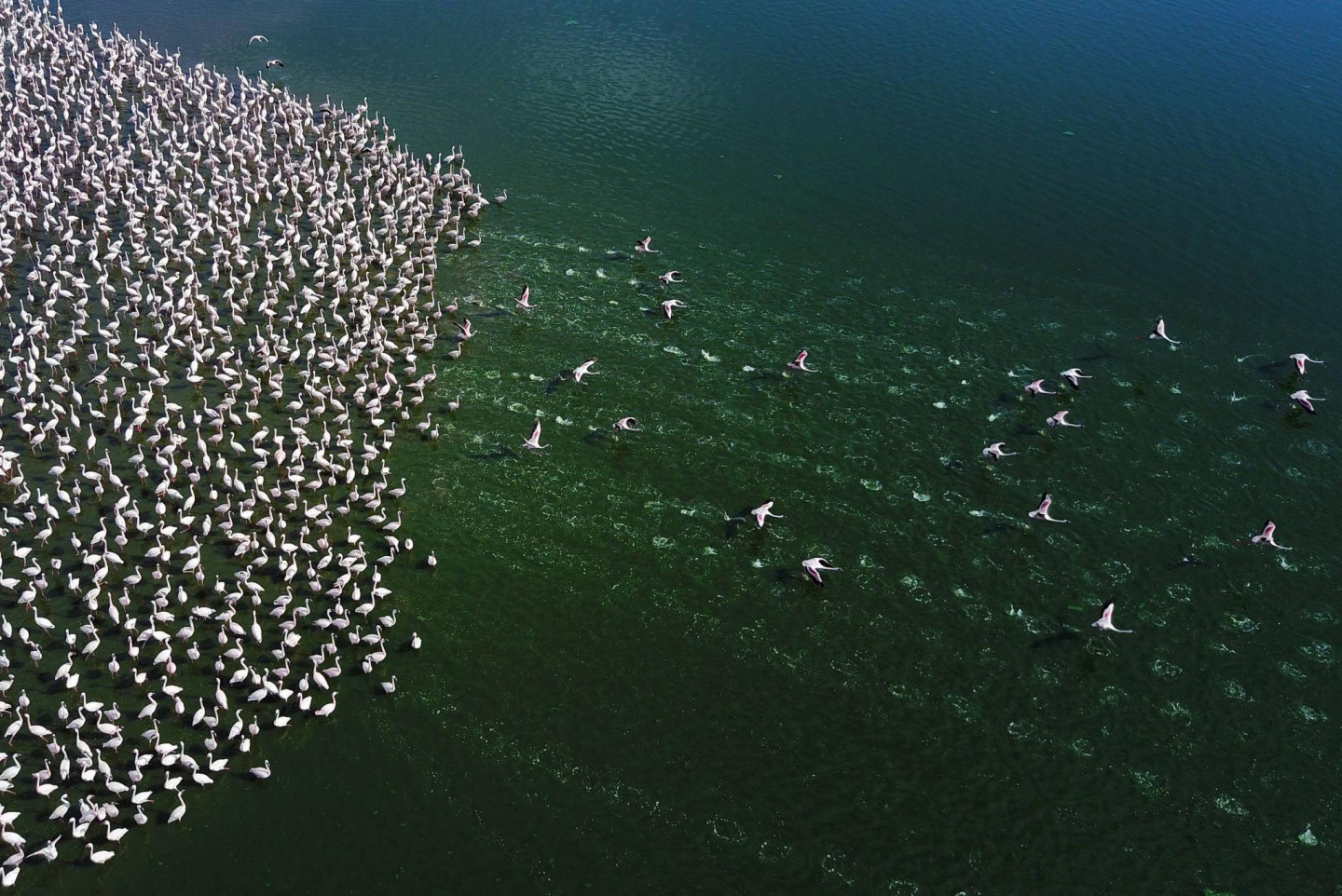 Ārvalstu fotogrāfiem izdevies iemūžināt fantastisku skatu- simtiem flamingo pulcējušies kādā ezerā Kenijā.
