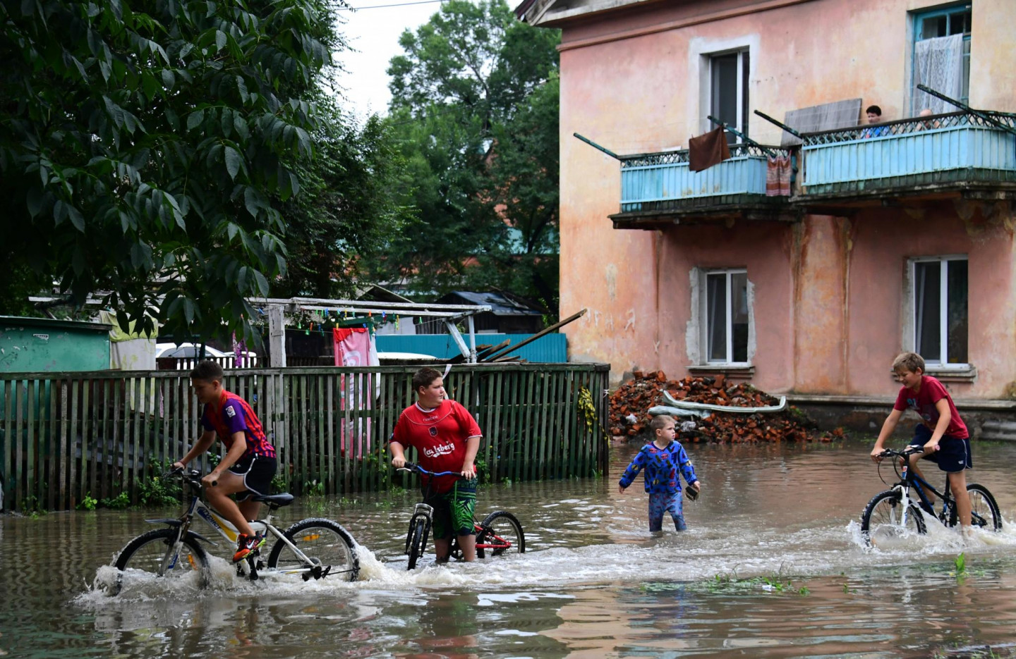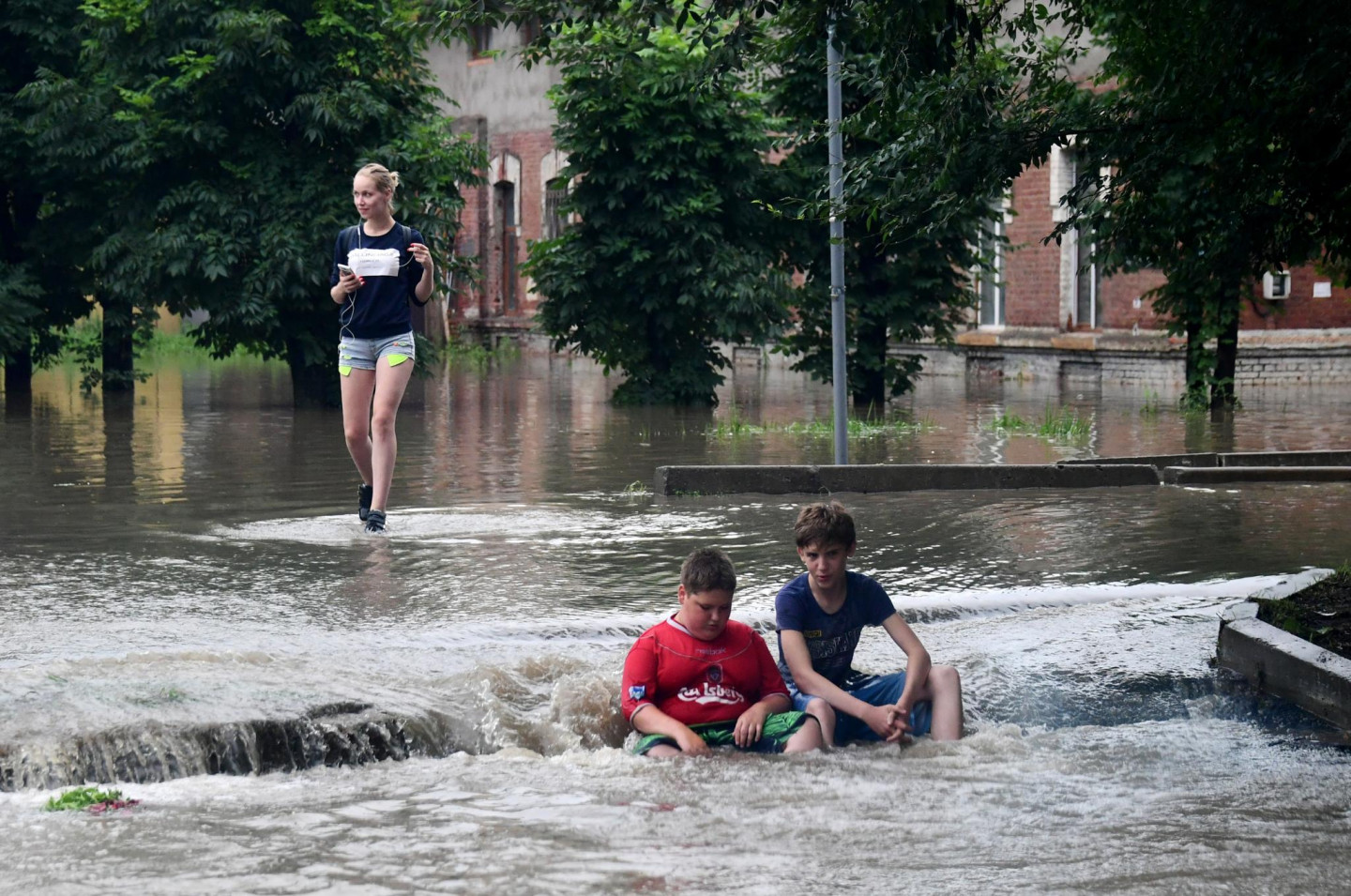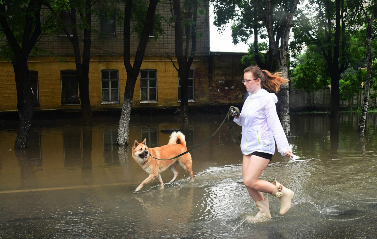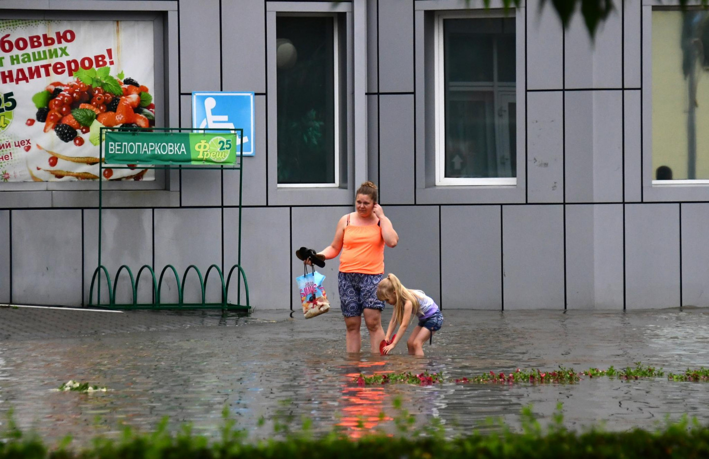 Krievijas austrumu daļā šodien piedzīvotas pamatīgas lietusgāzes, kā rezultātā ielas burtiski pārvērtušās par upēm.