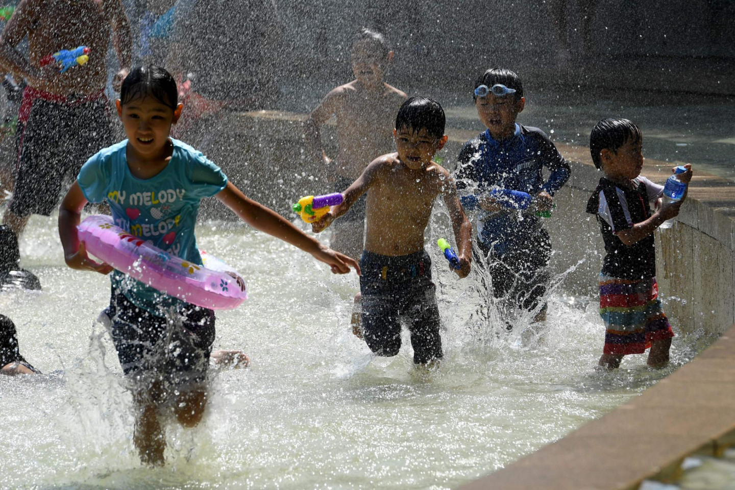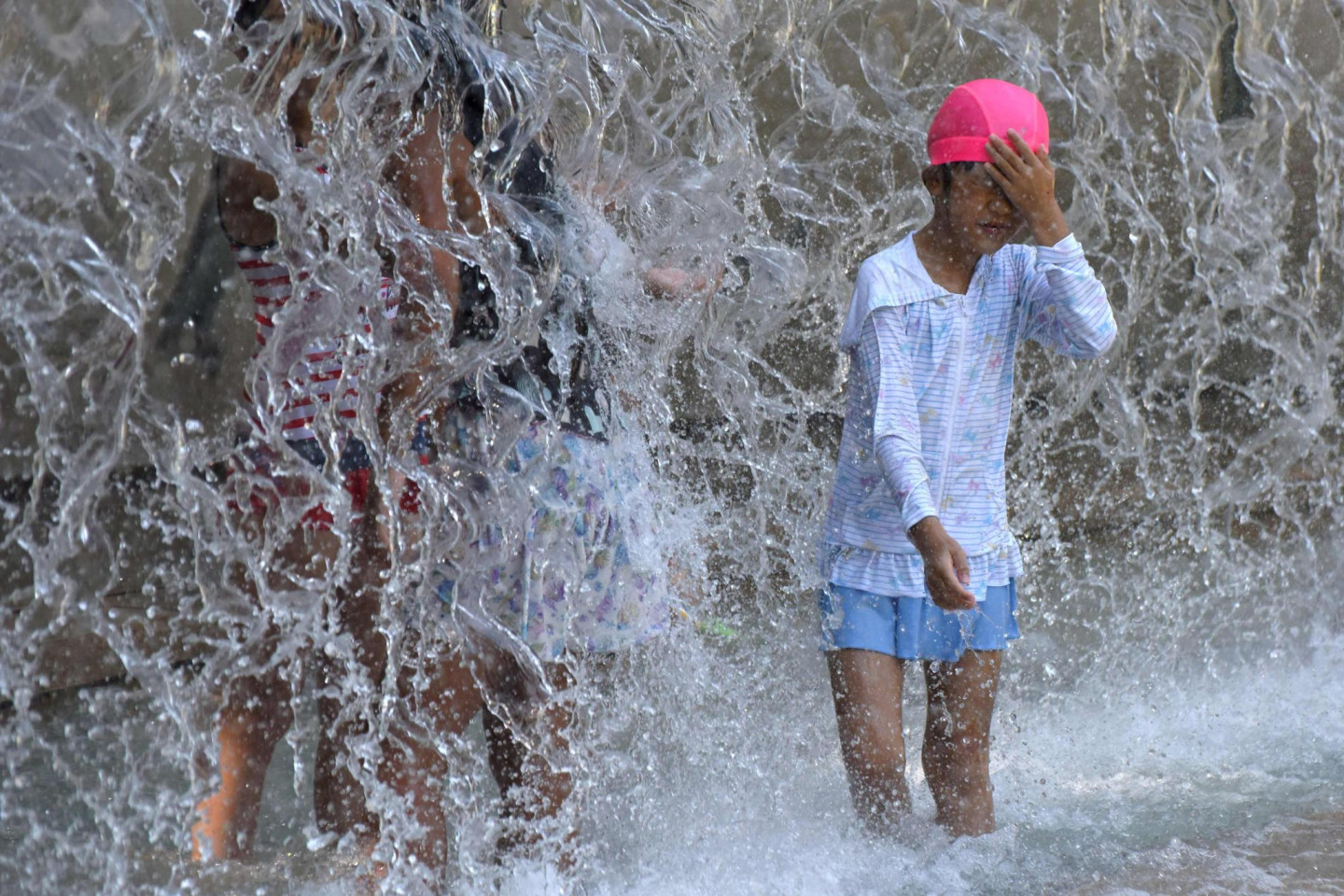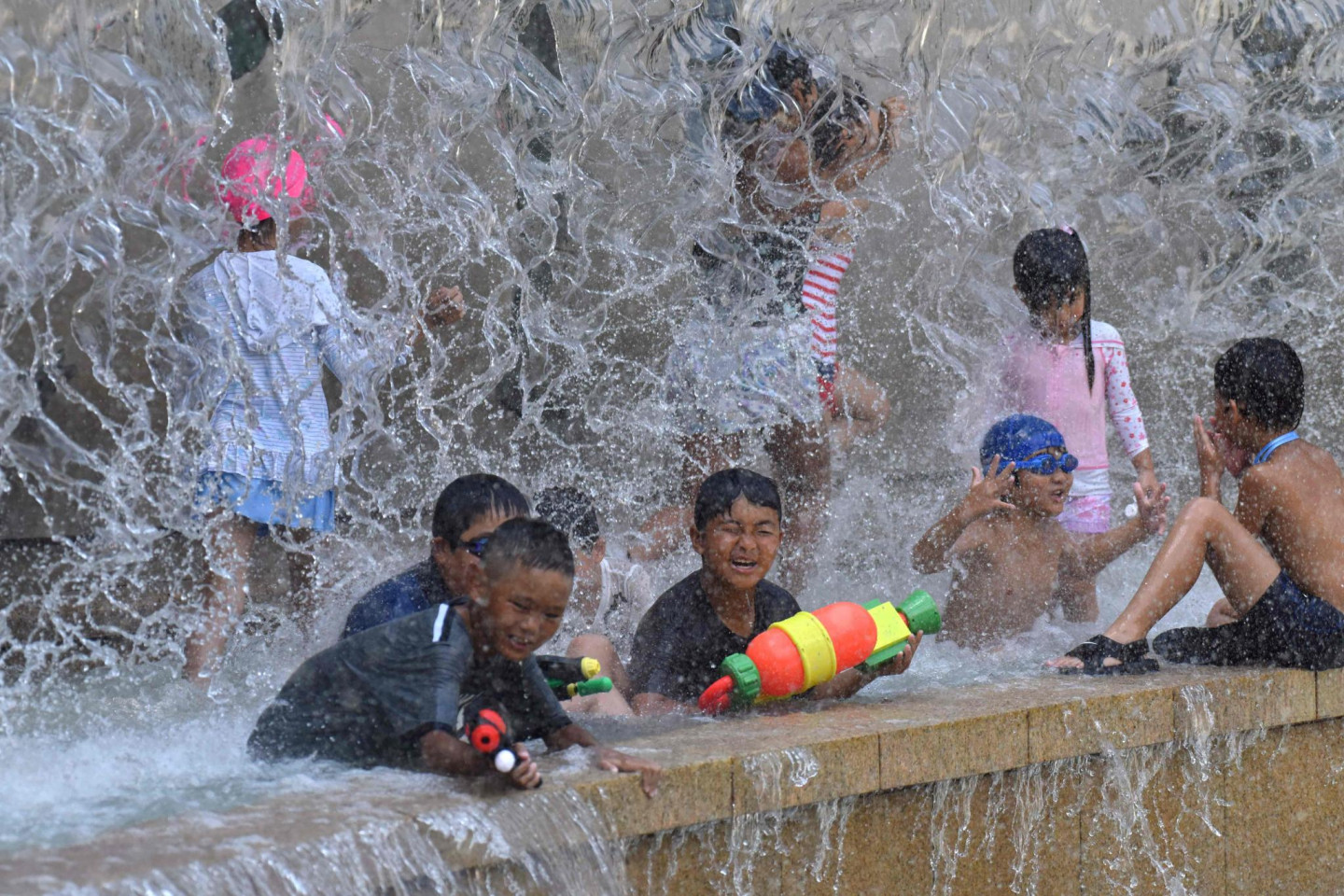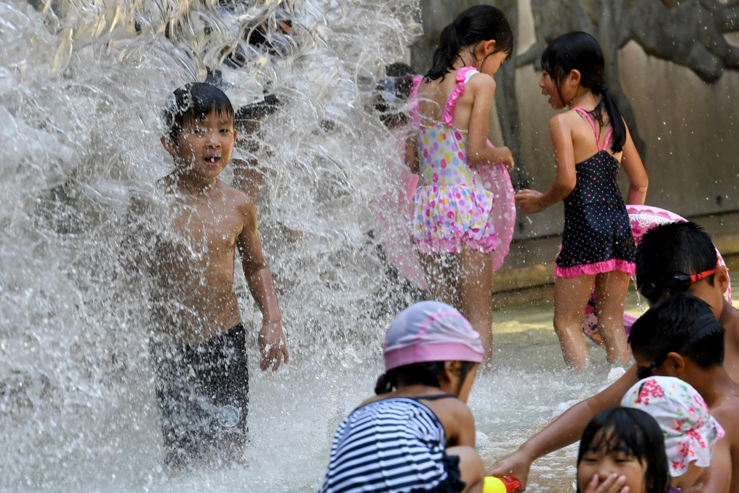 Pamatīga svelme valda arī atsevišķos Japānas reģionos. Piemēram, Tokijā bērni no karstuma veldzējas strūklakās.