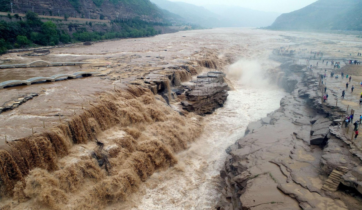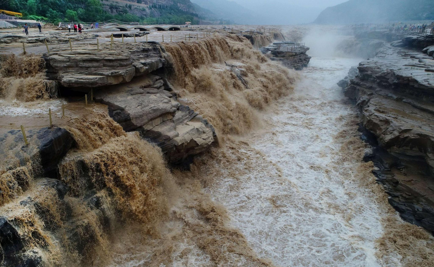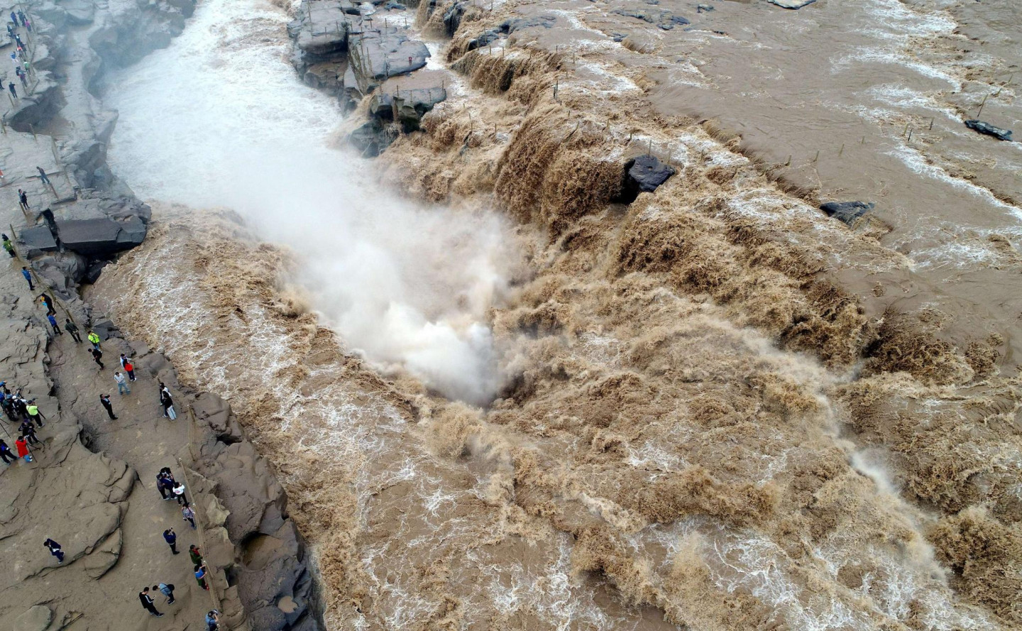 Hukou ūdenskrituma ūdens līmenis vairākkārtīgi palielinājies, ņemot vērā spēcīgās lietas Ķīnā. Šīs fotogrāfijas uzņemtas 4.augustā.