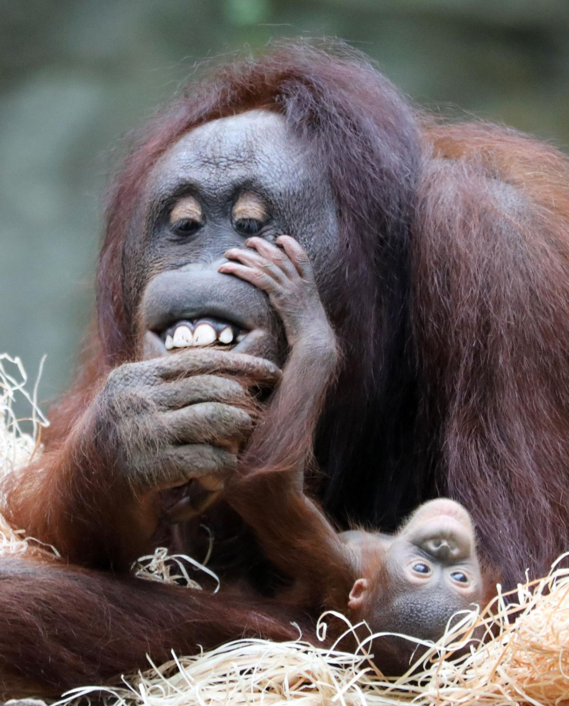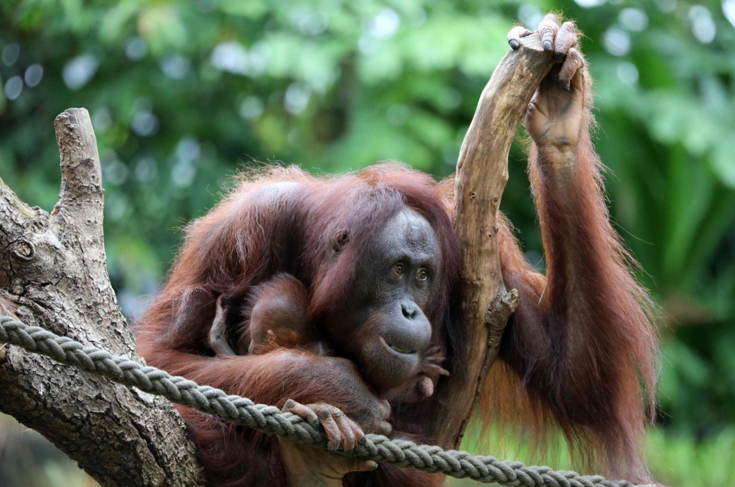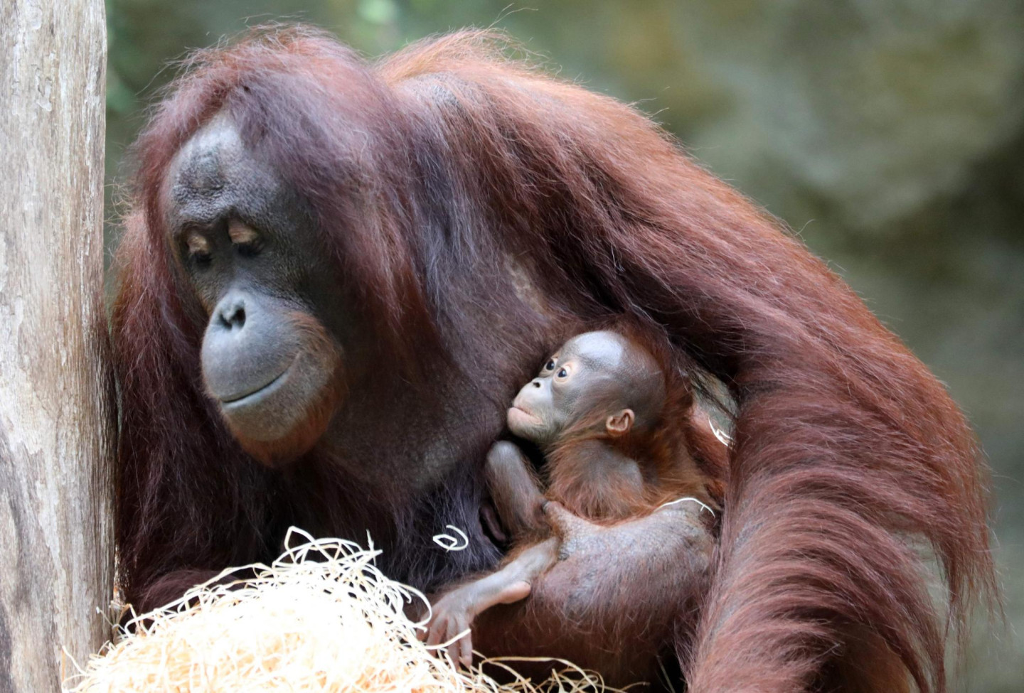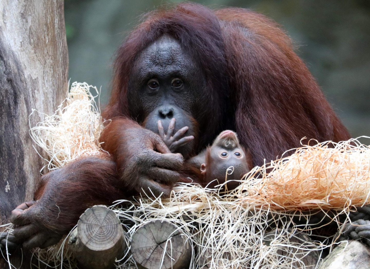 Orangutanu ģimene zoodārzā Vācijā