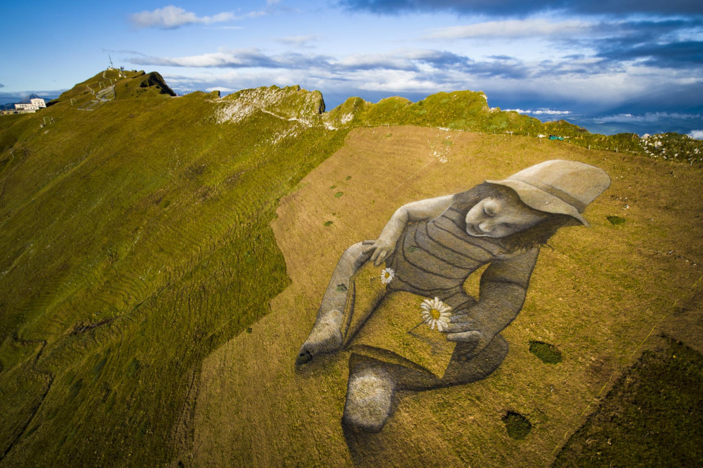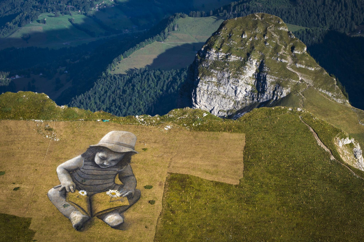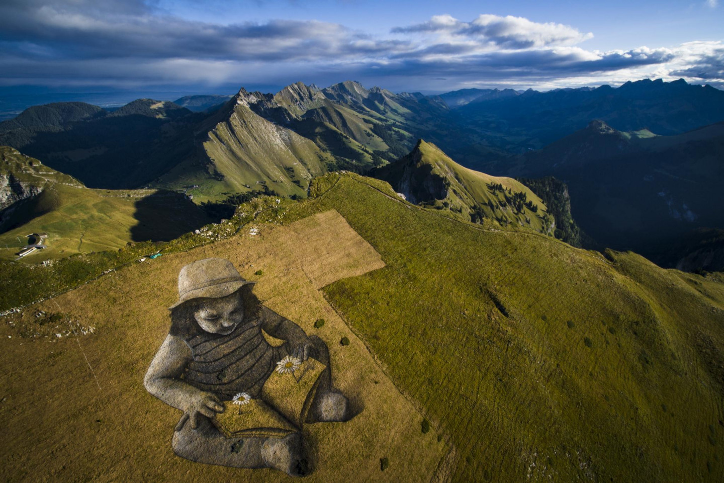 Kalnu reģionā Šveicē mākslinieki radījuši teju 6000 kvadrātmetru lielu zīmējumu. Tā tapšanā izlietoti nedaudz vairāk kā 600 litri bioloģiskās krāsas.