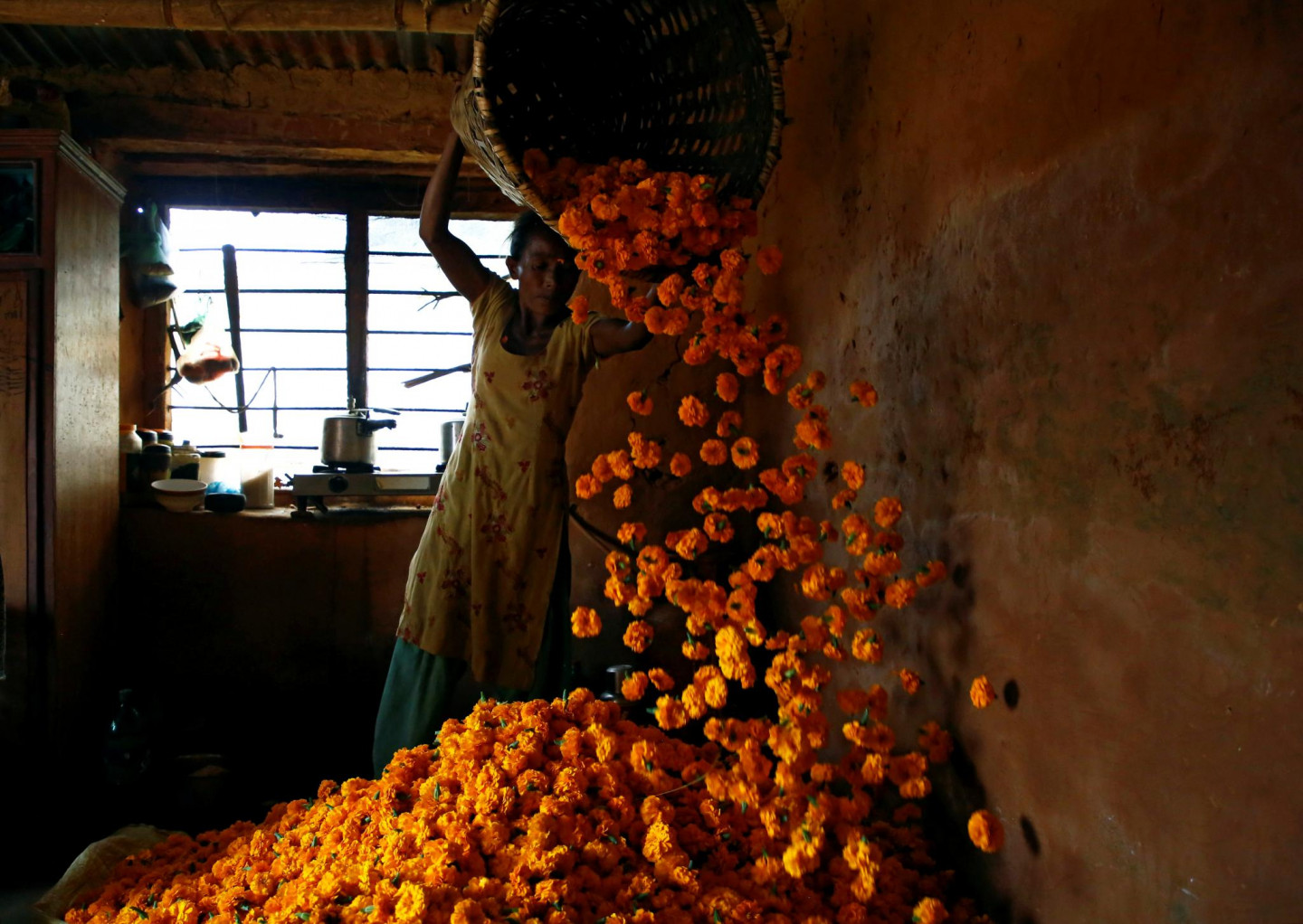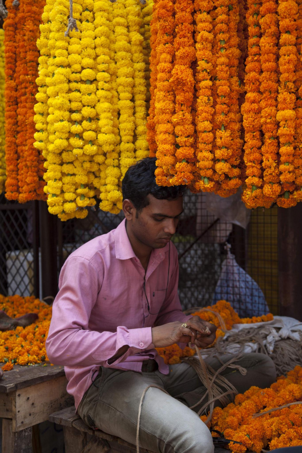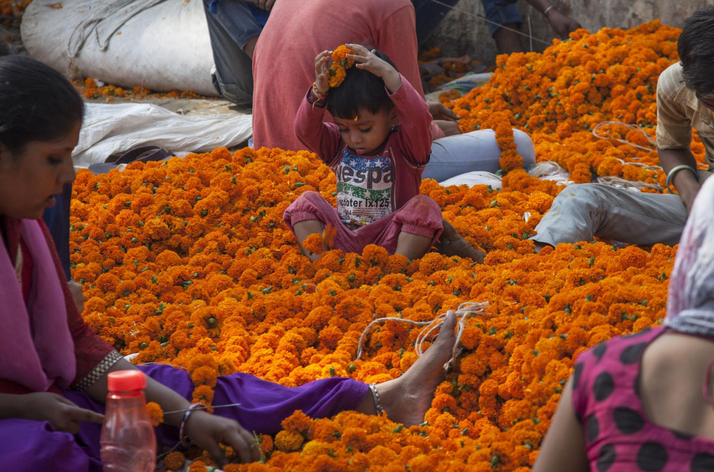 Indijā no laukiem salasīti krāšņi ziedi, kas vēlāk paredzēti krāšņu puķu virteņu veidošanai.