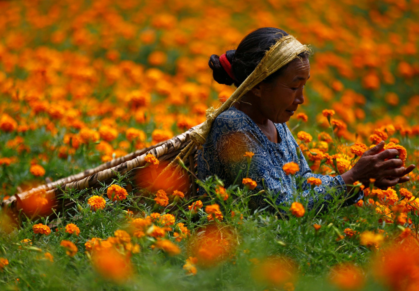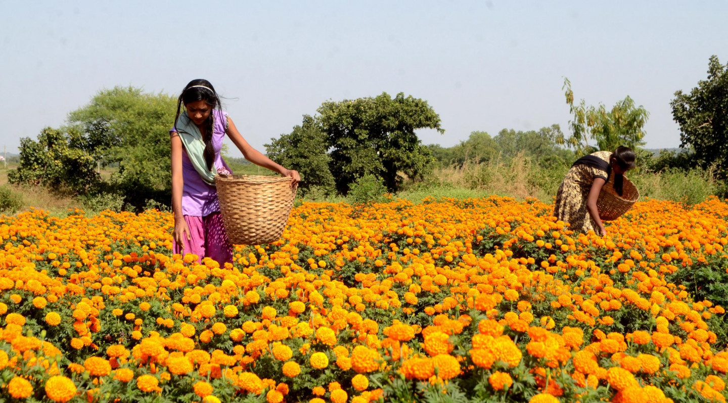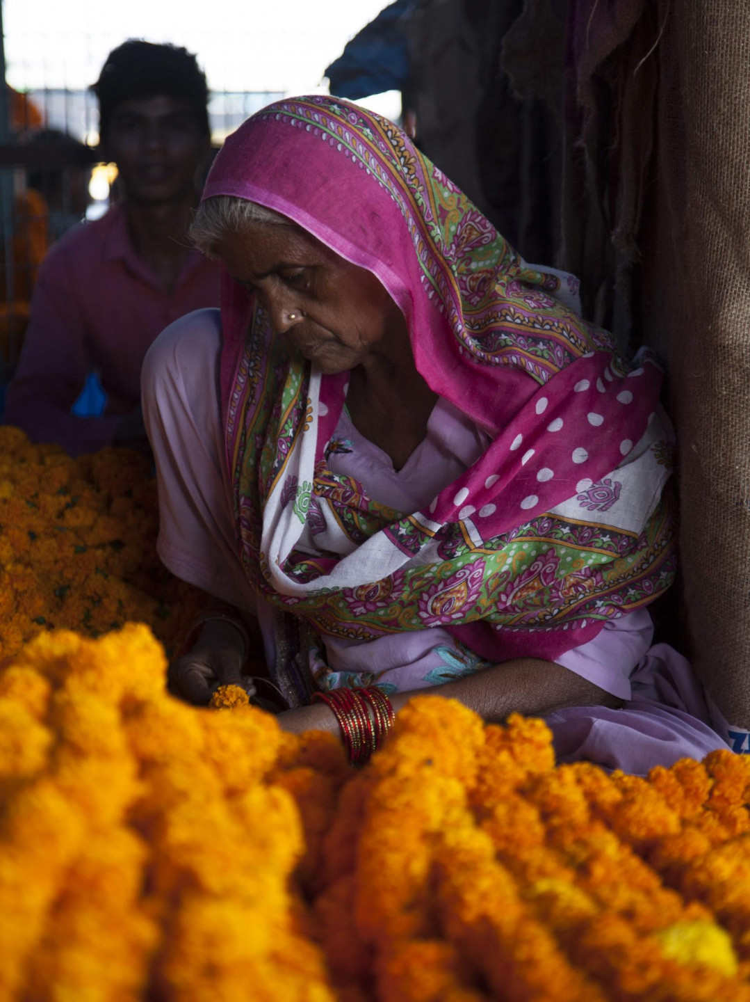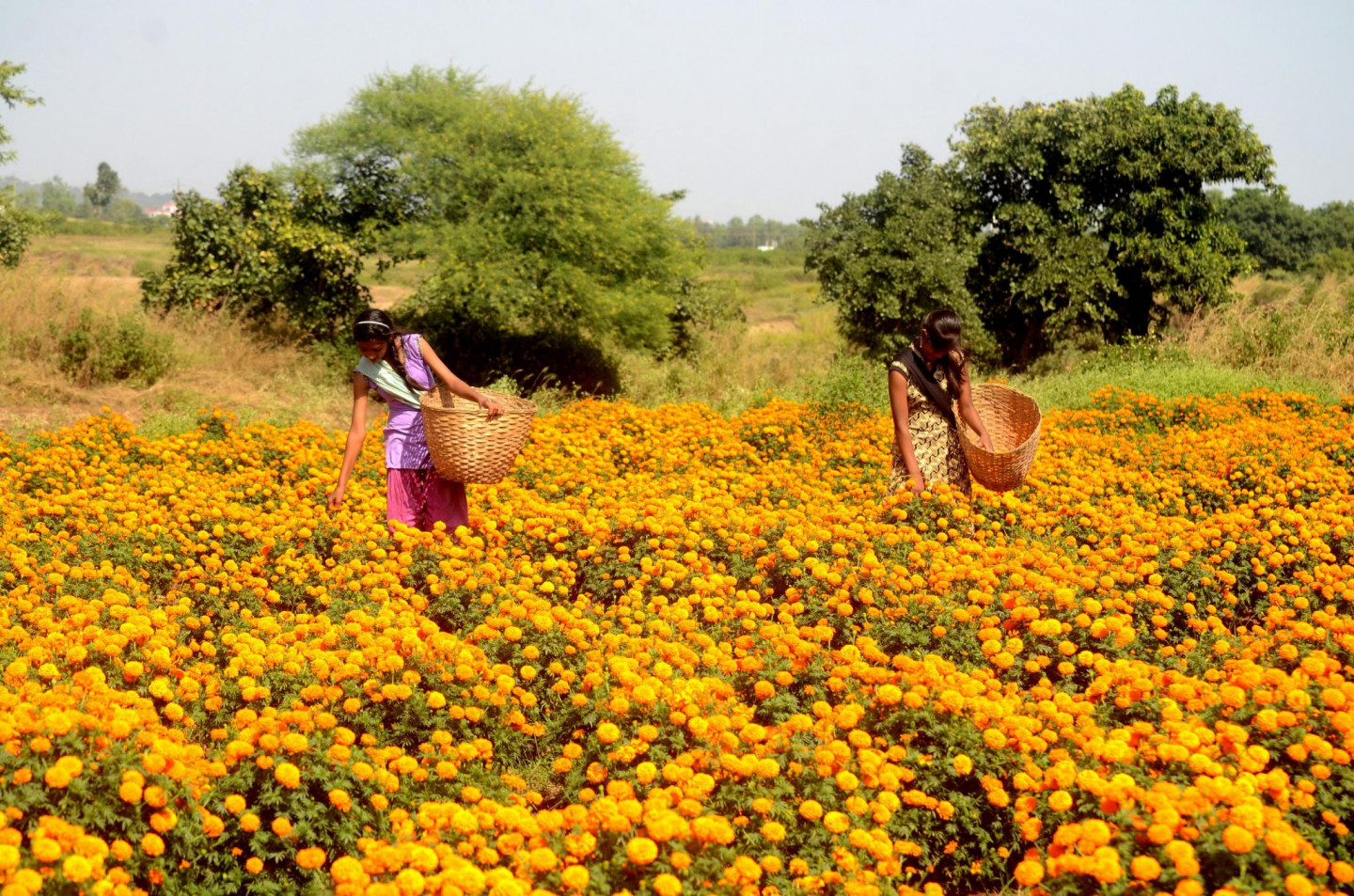 Indijā no laukiem salasīti krāšņi ziedi, kas vēlāk paredzēti krāšņu puķu virteņu veidošanai.