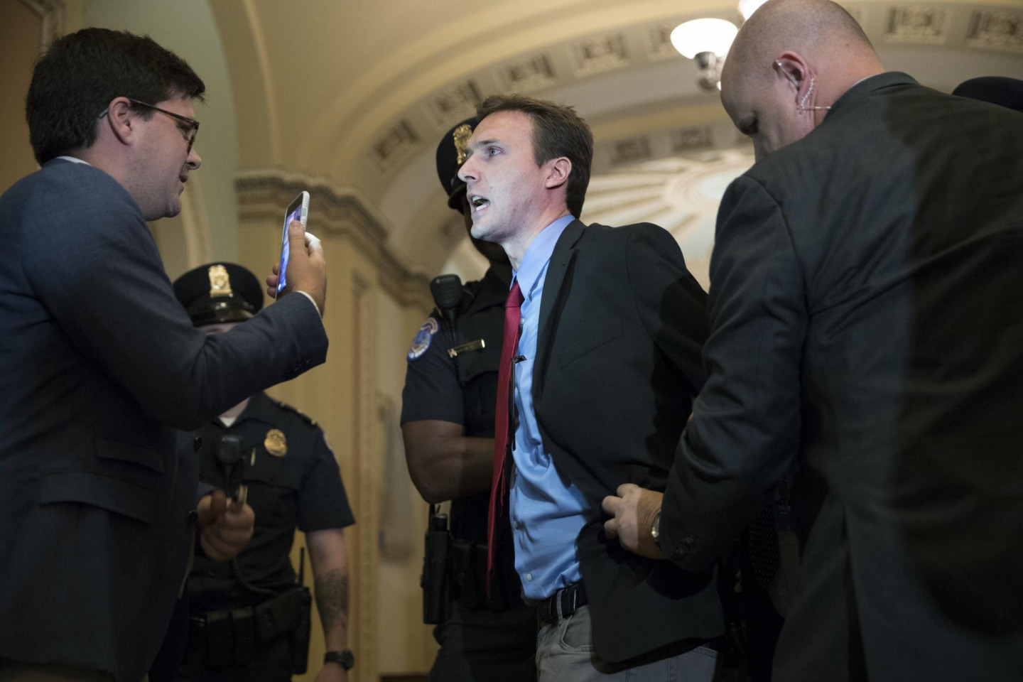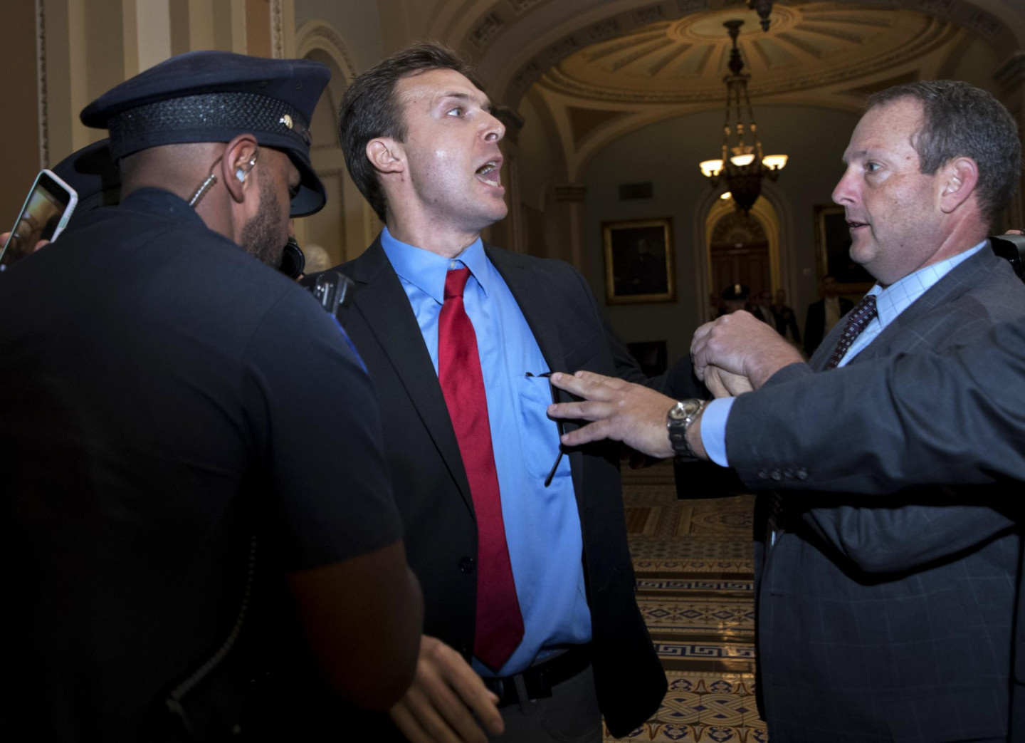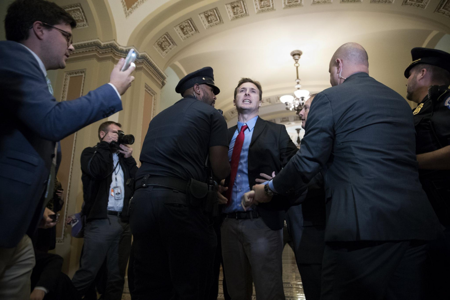 Kāds protestētājs otrdien Kongresā ar Krievijas karodziņiem apmētājis ASV prezidentu Donaldu Trampu, kad viņš ieradies tikties ar Senāta republikāņiem. Protestētājs iejucis reportieru vidē, kas gaidīja Trampa ierašanos, un tad metis viņam ar karodziņiem, saucot: "Tramps ir valsts nodevība!". Protestētājs identificēts kā Raiens Kleitons no organizācijas "Americans Take Action". Policija viņu aizturējusi un izvirzījusi apsūdzības par nelikumīgu rīcību. Kleitons iekļūšanai Senātā izmantojis vecu apmeklētāja caurlaidi un par viņa iekļūšanu ēkā un nokļūšanu tikai dažu metru attālumā no prezidenta vairākām drošības dienestu amatpersonām draud disciplinārsods. Kleitons jau iepriekš bijis pazīstams ar Krievijas karodziņu mētāšanu. Februārī konservatīvo politiķu konferencē viņš vadīja vairāk 1000 Krievijas karogu izdalīšanu, kuriem vidū bija uzdrukāts Trampa vārds. "Americans Take Action" ir negatīvi noskaņota pret Trampu, un tās mājaslapa ir veltīta viņa impīčmenta panākšanai, ziņo LETA.