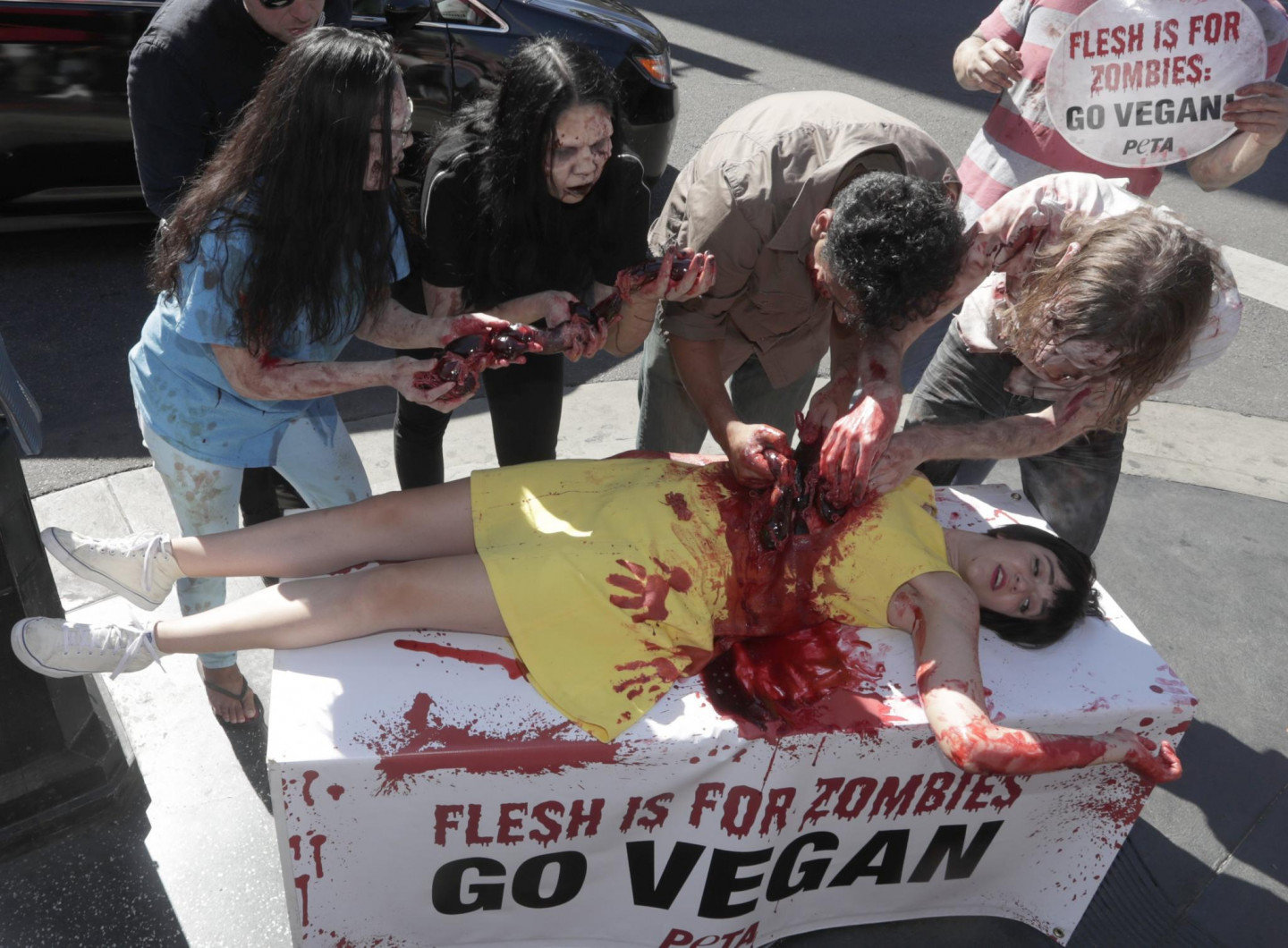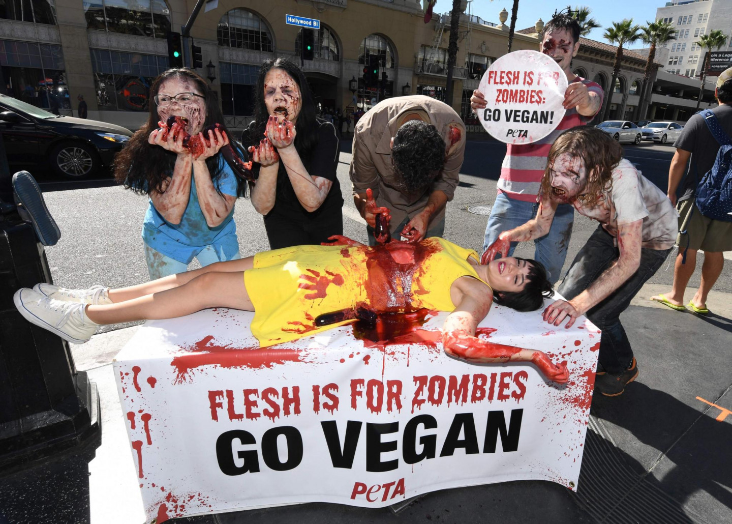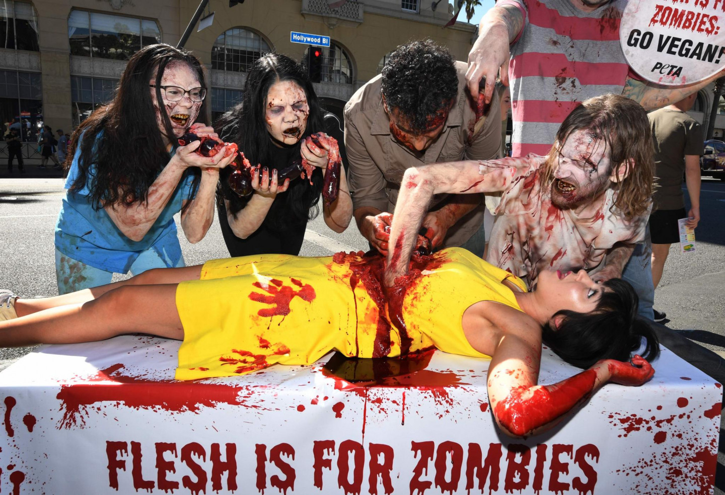 Oktobra beigās neliels pulks dzīvnieku aizstāvju pulcējušies mītiņā Kalifornijā, kur tērpti zombiju kostīmos protestējuši pret gaļas lietošanu uzturā.