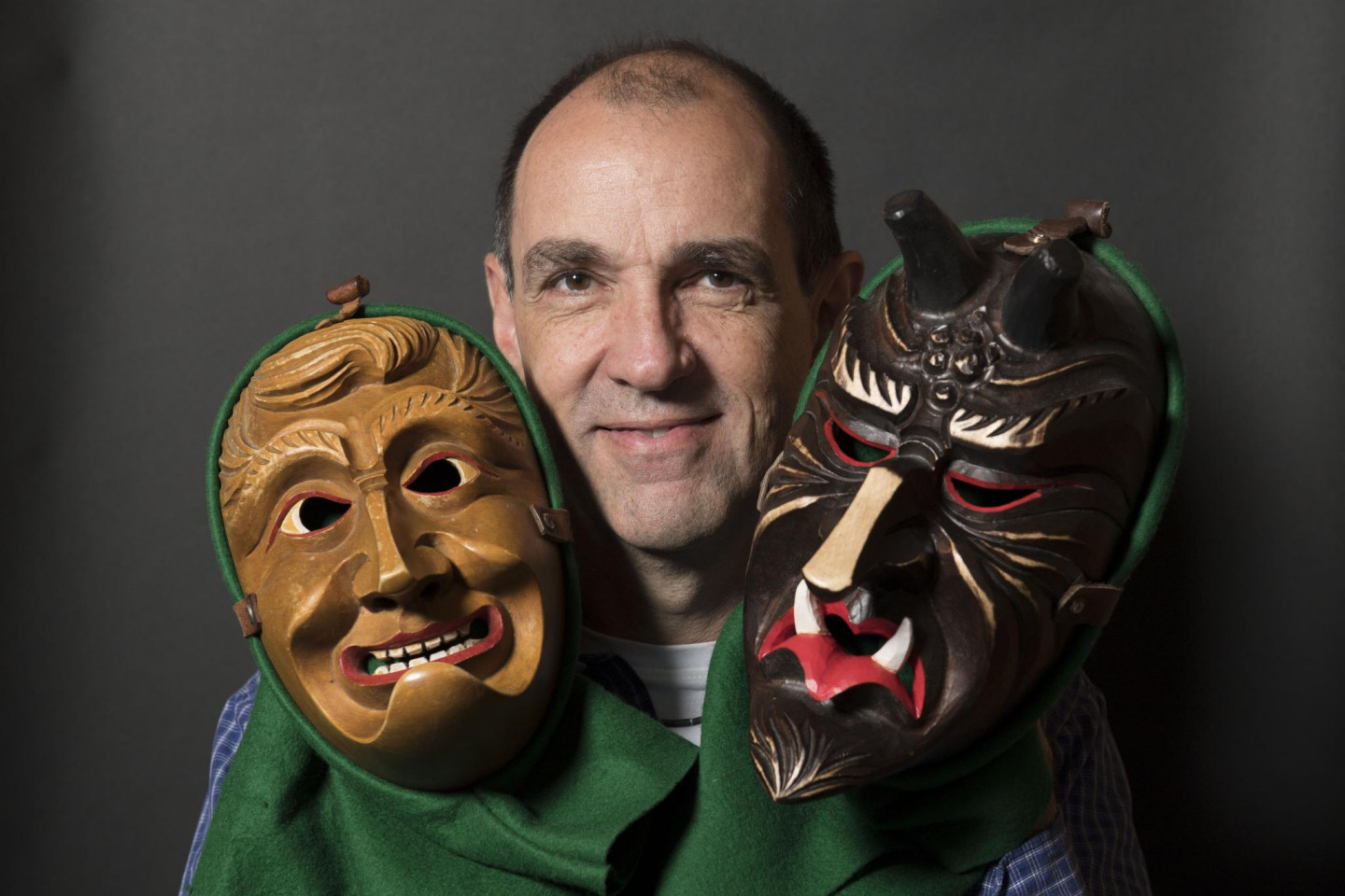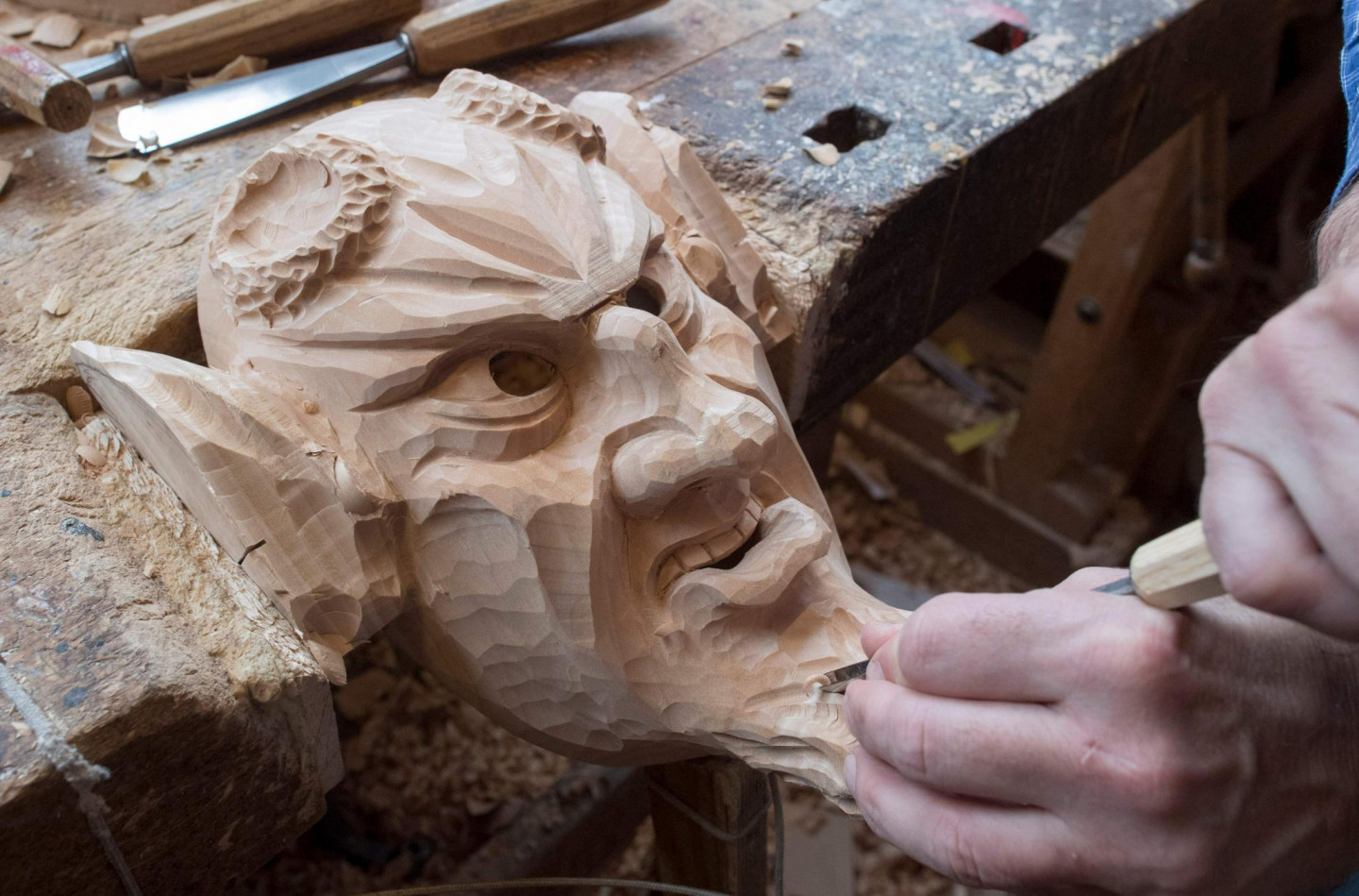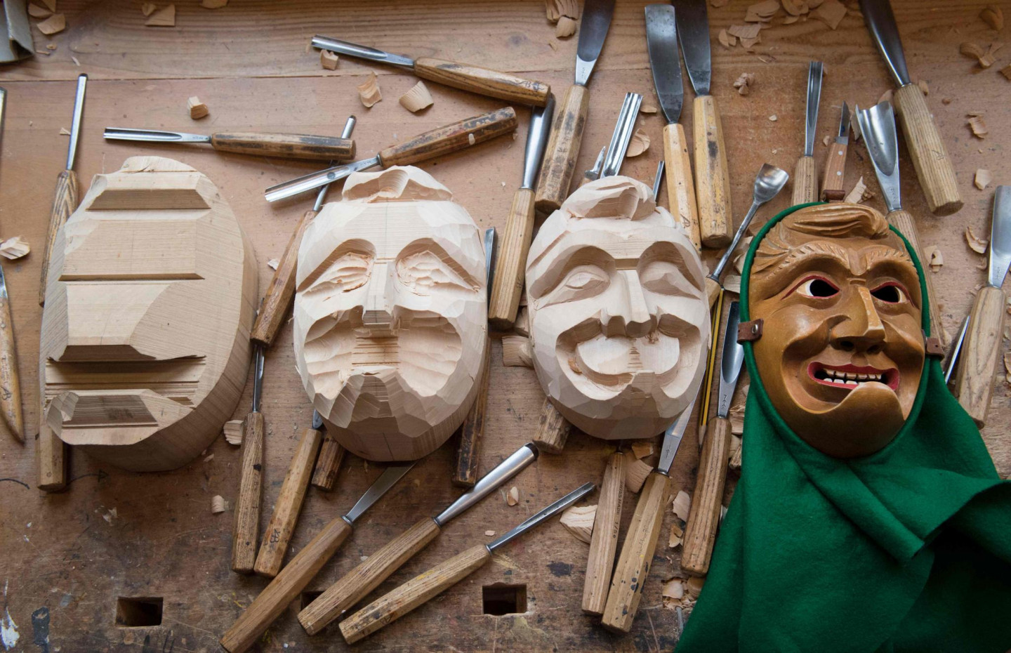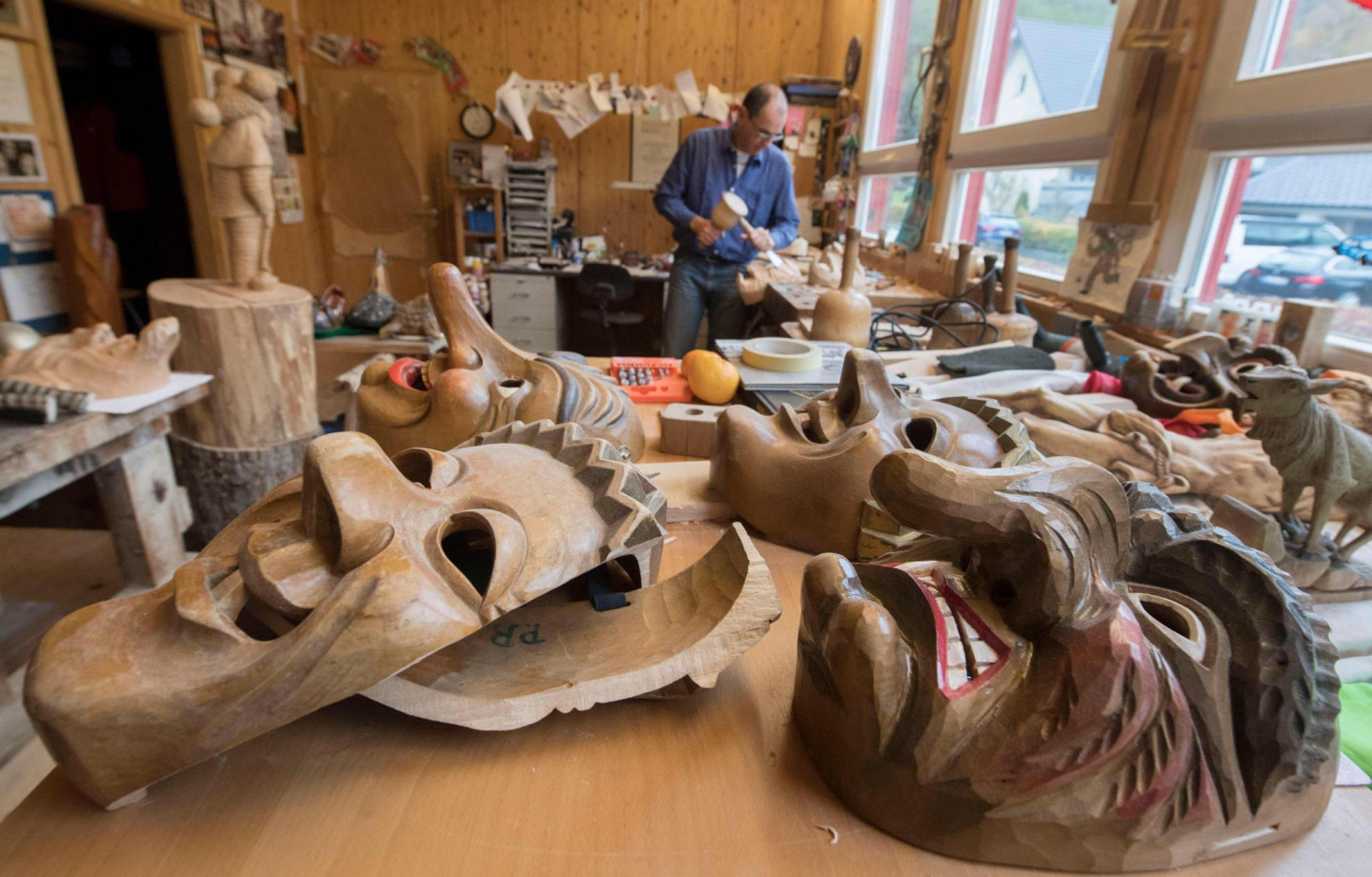Adrians Burgers no Vācijas rada koka maskas, kas paredzētas kārtējam karnevālam.