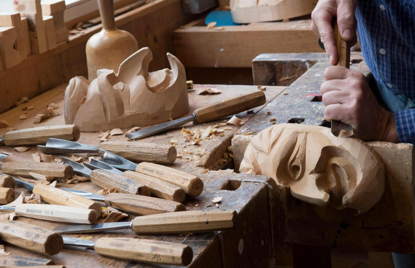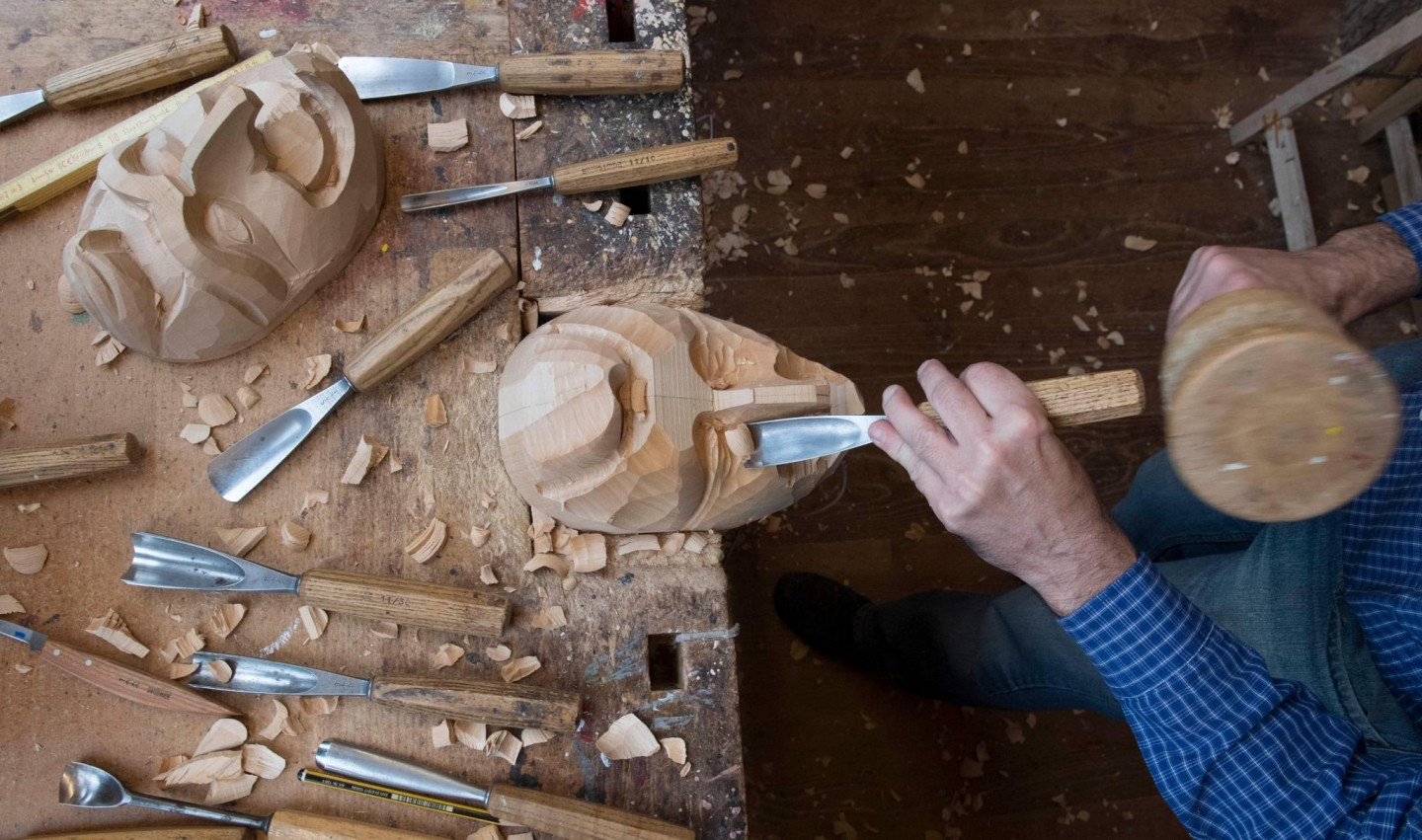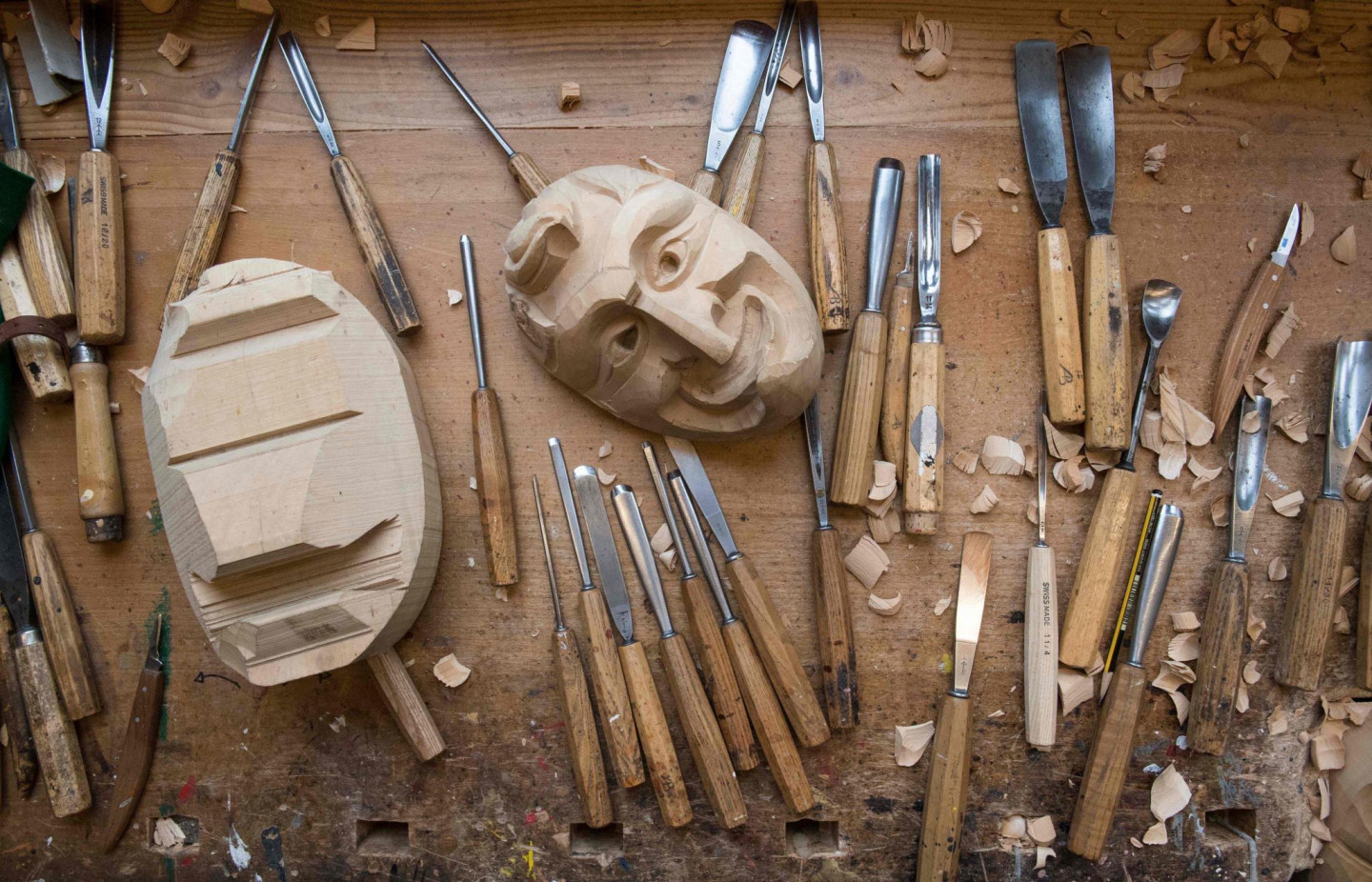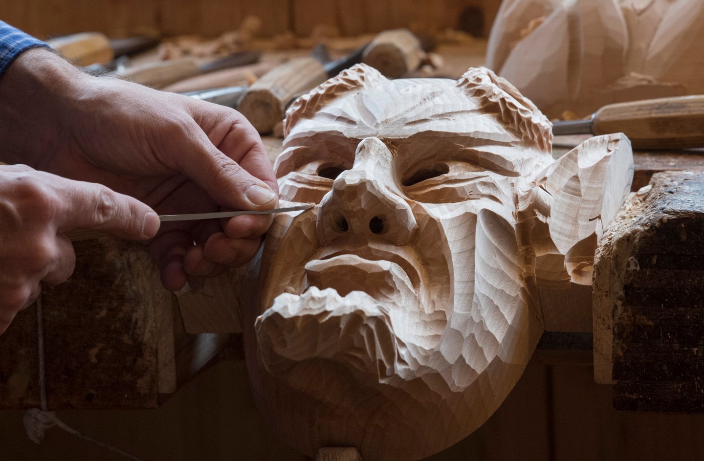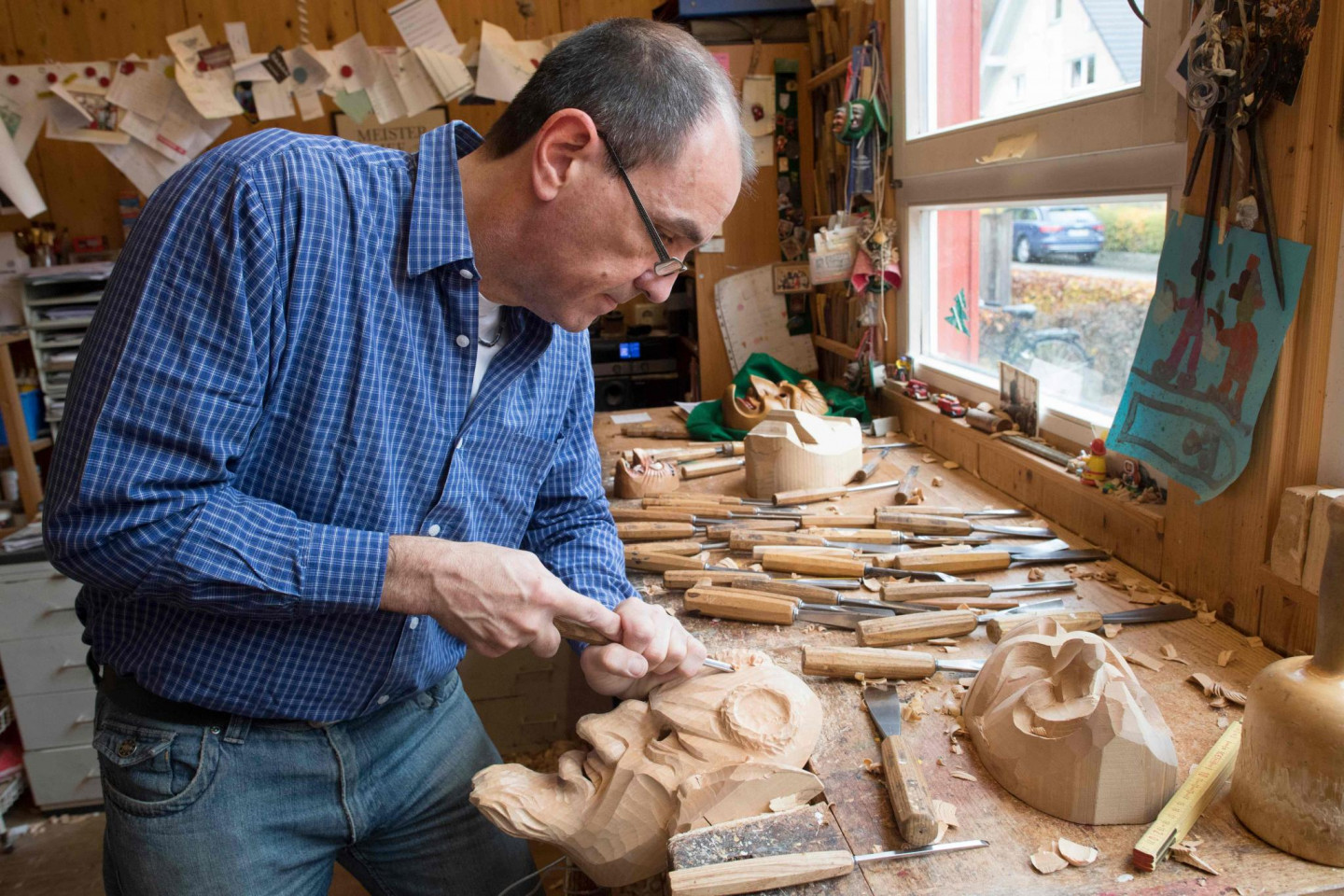 Adrians Burgers no Vācijas rada koka maskas, kas paredzētas kārtējam karnevālam.