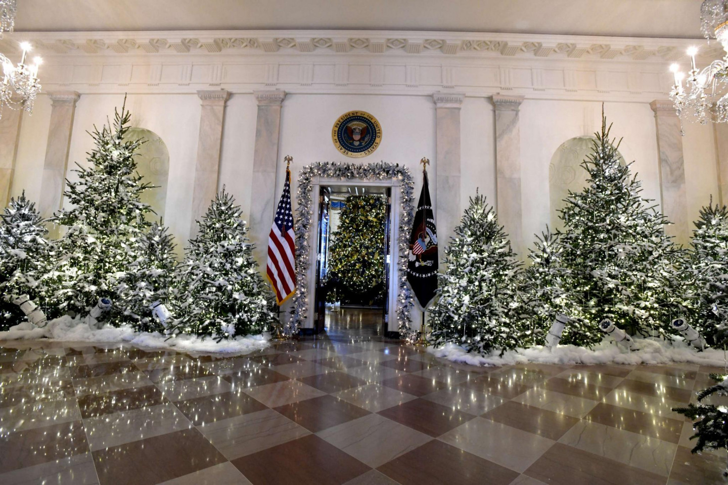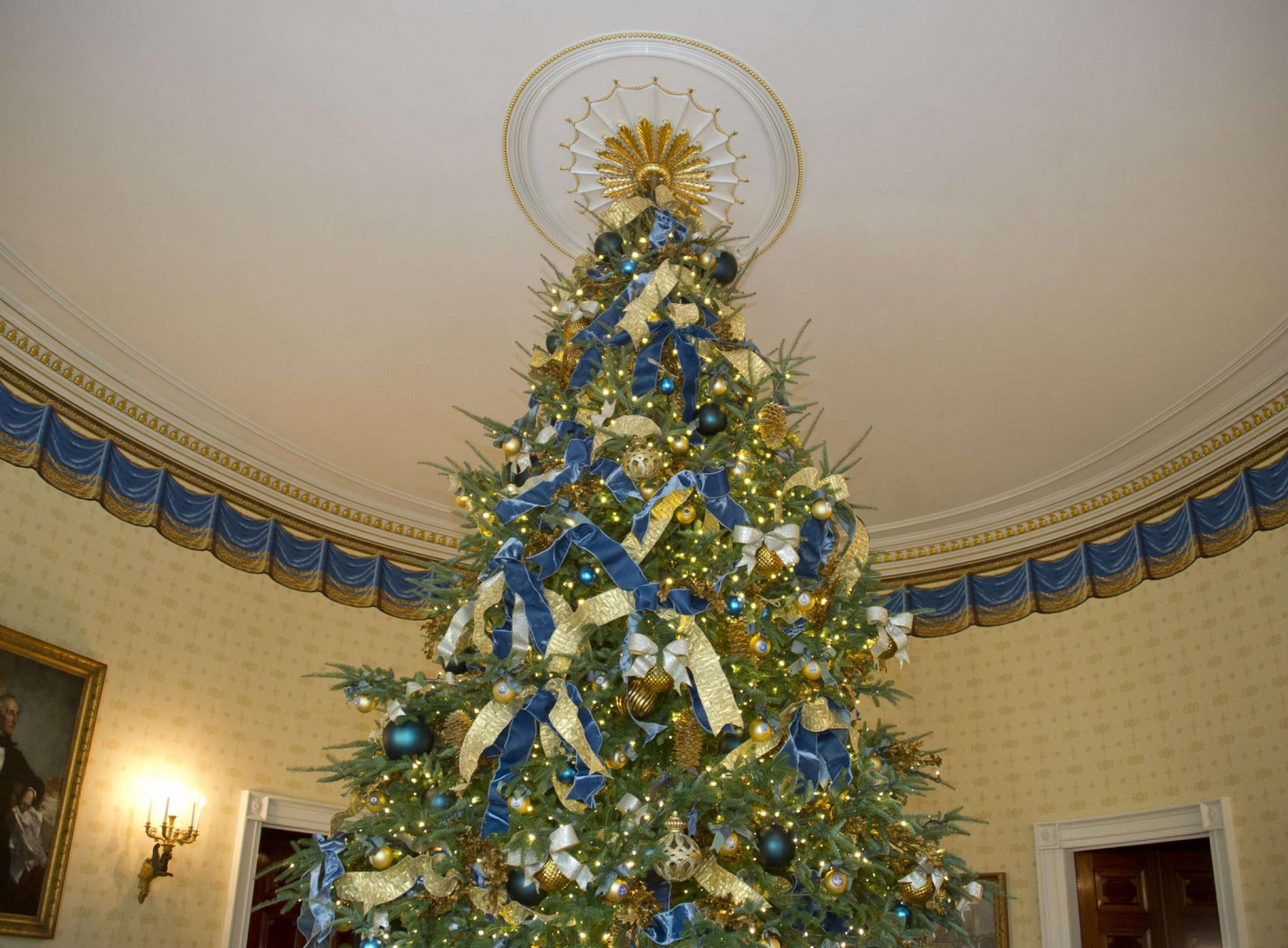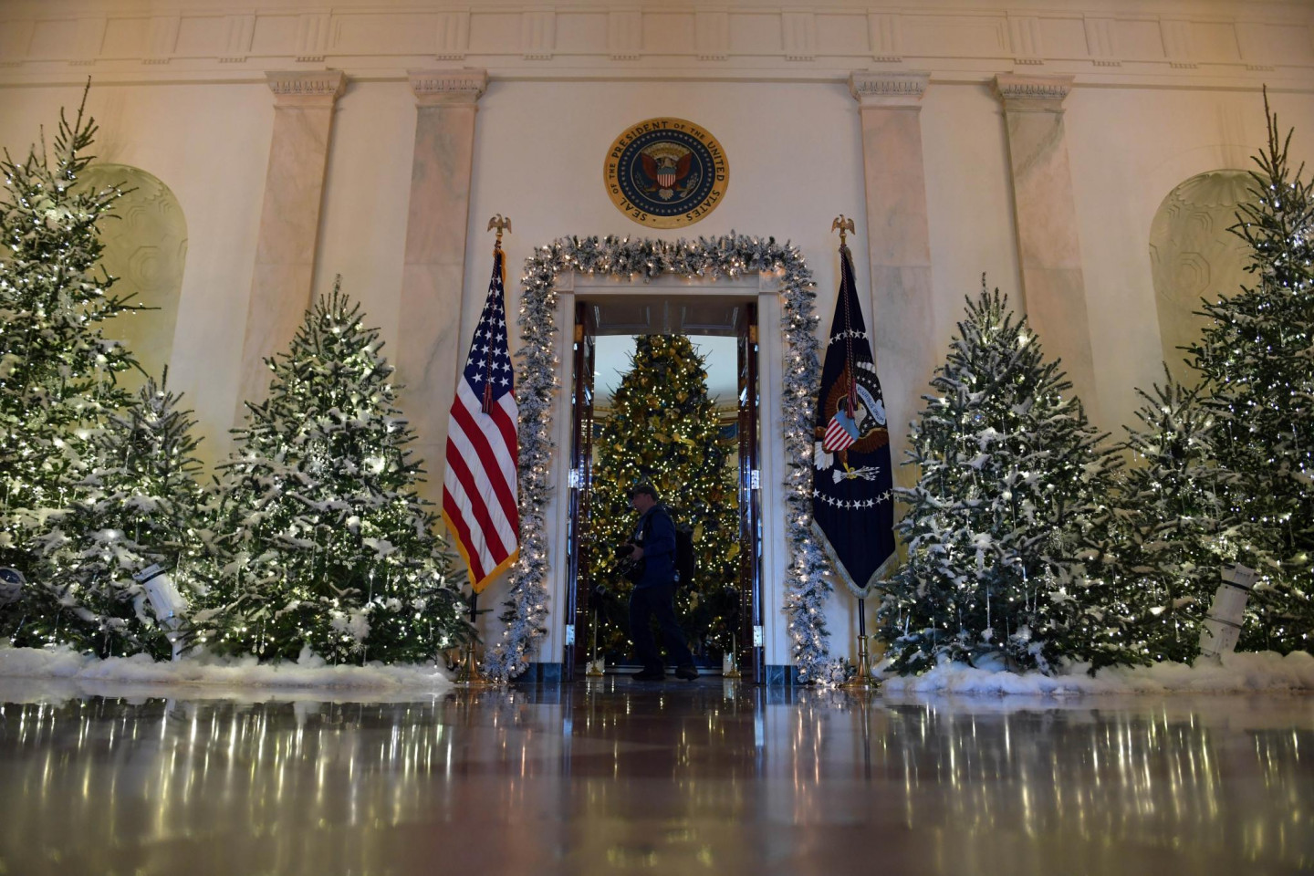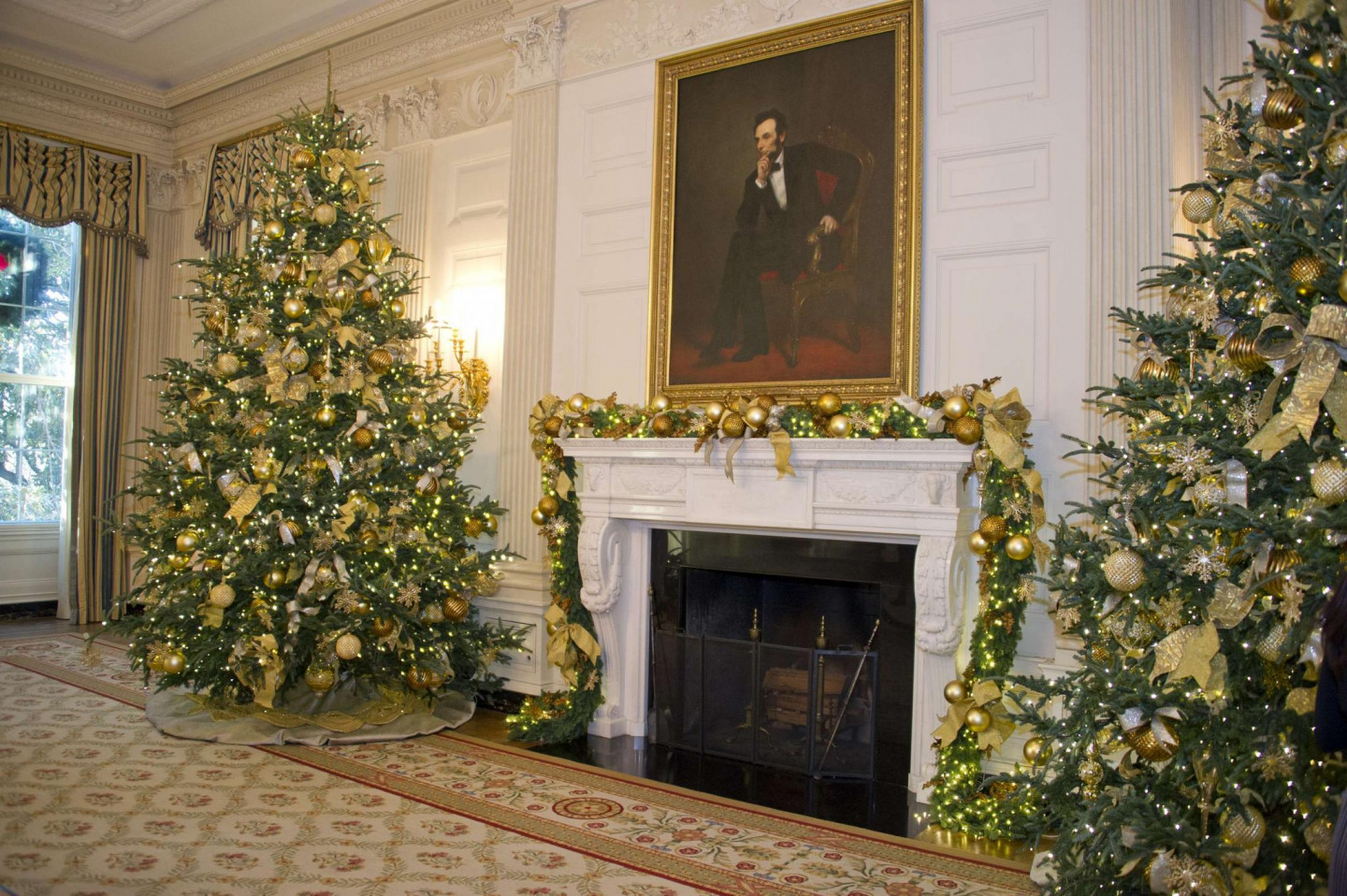 Vairākas nedēļas pirms Ziemassvētkiem ASV pirmā pāra mājvieta Baltais nams rotāts ar svētku dekoriem.