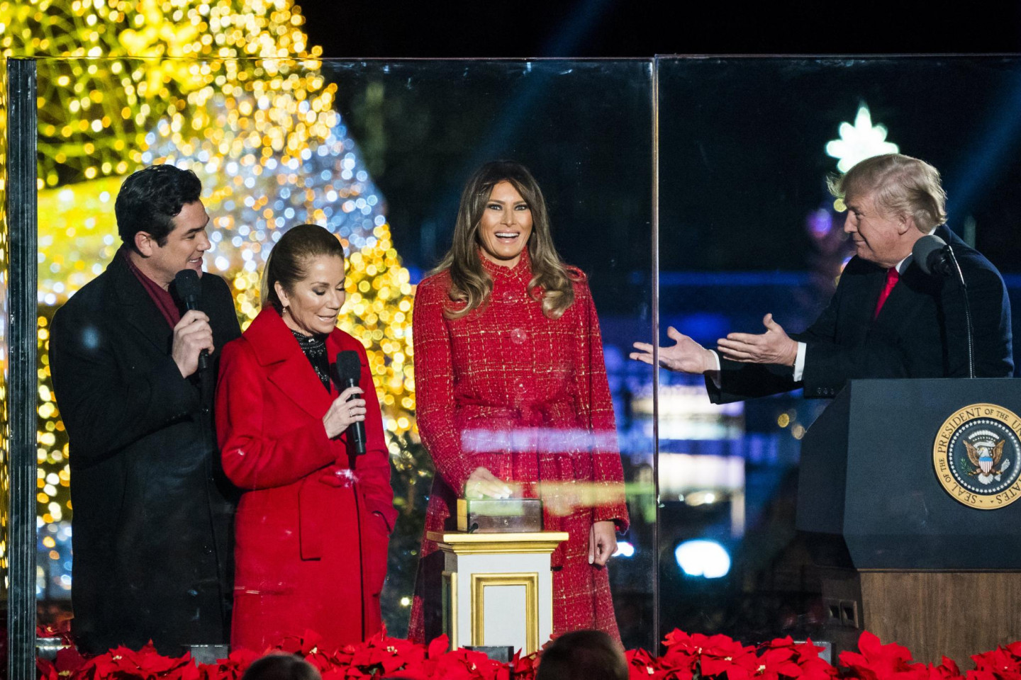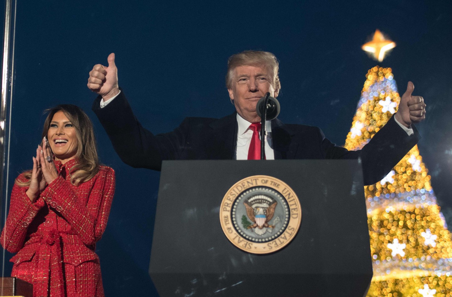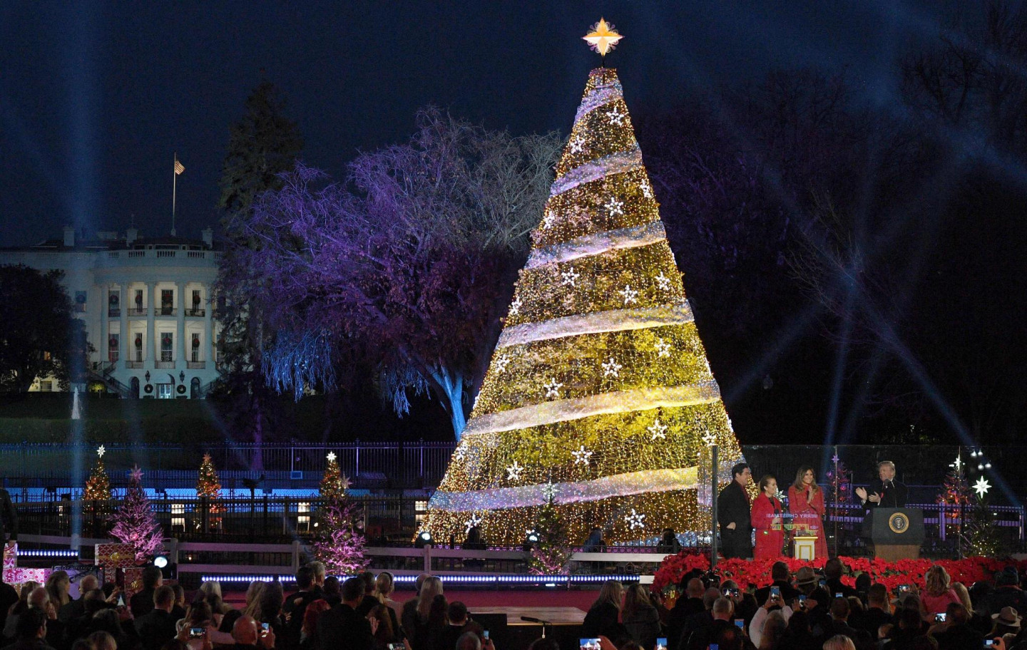 ASV prezidents Donalds Tramps ar ģimeni iededzis Baltā nama Ziemassvētku egli.