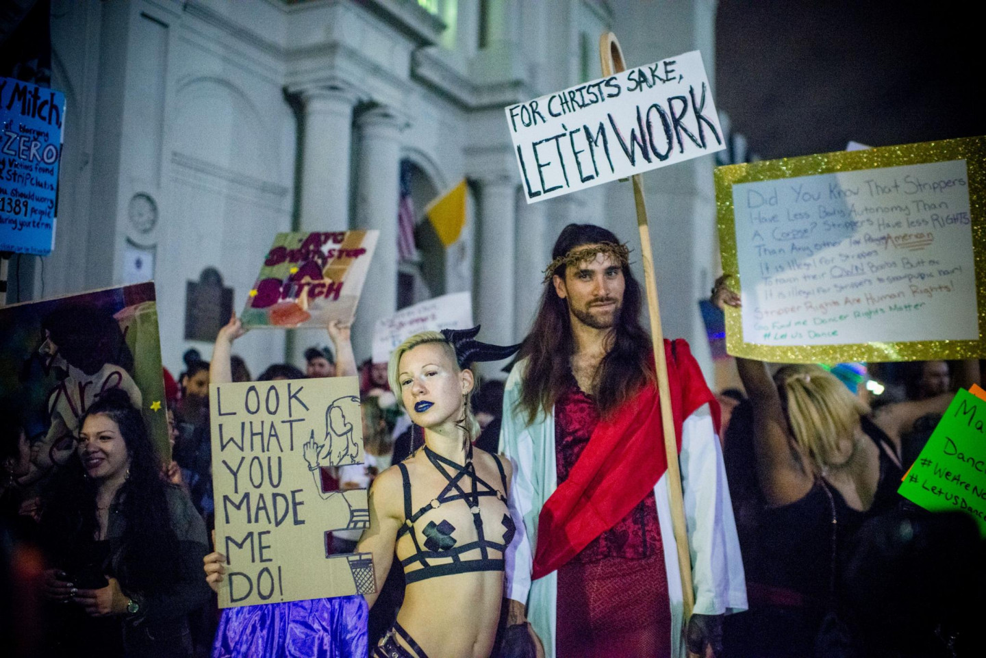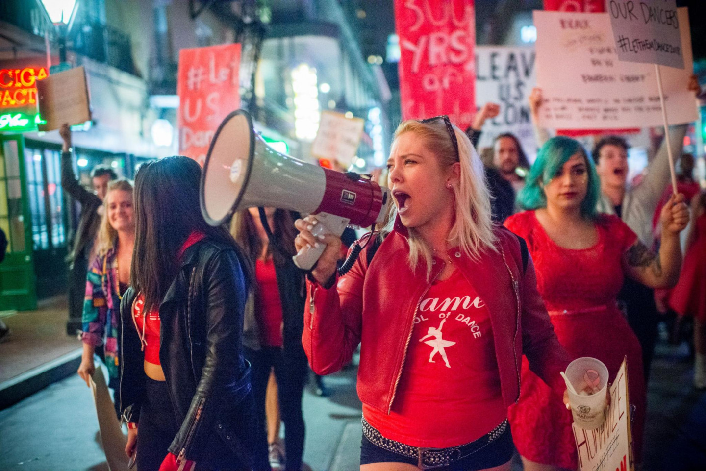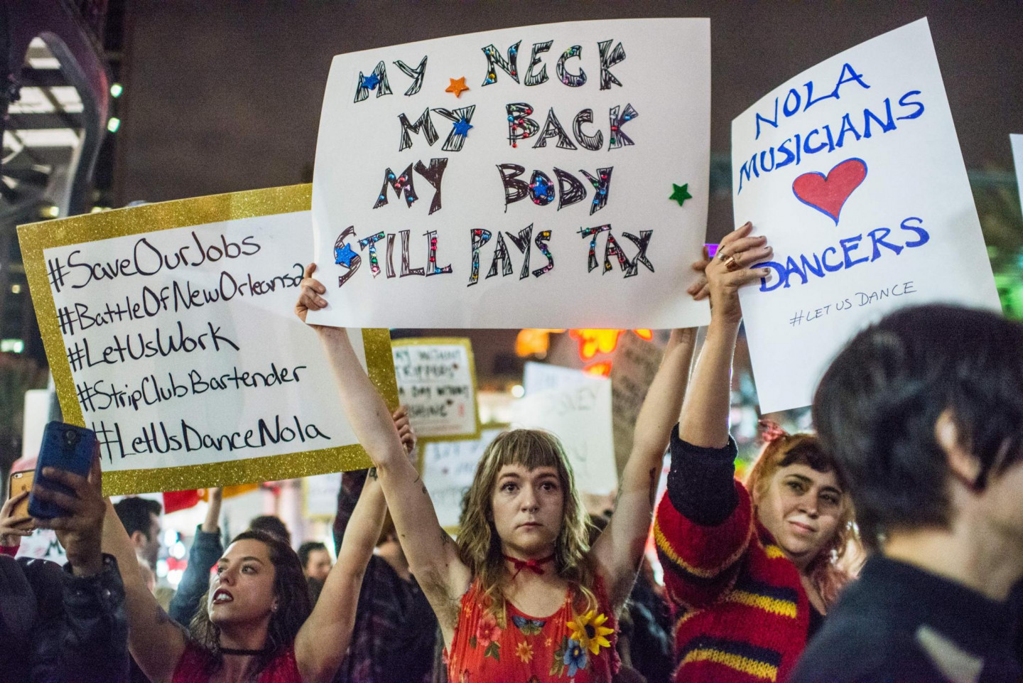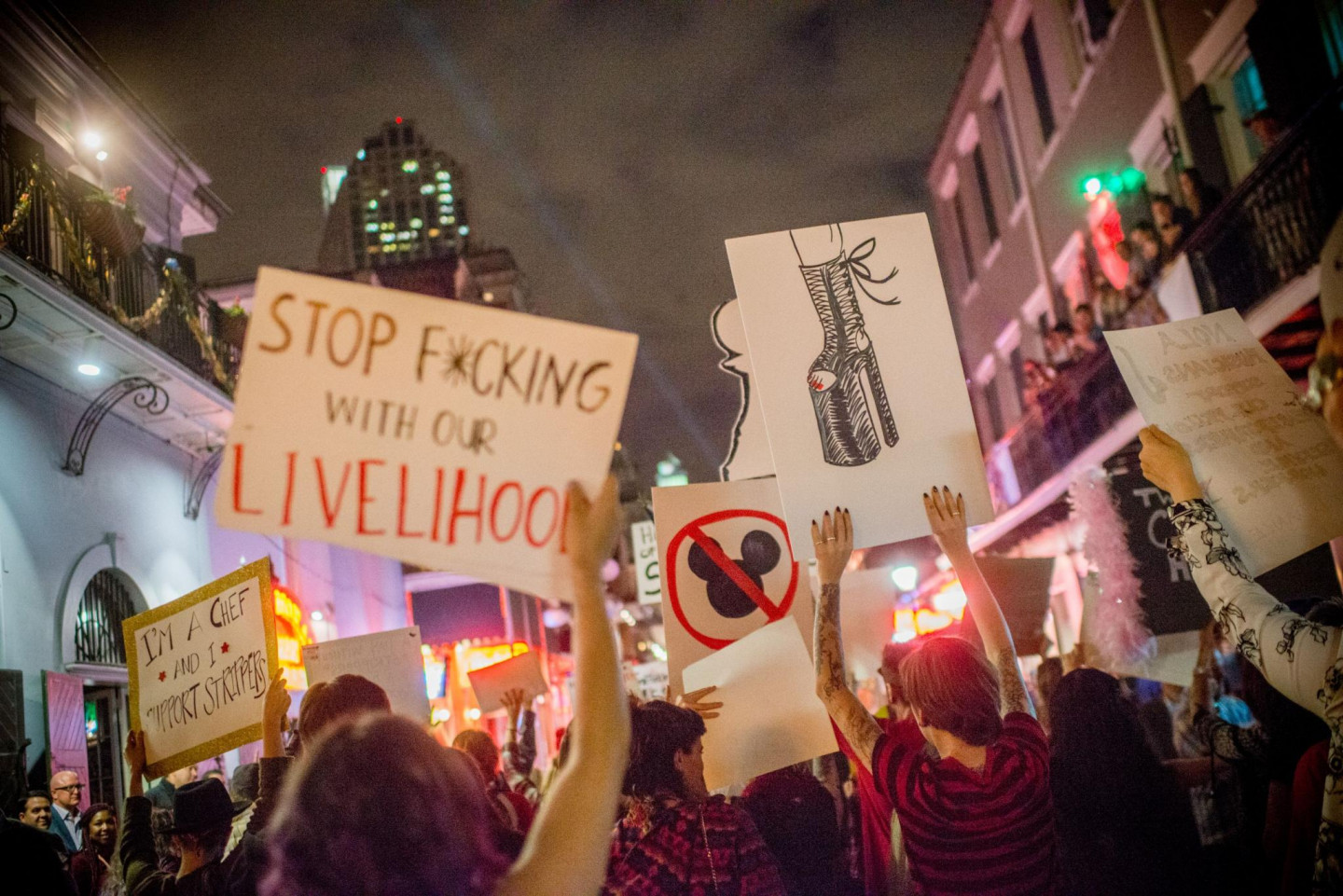 "Mēs protestējam, jo viņi mēģina slēgt lielāko daļu klubu Burbonu ielā, lai padarītu to par kaut kādu Disnejlendas kruīza kuģa ostu," sacīja viena no eksotiskajām dejotājām, kura bija ieradusies uz demonstrāciju.