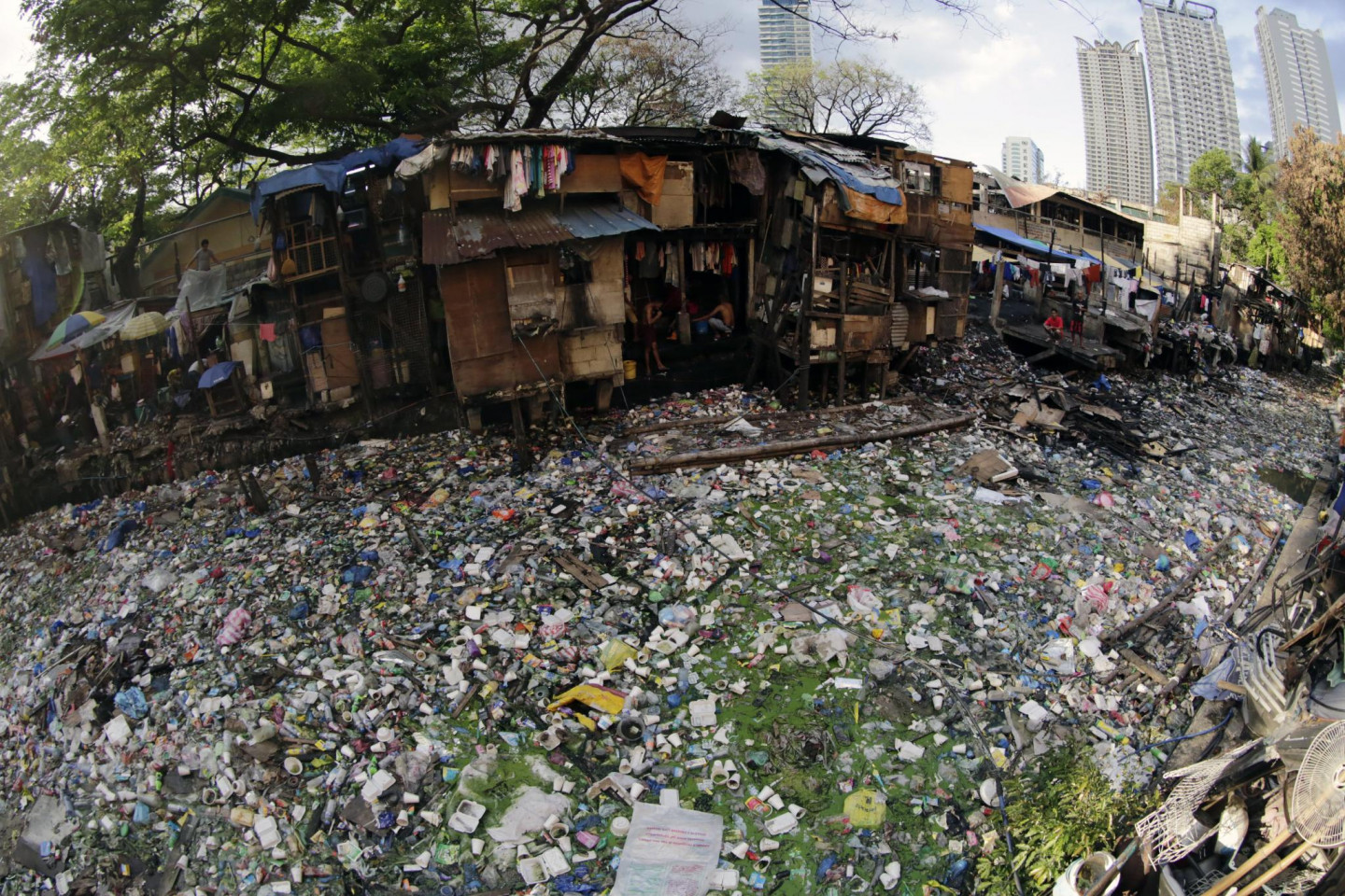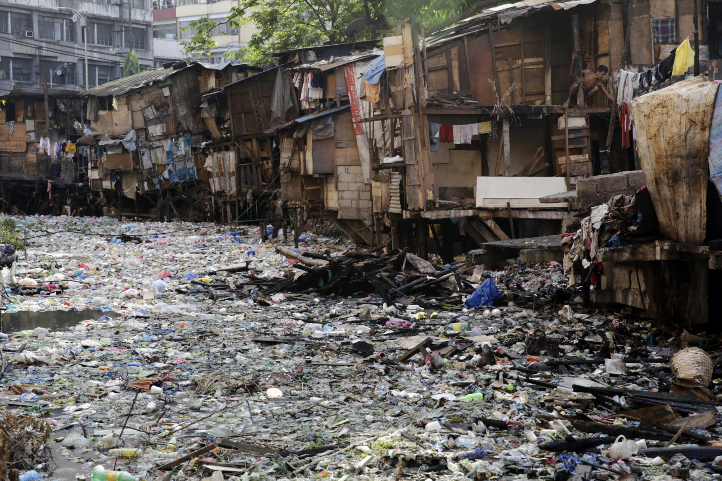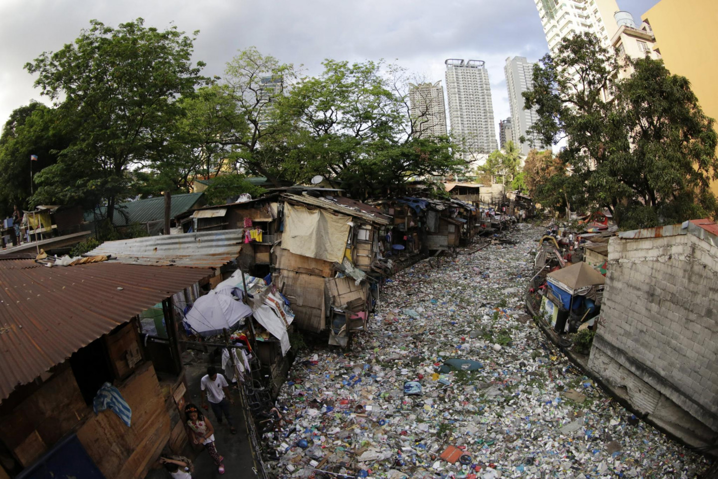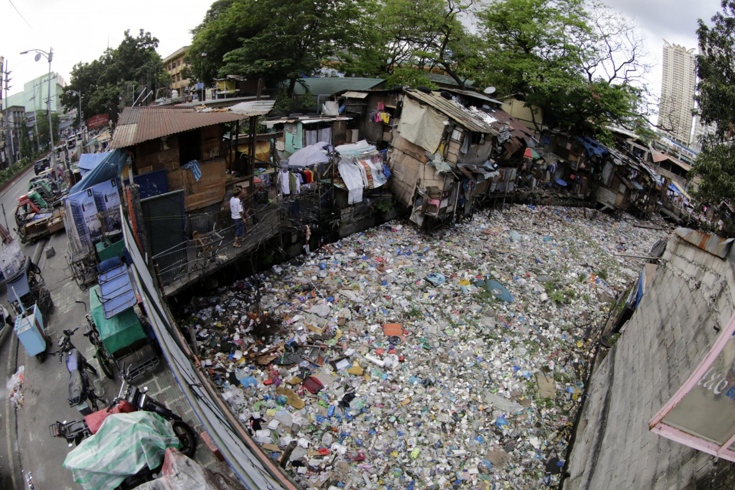 Filipīnu galvaspilsētā Manilā turpat zem augstceltnēm plūst kanāls, kas pildīts ar atkritumiem.