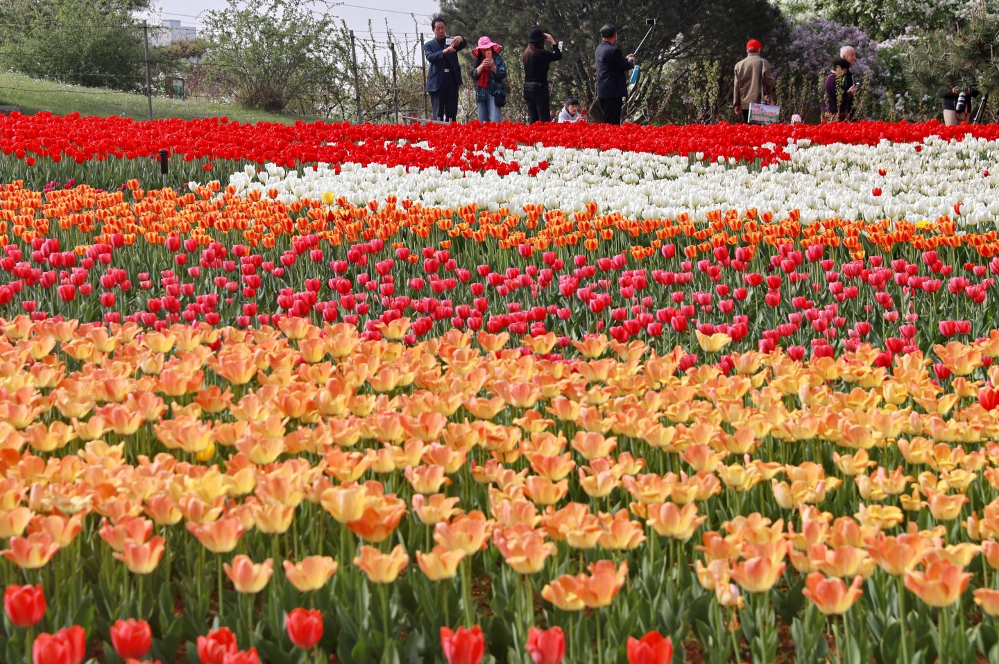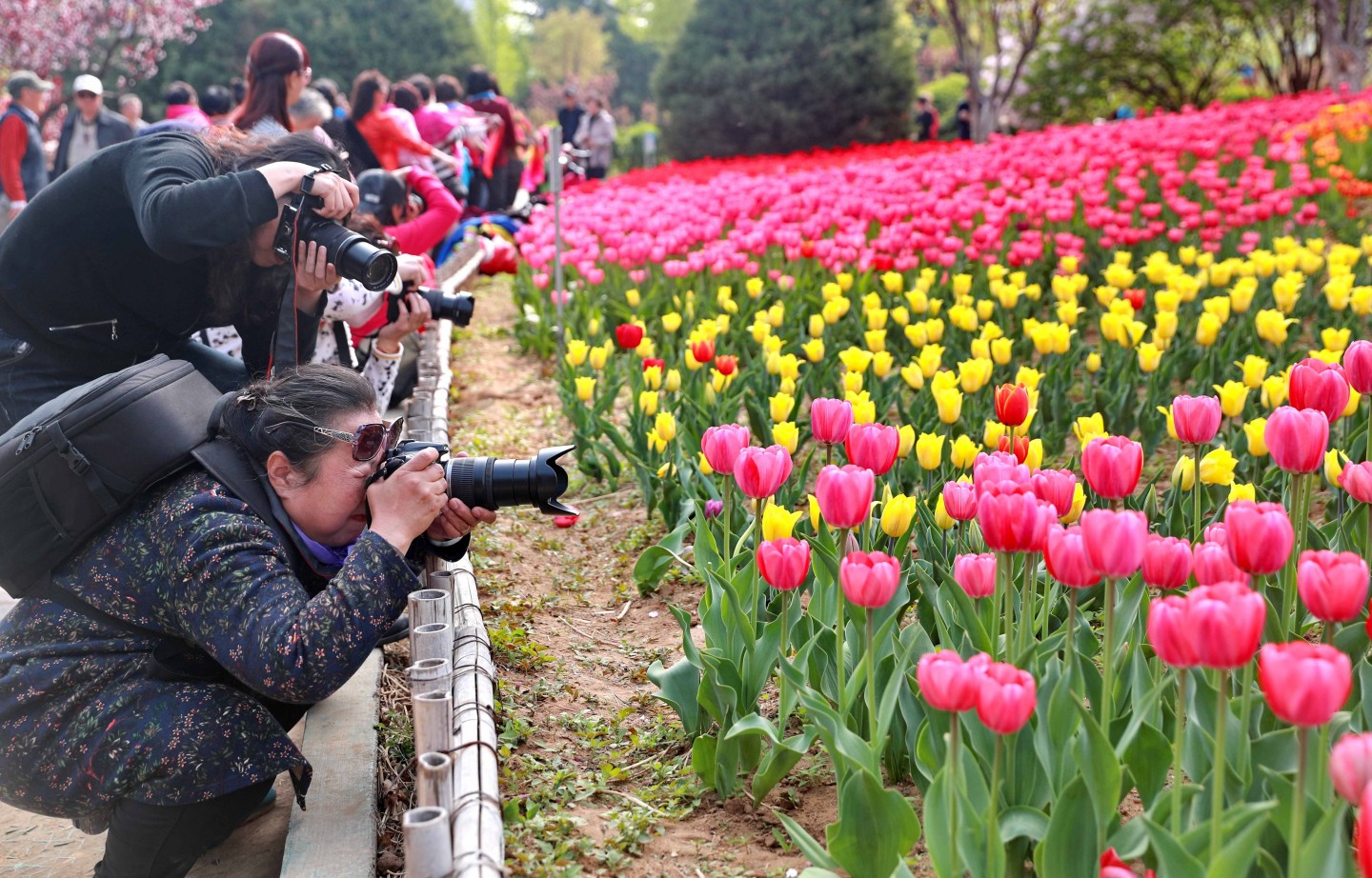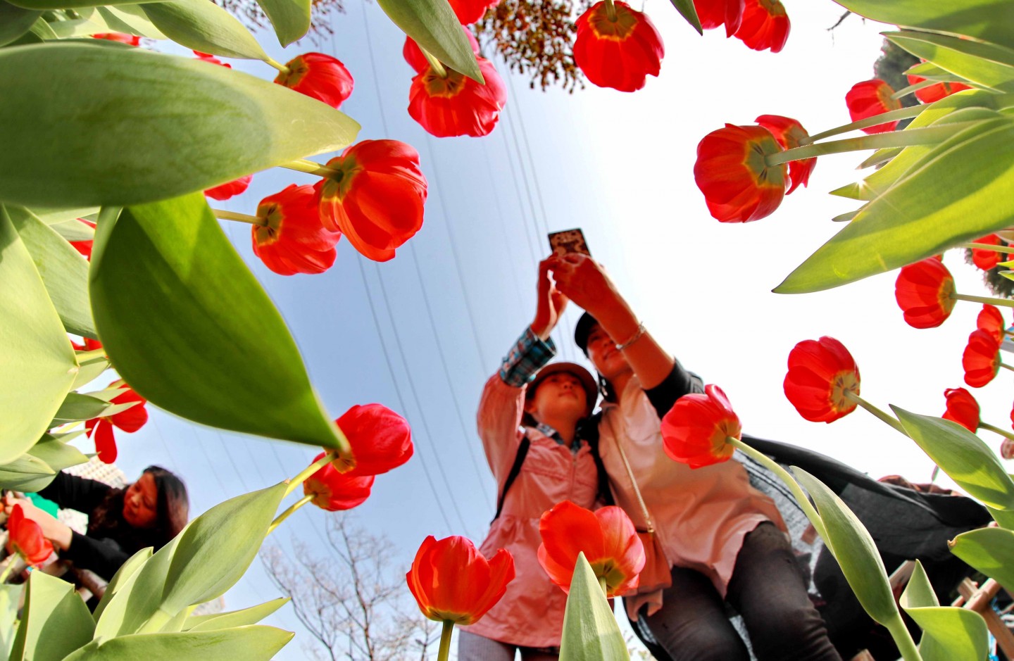 Šajā nedēļas nogalē vairāki desmiti cilvēku steiguši iemūžināt, kā izskatās krāšņie tulpju lauki Ķīnā.
