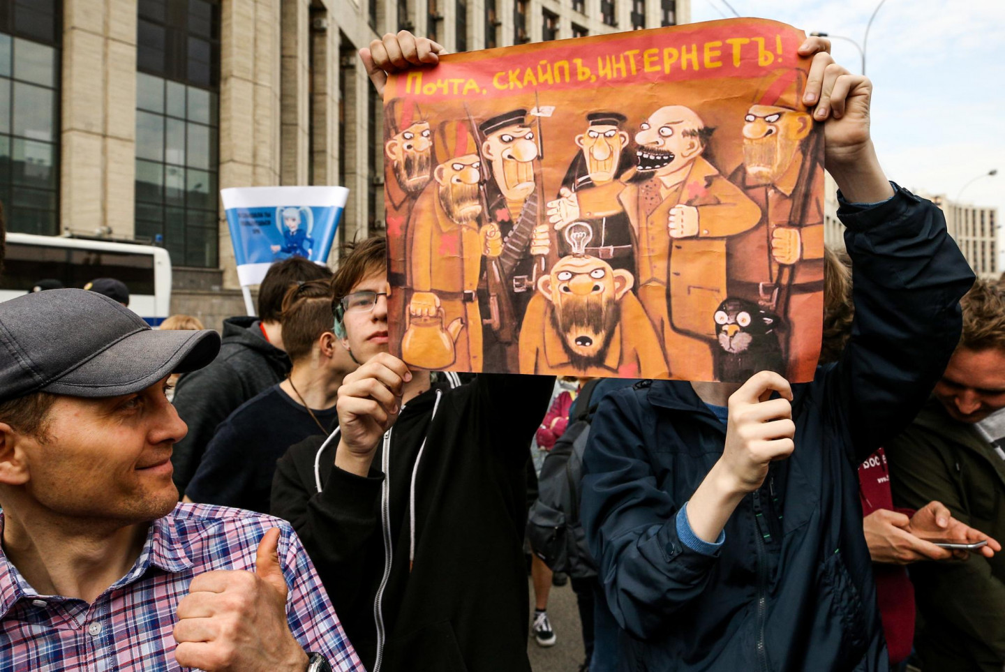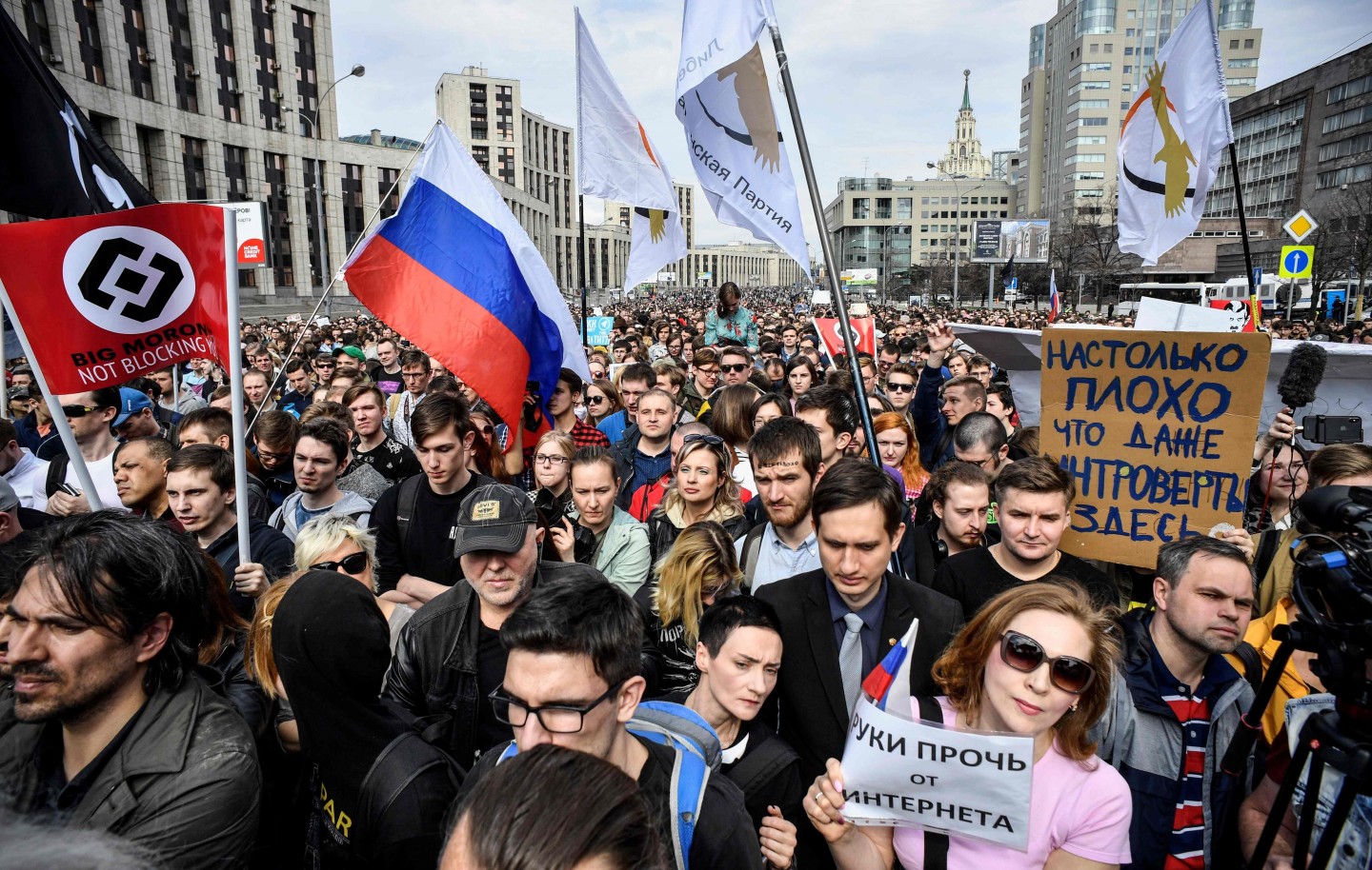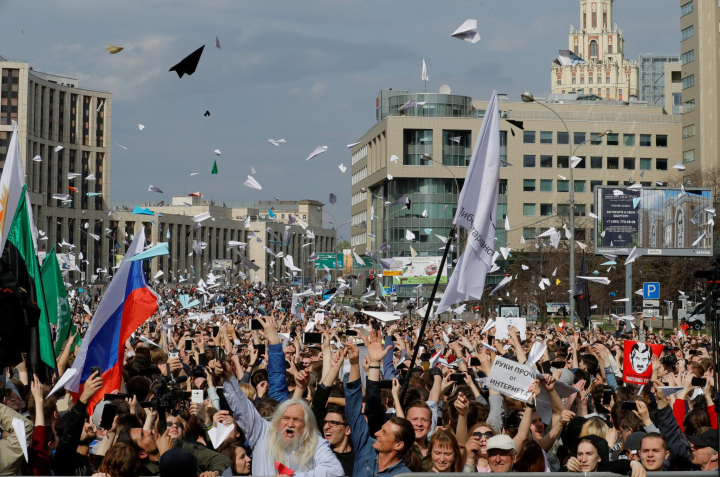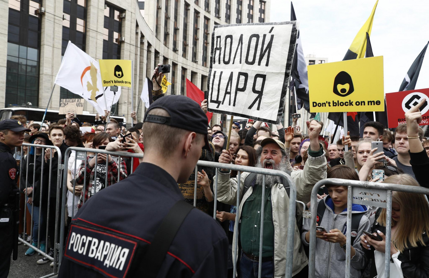 Tūkstošiem cilvēku pirmdien pulcējās mītiņā Maskavā, lai paustu atbalstu interneta brīvībai un protestētu pret Krievijas varasiestāžu centieniem apturēt populārās ziņapmaiņas lietotnes "Telegram" darbību. Mītiņš pulcēja neparasti lielu dalībnieku skaitu - vairāk nekā 10 000. Daudziem bija rokās plakāti, citi gaisā lidināja papīra lidmašīnas, kas ir "Telegram" simbols. Daudzi pieprasīja Krievijas prezidenta Vladimira Putina demisiju. Mītiņa dalībniekus uzrunāja opozīcijas līderis Aleksejs Navaļnijs. Politiķis nosodīja varasiestādes un uzraudzības dienestus, kas nobloķējuši "Telegram". Navaļnijs paziņoja, ka policija aizliegusi viņam aicināt cilvēkus uz varasiestāžu neatļauto mītiņu Maskavas centrā 5.maijā, un, izsakoties sarkastiski, viņš klātesošos "neaicināja" uz šo protesta akciju. Aktīvisti un IT biznesa pārstāvji, kas uzstājās mītiņā, pauda nosodījumu "Telegram" bloķēšanai, pauda atbalstu interneta brīvībai un vārda brīvībai. Skanēja arī tādi saukļi kā "Krievija būs brīva!" un "Nost ar caru!". Krievijas federālais mediju uzraudzības dienests "Roskomnadzor" 16.aprīlī sāka mēģinājumus bloķēt "Telegram" un kopš tā laika interneta lietotāji Krievijā ziņo par ievērojamiem traucējumiem tīmekļa darbībā. Maskavas Tagankas rajona tiesa šomēnes deva rīkojumu bloķēt "Telegram", jo tās uzturētāji atteikušies nodot Federālajam Drošības dienestam (FDD) lietotāju privātās sarakstes atšifrēšanas atslēgas. Bezmaksas ziņapmaiņas lietotne, kas ļauj lietotājiem apmainīties ar rakstiskiem vēstījumiem, fotogrāfijām un videoierakstiem, kopš izveidošanas 2013.gadā piesaistījusi vairāk nekā 200 miljonus cilvēku.