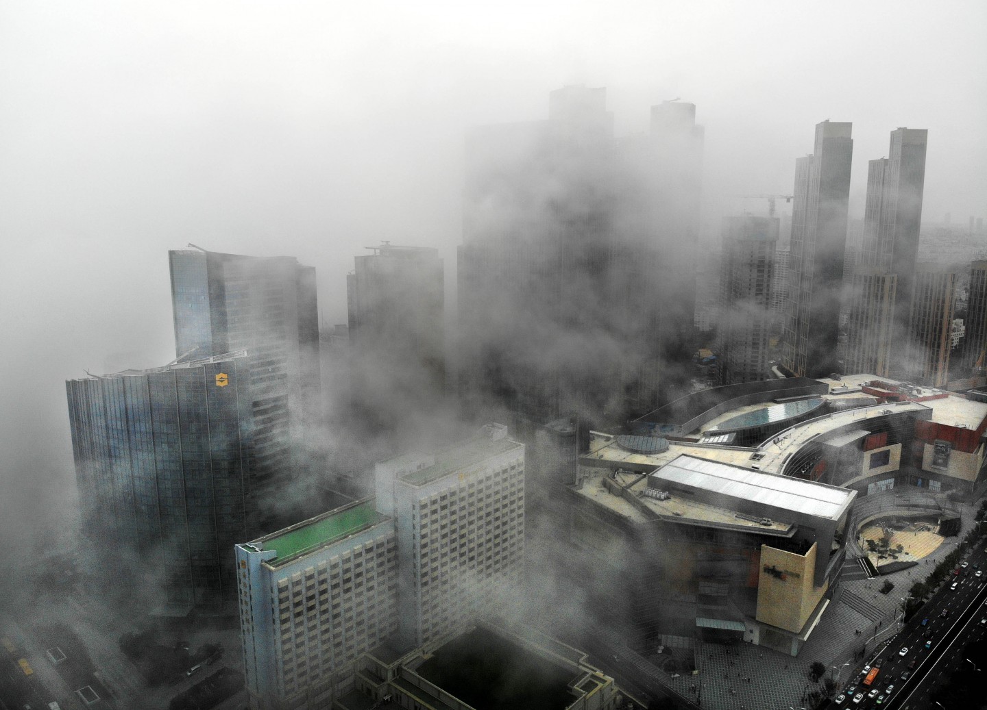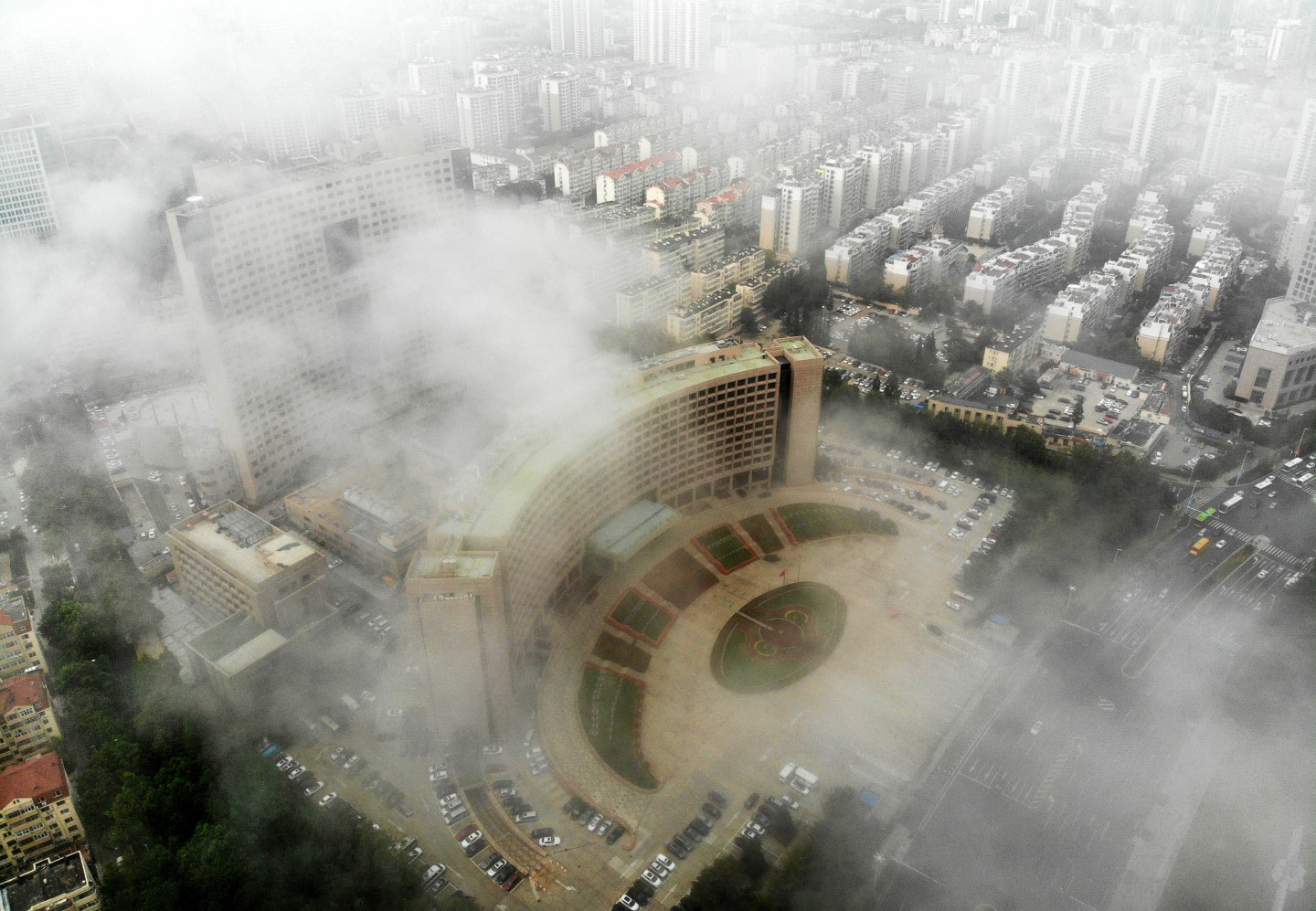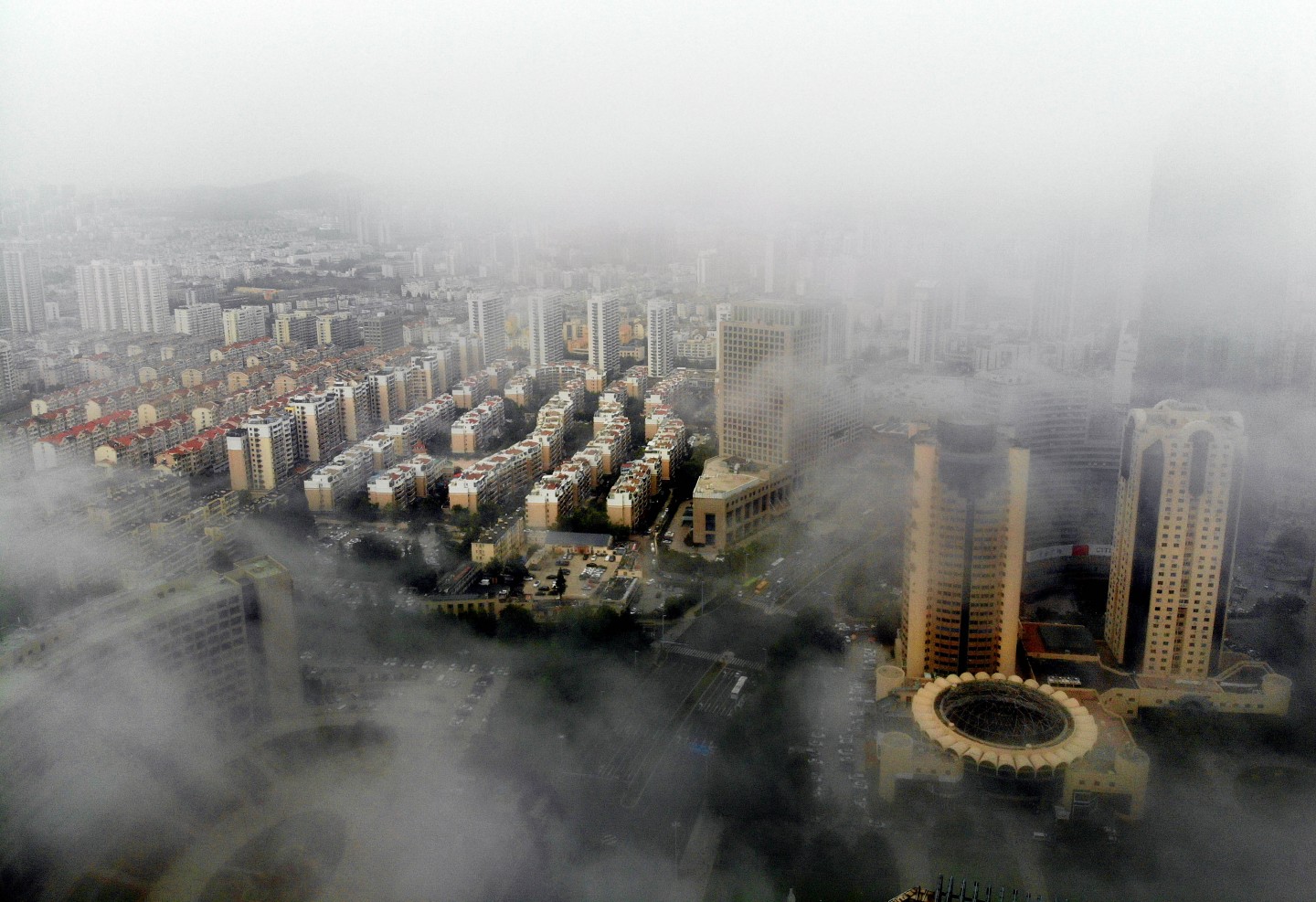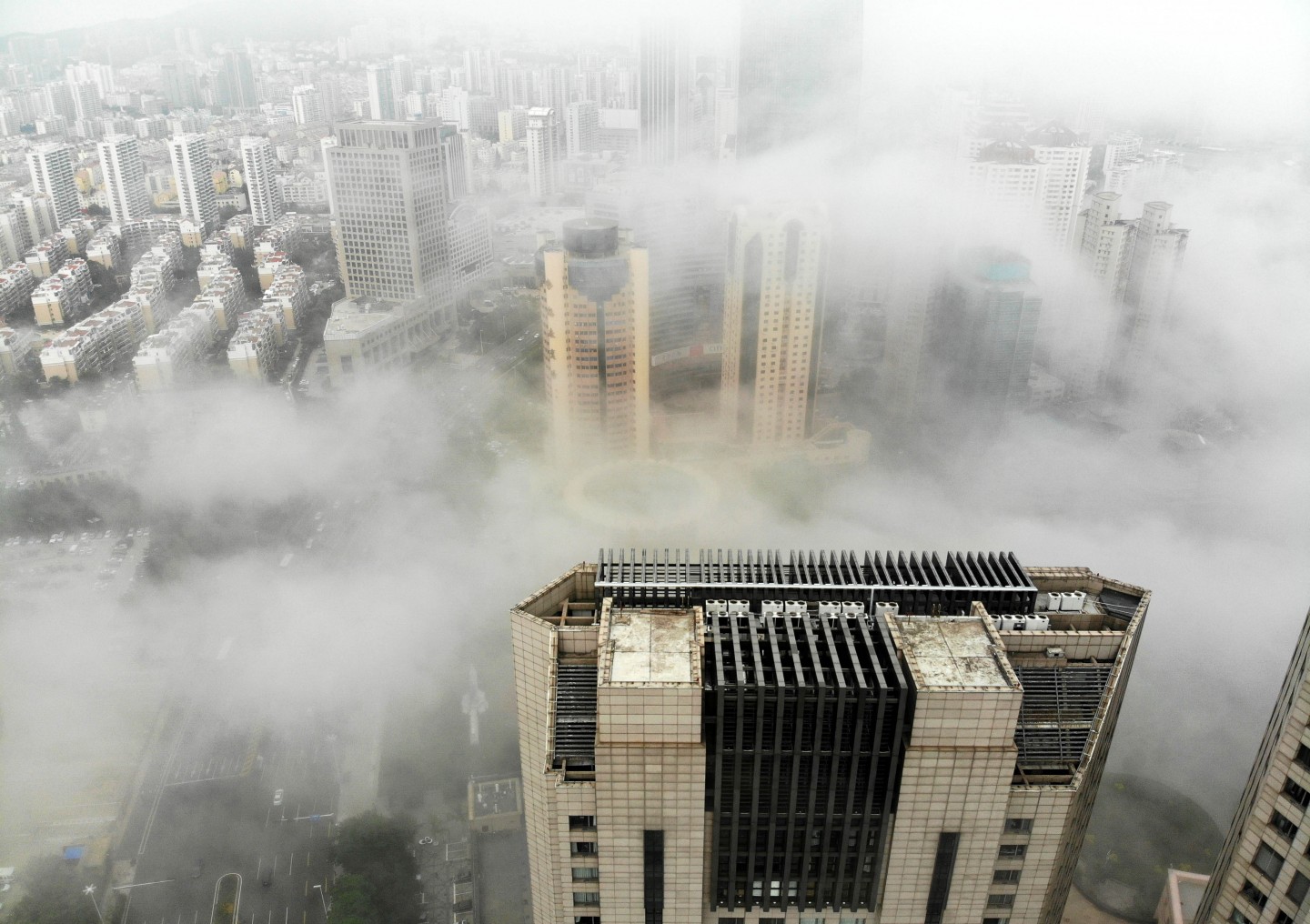 Fotogrāfi iemūžinājuši, cik bieza migla trešdienas rītā ieskāvusi ainavas provincē Ķīnas austrumos.