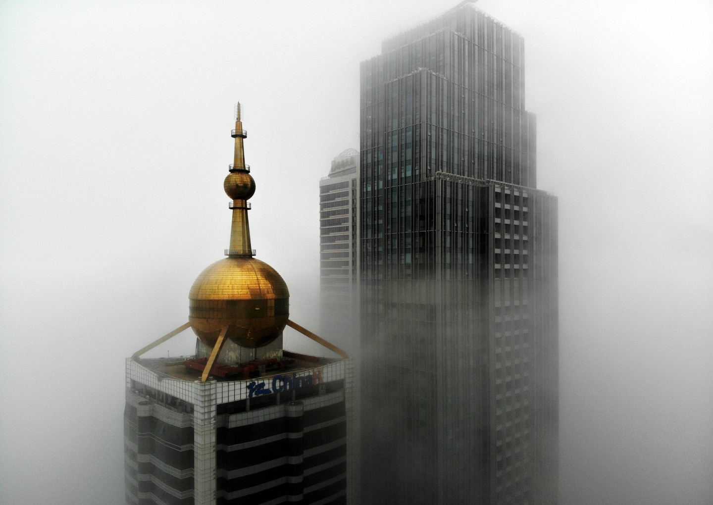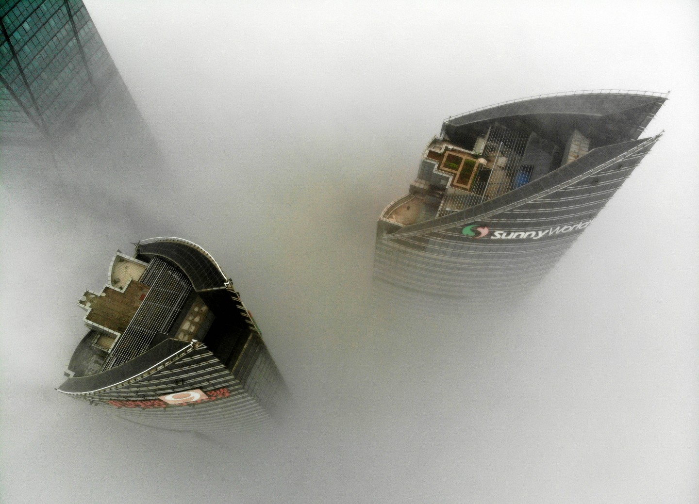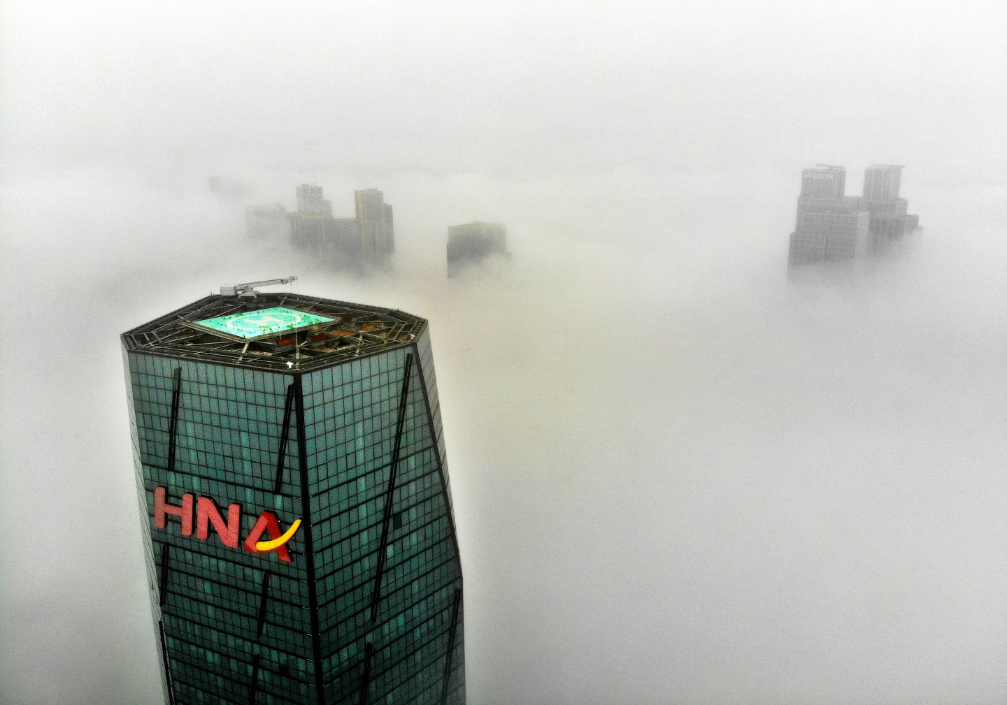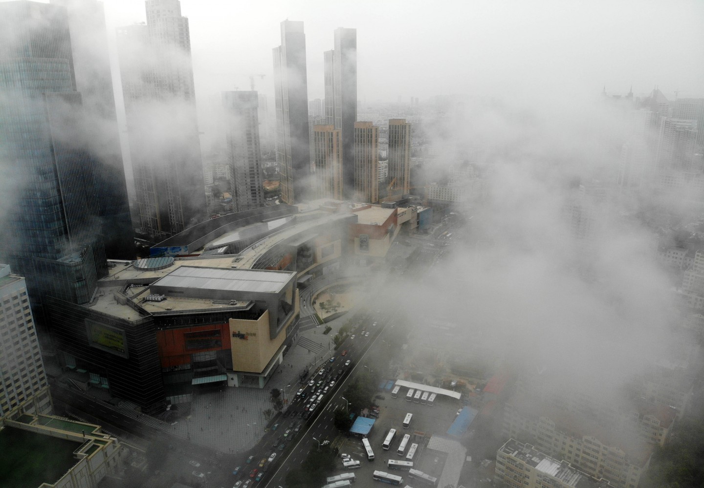 Fotogrāfi iemūžinājuši, cik bieza migla trešdienas rītā ieskāvusi ainavas provincē Ķīnas austrumos.