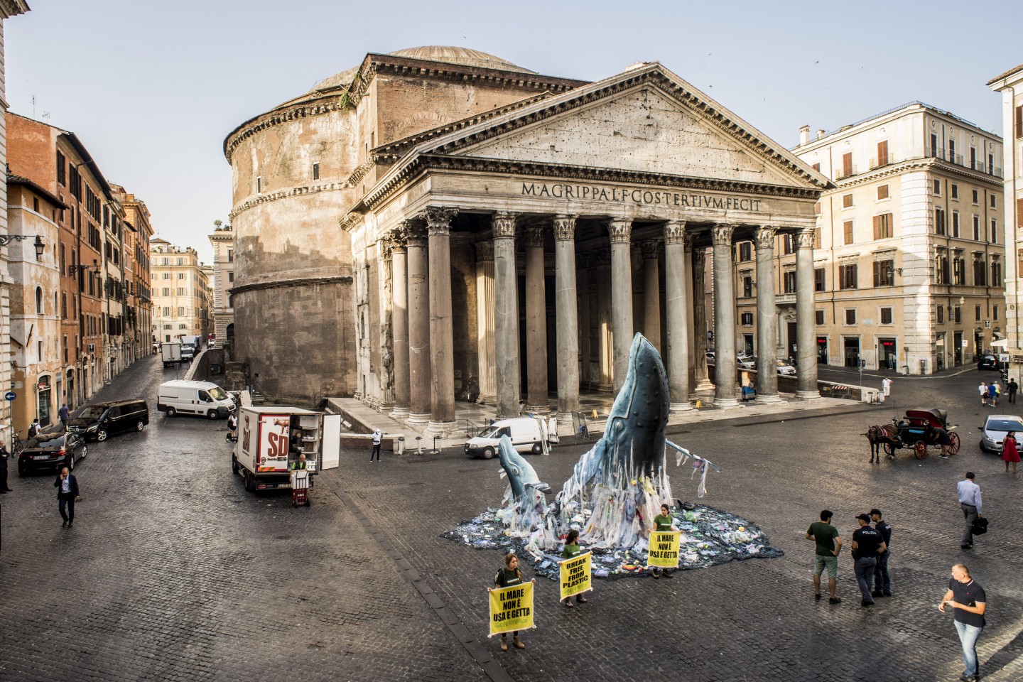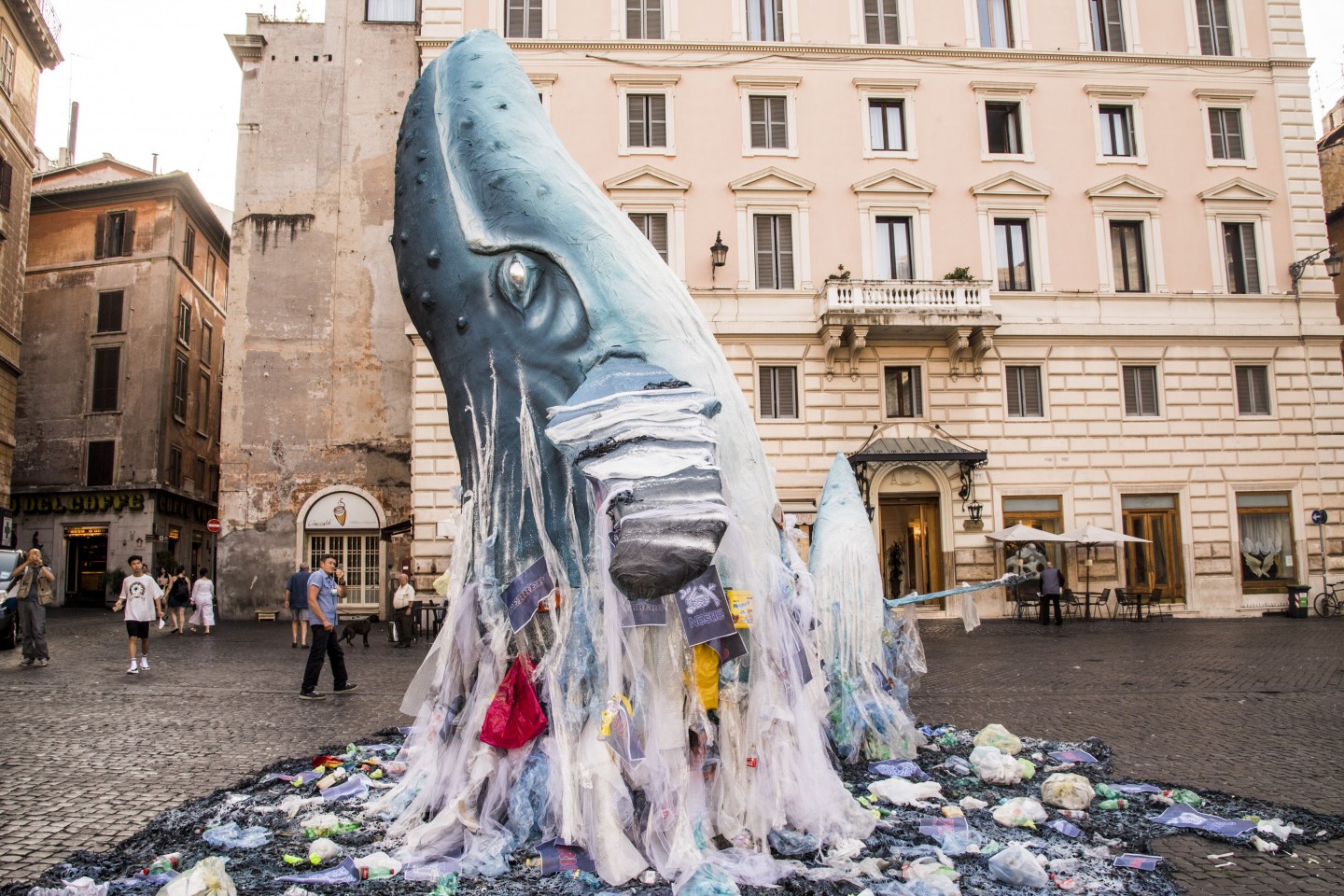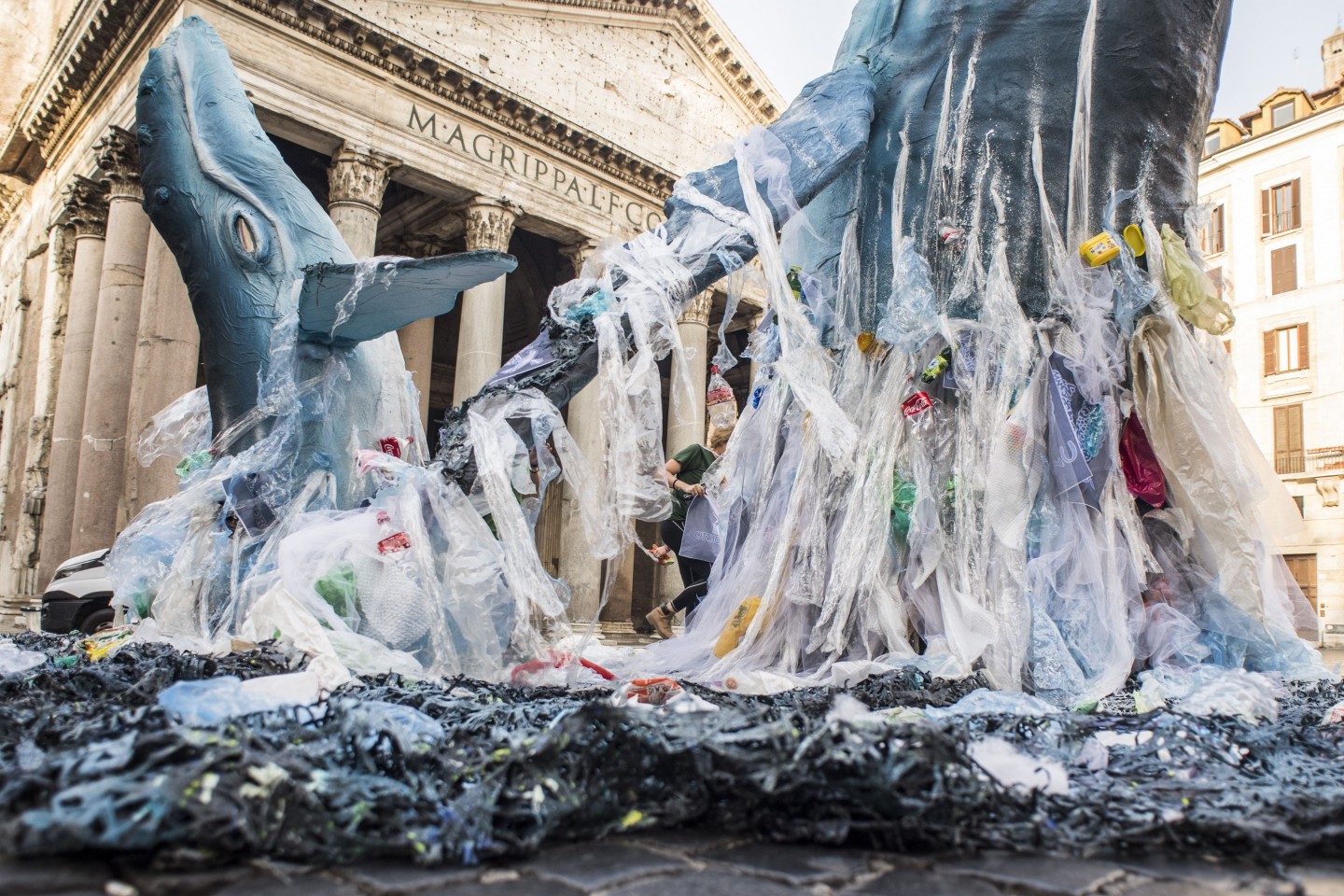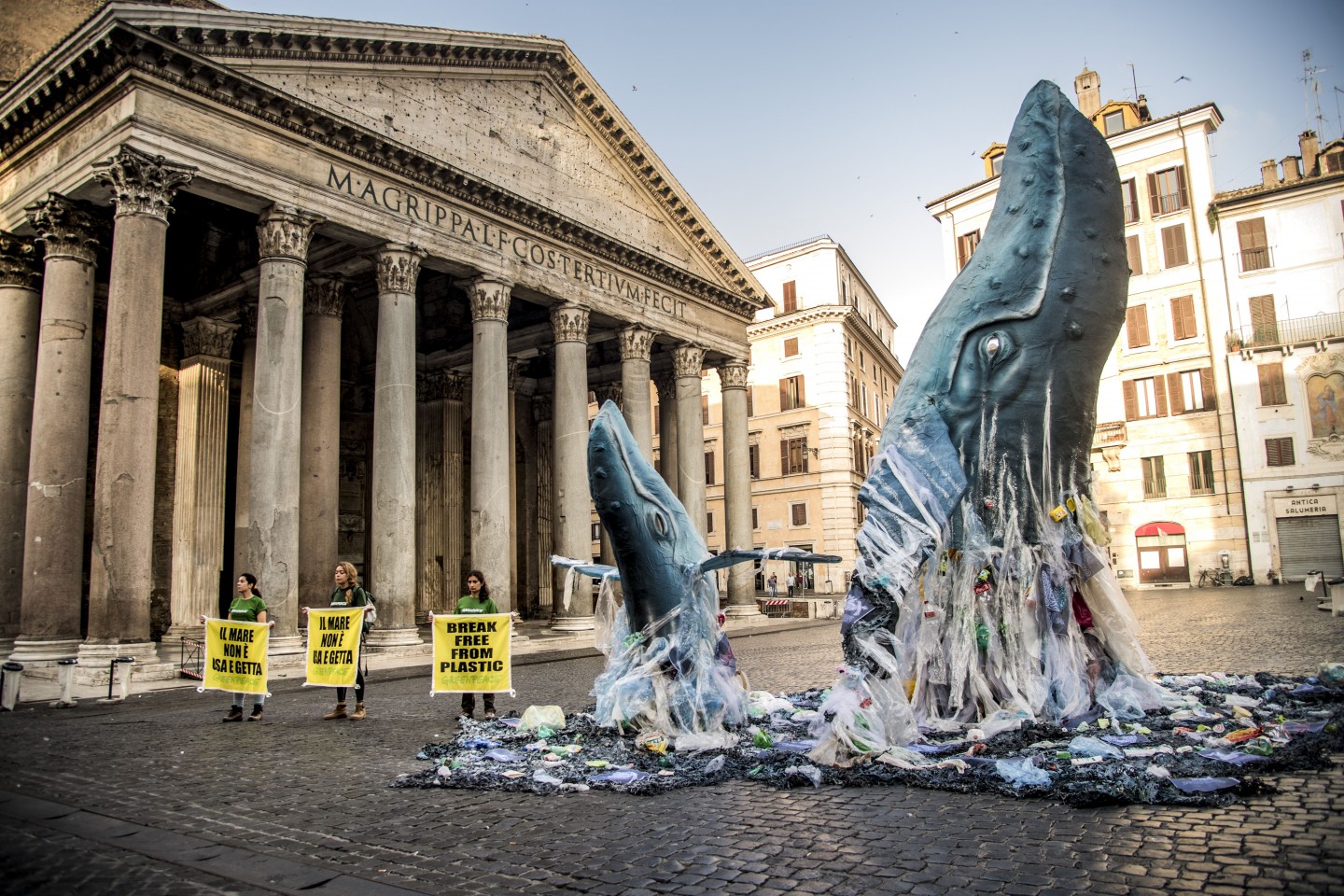 Itālijas galvaspilsēta Romā ''Greenpeace'' uzstādījuši instalāciju, kuras mērķis ir rosināt apziņu par Vidusjūras piesārņojumu. Tajā attaisnoti no plastmasas jūras iznirstoši vaļi.