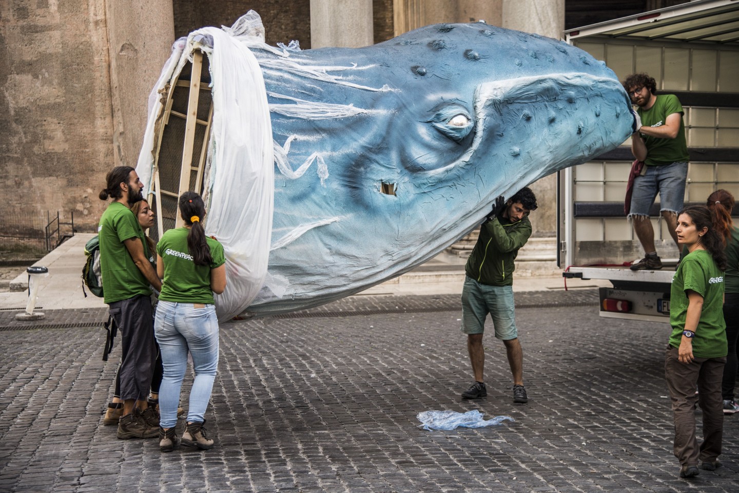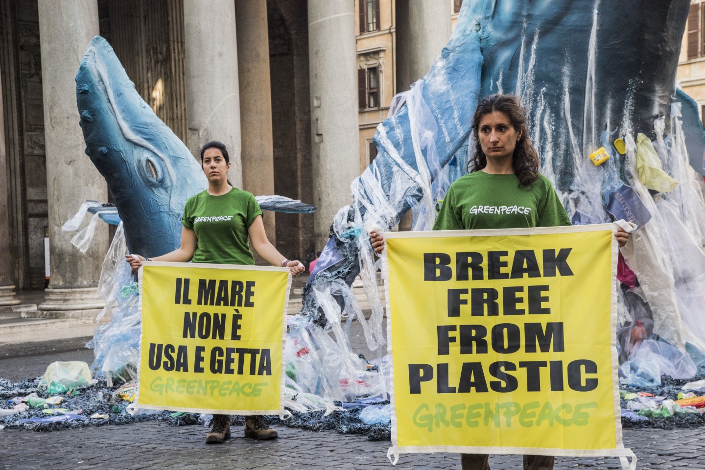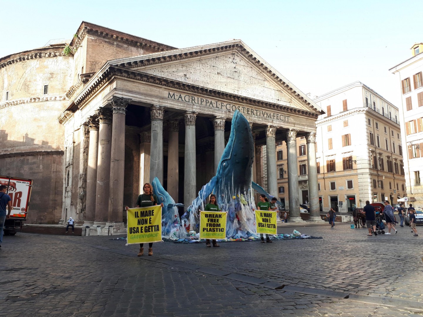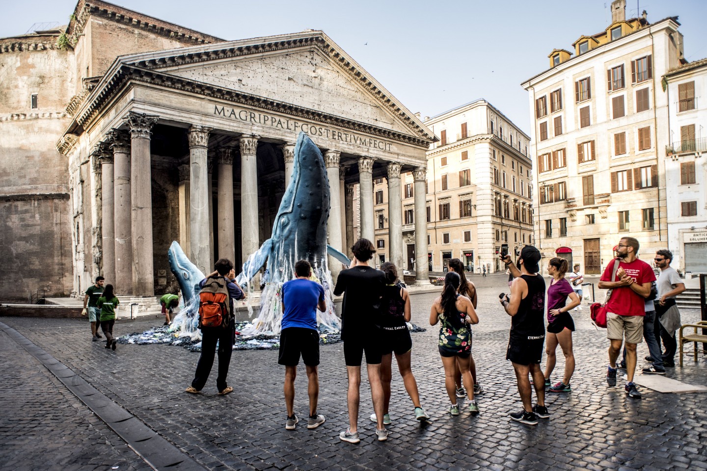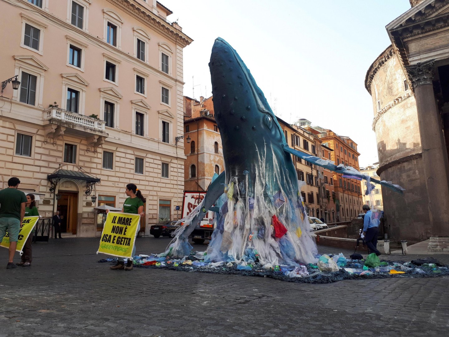 Itālijas galvaspilsēta Romā ''Greenpeace'' uzstādījuši instalāciju, kuras mērķis ir rosināt apziņu par Vidusjūras piesārņojumu. Tajā attaisnoti no plastmasas jūras iznirstoši vaļi.