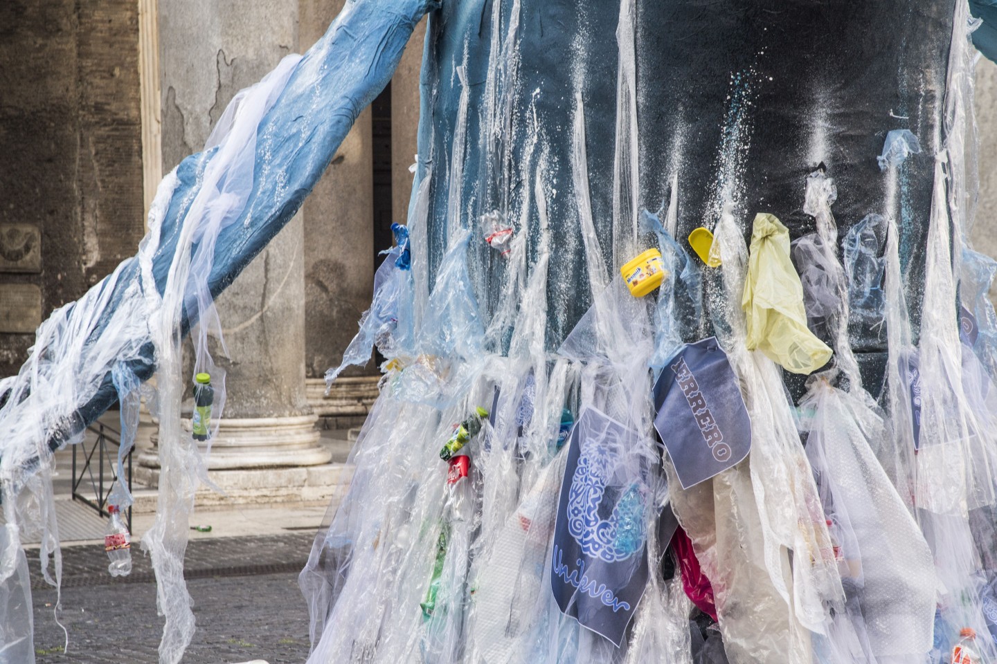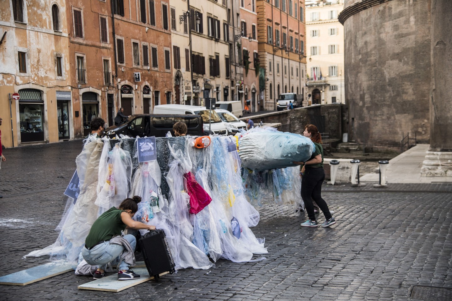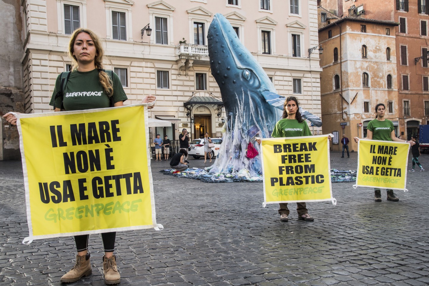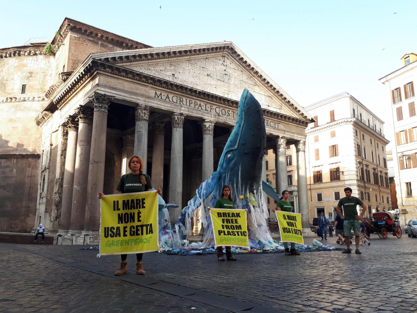 Itālijas galvaspilsēta Romā ''Greenpeace'' uzstādījuši instalāciju, kuras mērķis ir rosināt apziņu par Vidusjūras piesārņojumu. Tajā attaisnoti no plastmasas jūras iznirstoši vaļi.