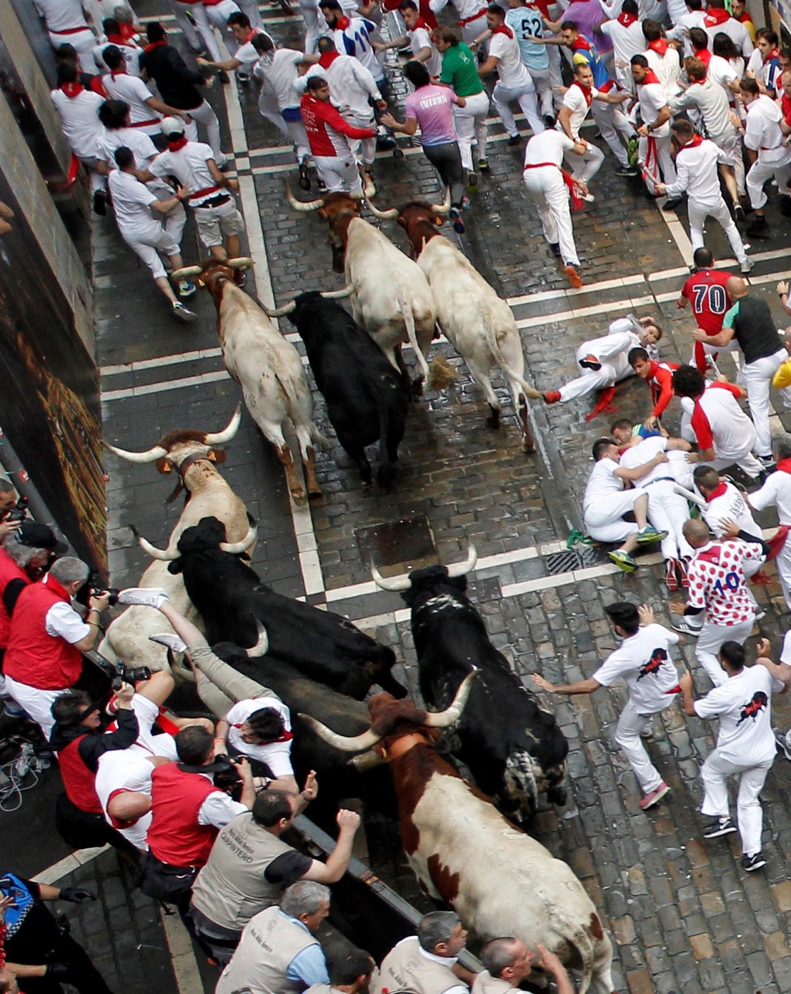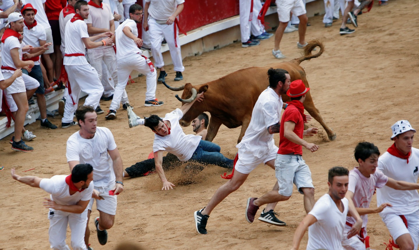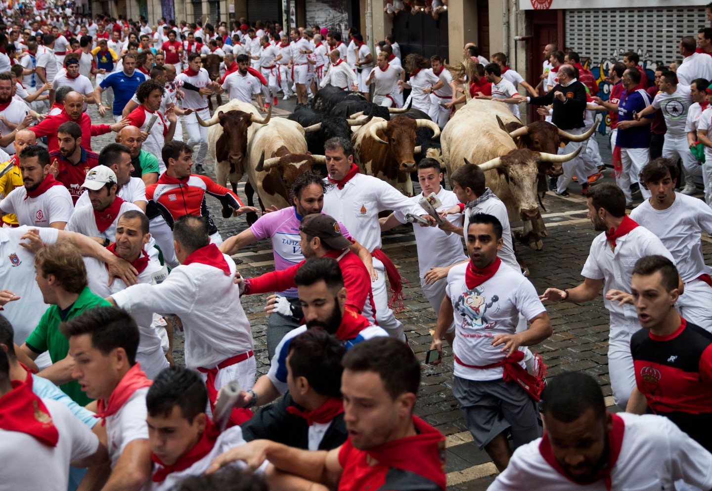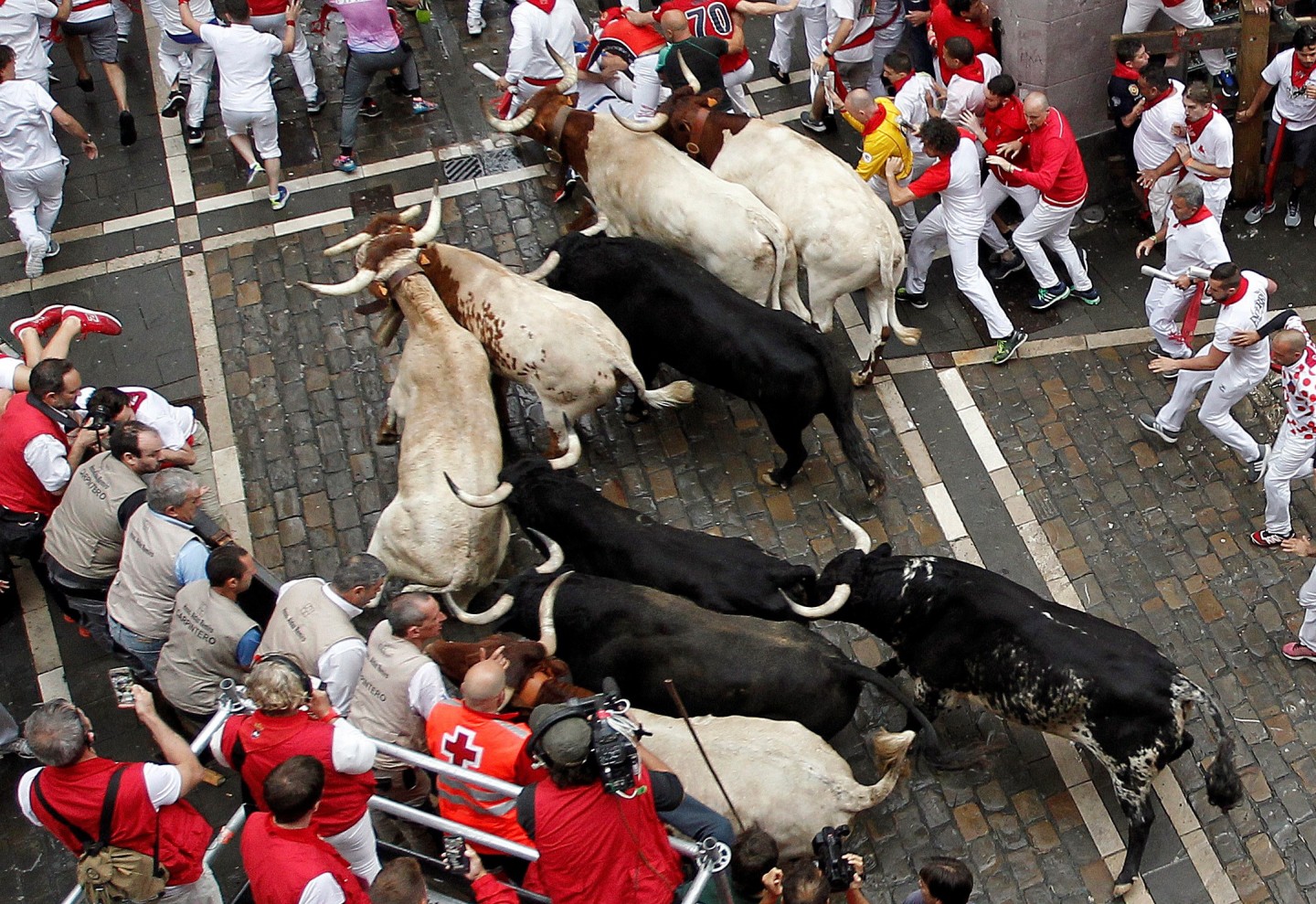 Ikgadējā Svētā Fermina festivāla vēršu skrējienā Pamplonā sestdien ievainoti pieci cilvēki, tostarp vismaz vienu sabadījis vērsis, paziņojuši mediķi. Šis bija festivāla pirmais vēršu skrējiens, kuru 550 līdz 630 kilogramus smagie vērši mēroja aptuveni divās minūtēs. Lietus pirms skrējiena sākuma padarīja slidenas šaurās ieliņas, pa kuriem vērši skrēja uz arēnu, kur vakarā tiks nogalināti vēršu cīņā un vēlāk servēti pilsētas restorānos. Vēršu skrējieni Pamplonā notiek kopš 1911.gada. Katru rītu plkst.8 seši cīņu vērši tiek izlaisti brīvībā senās pilsētas centra ielās, pa kurām skrien uz arēnu. Drosminieki skrien līdzās vēršiem, apbruņojušies ar sarullētām avīzēm, tomēr daudzi dalībnieki pārkāpj noteikumus un pieskaras dzīvniekiem ar rokām. Tiek uzskatīts, ka vēršu skrējieni aizsākušies XVI gadsimtā. Pasākums kļuva slavens, pateicoties Ernesta Hemingveja 1926.gada romānam "Un saule lec", un tagad uz pilsētu, kurā dzīvo ap 200 000 cilvēku, ik gadu dodas simtiem tūkstošu apmeklētāju no visas pasaules. Turklāt vēl vairāki miljoni cilvēku pie televīzijas ekrāniem ik gadu vēro atklāšanas ceremoniju un ikrīta vēršu skrējienus. Kopš 1911.gada vēršu skrējienu laikā dzīvību zaudējuši 15 cilvēki. Pēdējais letālais gadījums bija 2009.gadā, kad vērsis sabadīja kādu 27 gadus vecu spāni kaklā, sirdī un plaušās.