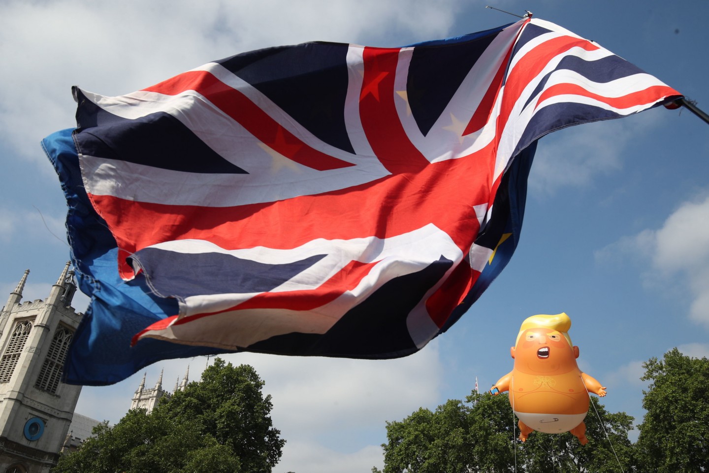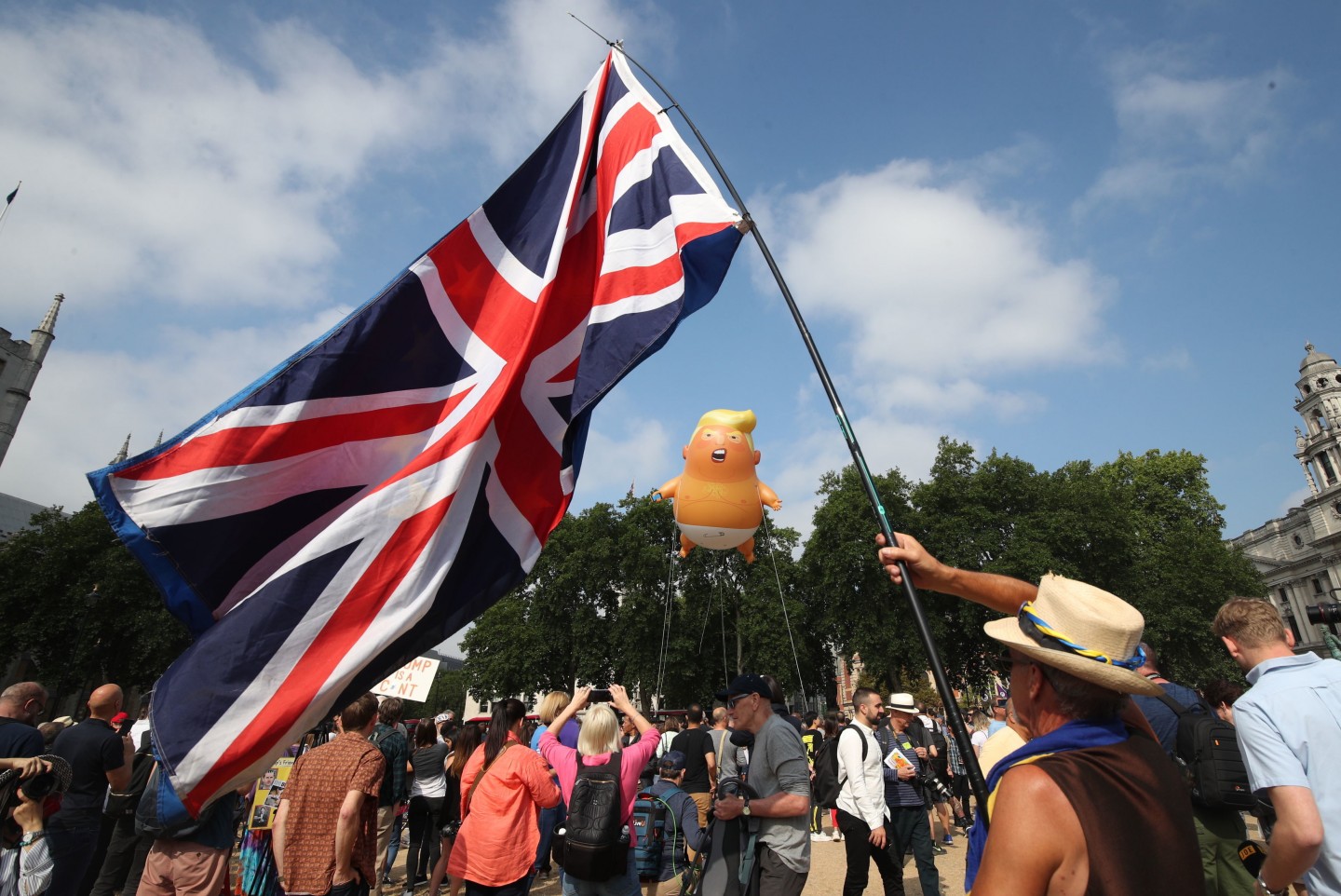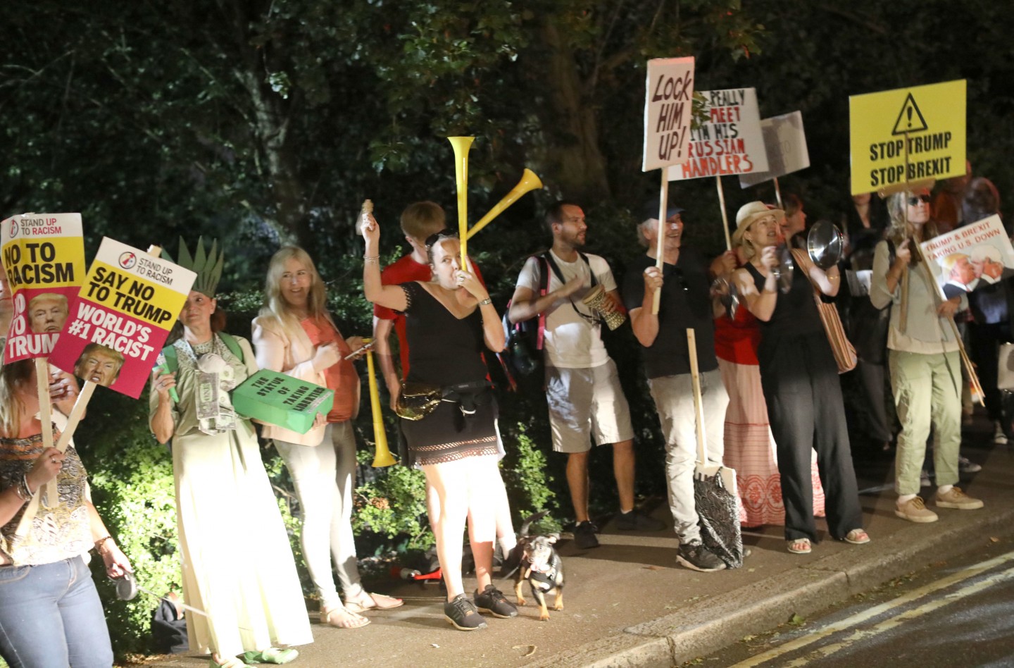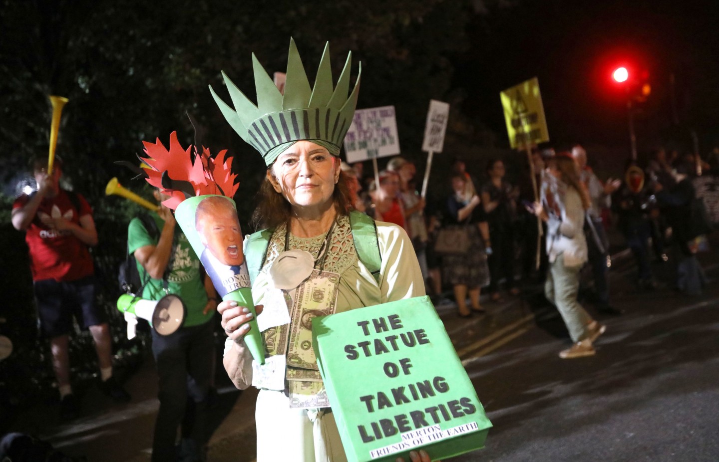 Tramps ceturtdienas pēcpusdienā ieradās valsts vizītē Lielbritānijā, kur viņu oficiālās vakariņās Blenimas pilī sagaidīja premjerministre Terēza Meja. Pie ASV vēstniecības notika protests pret Trampu, kā arī piektdien virs Londonas pacēlās piepūšamā lelle "Mazulis Tramps".