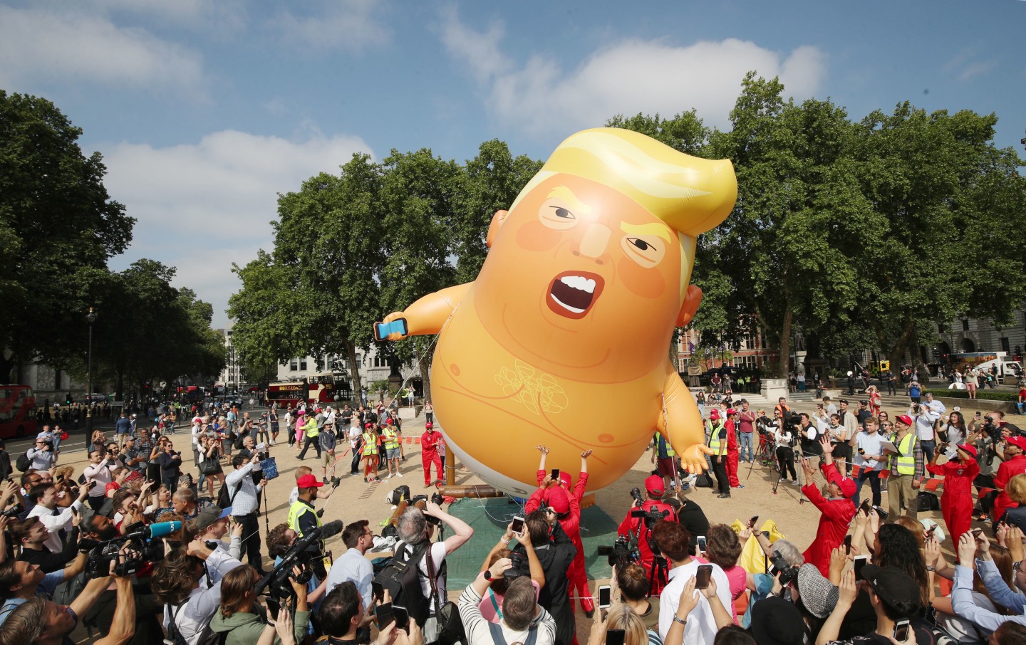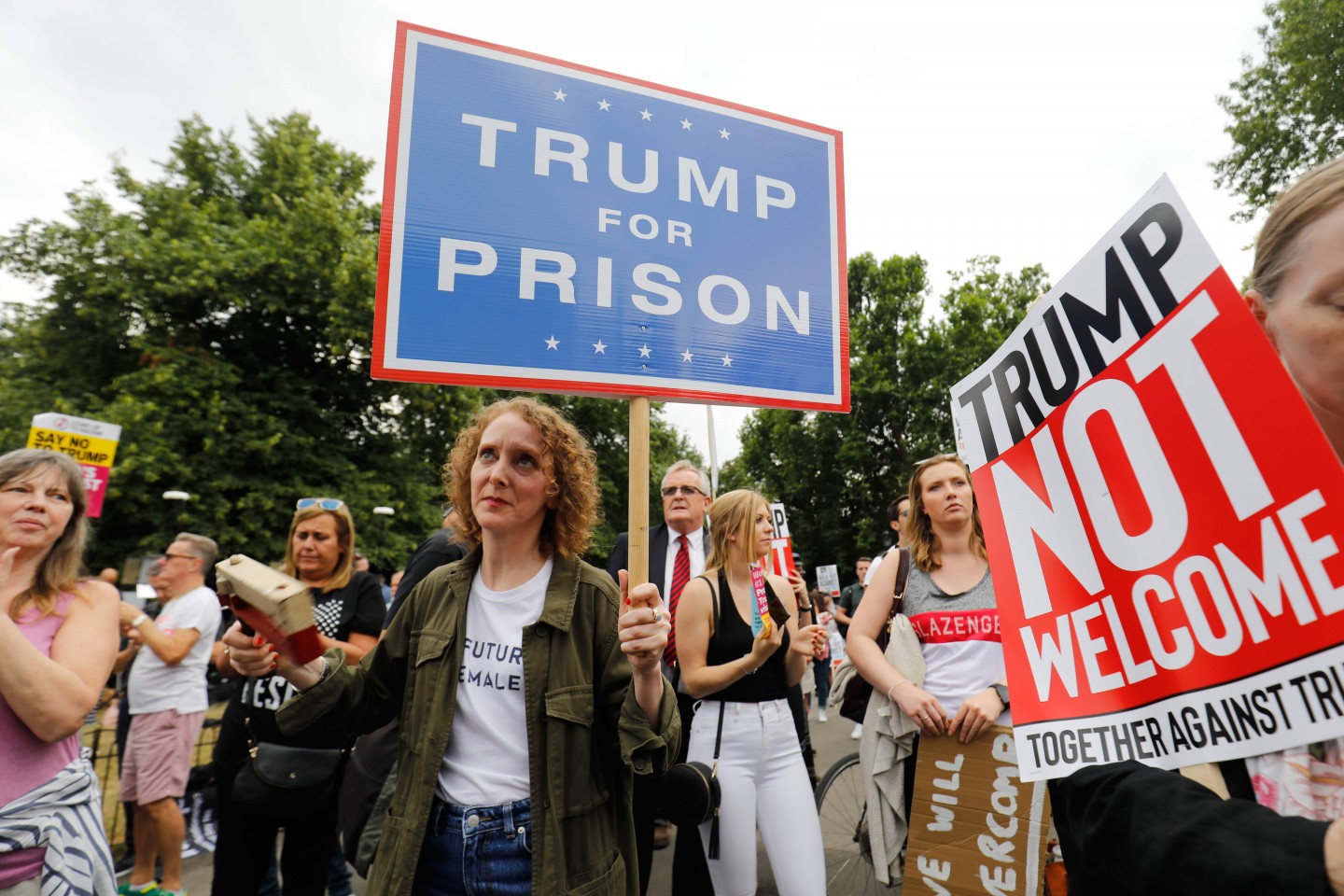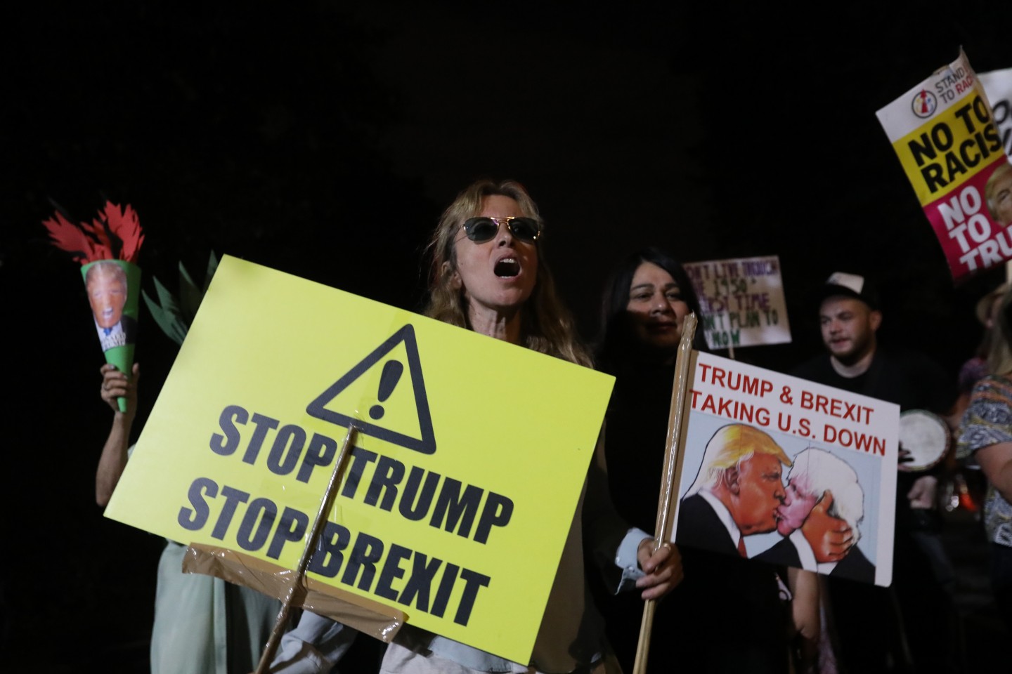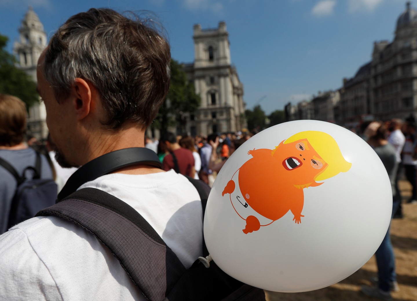 Tramps ceturtdienas pēcpusdienā ieradās valsts vizītē Lielbritānijā, kur viņu oficiālās vakariņās Blenimas pilī sagaidīja premjerministre Terēza Meja. Pie ASV vēstniecības notika protests pret Trampu, kā arī piektdien virs Londonas pacēlās piepūšamā lelle "Mazulis Tramps".
