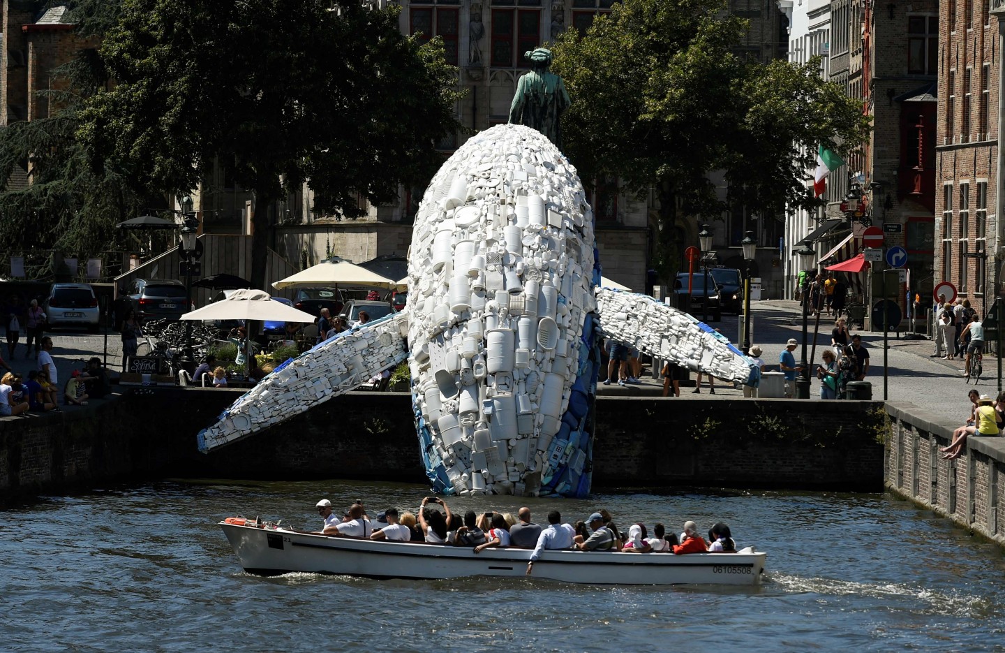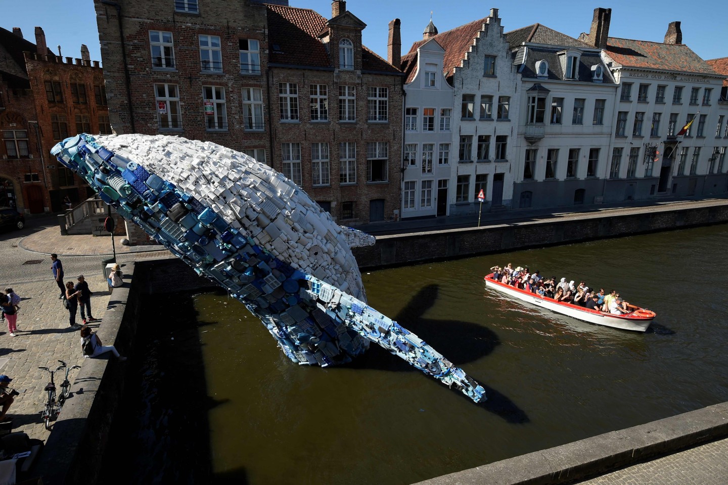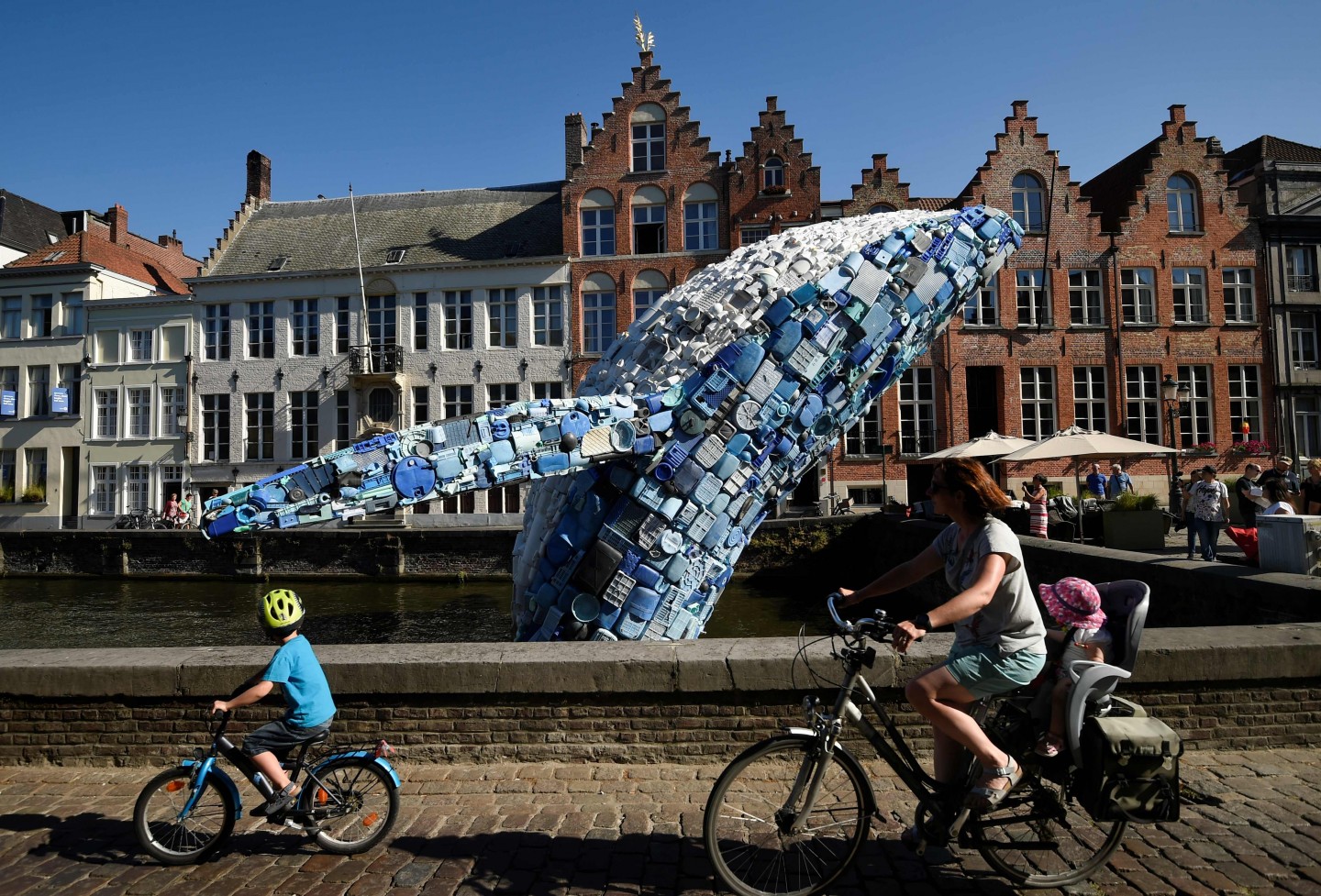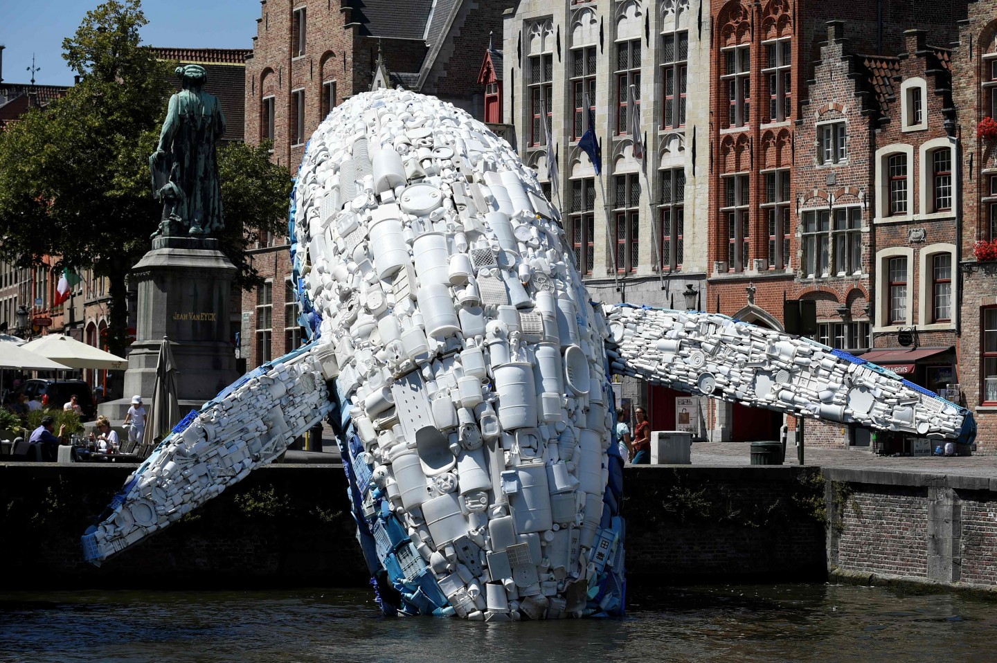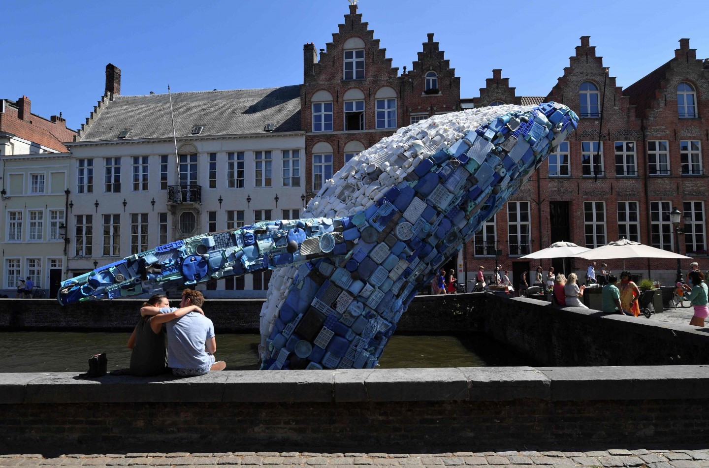 Beļģijas pilsētā Bružā no piecām tonnām plastmasas atkritumu, kuri savākti no Klusā okeāna, izveidota instalācija, kura atgādina vali.