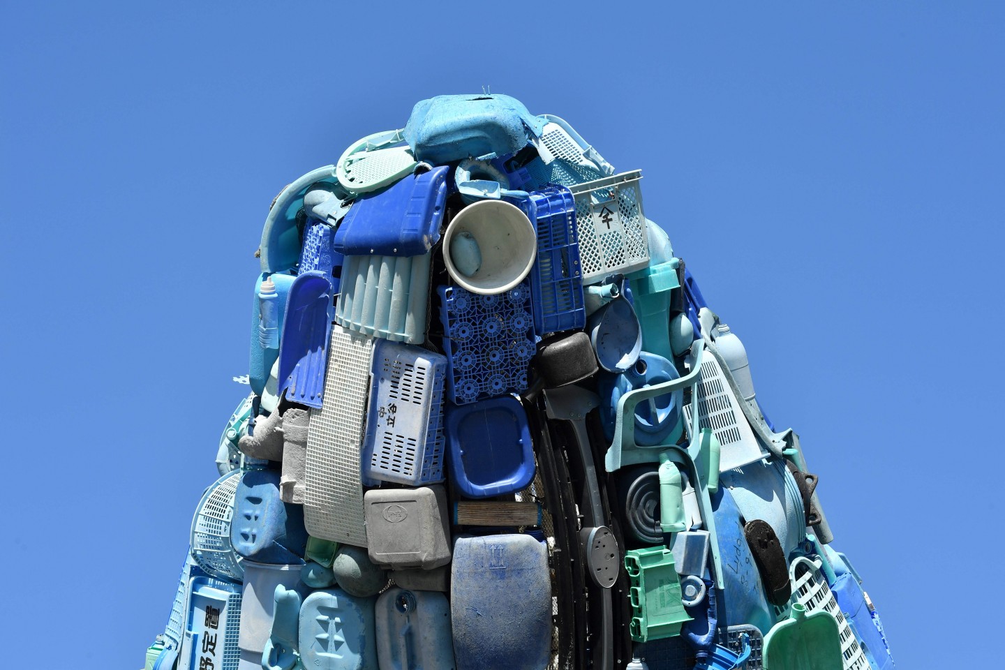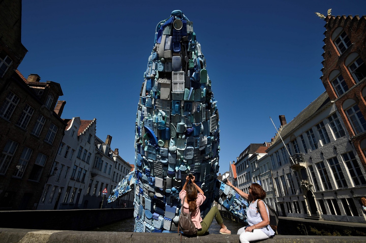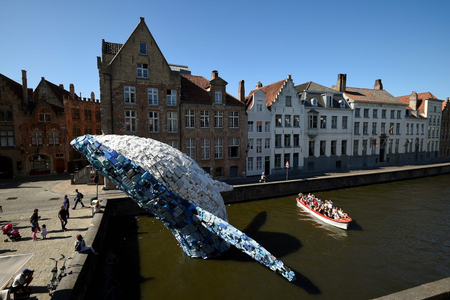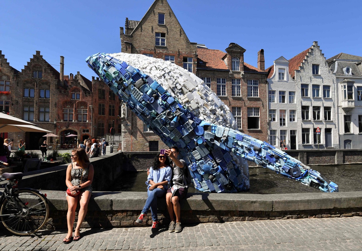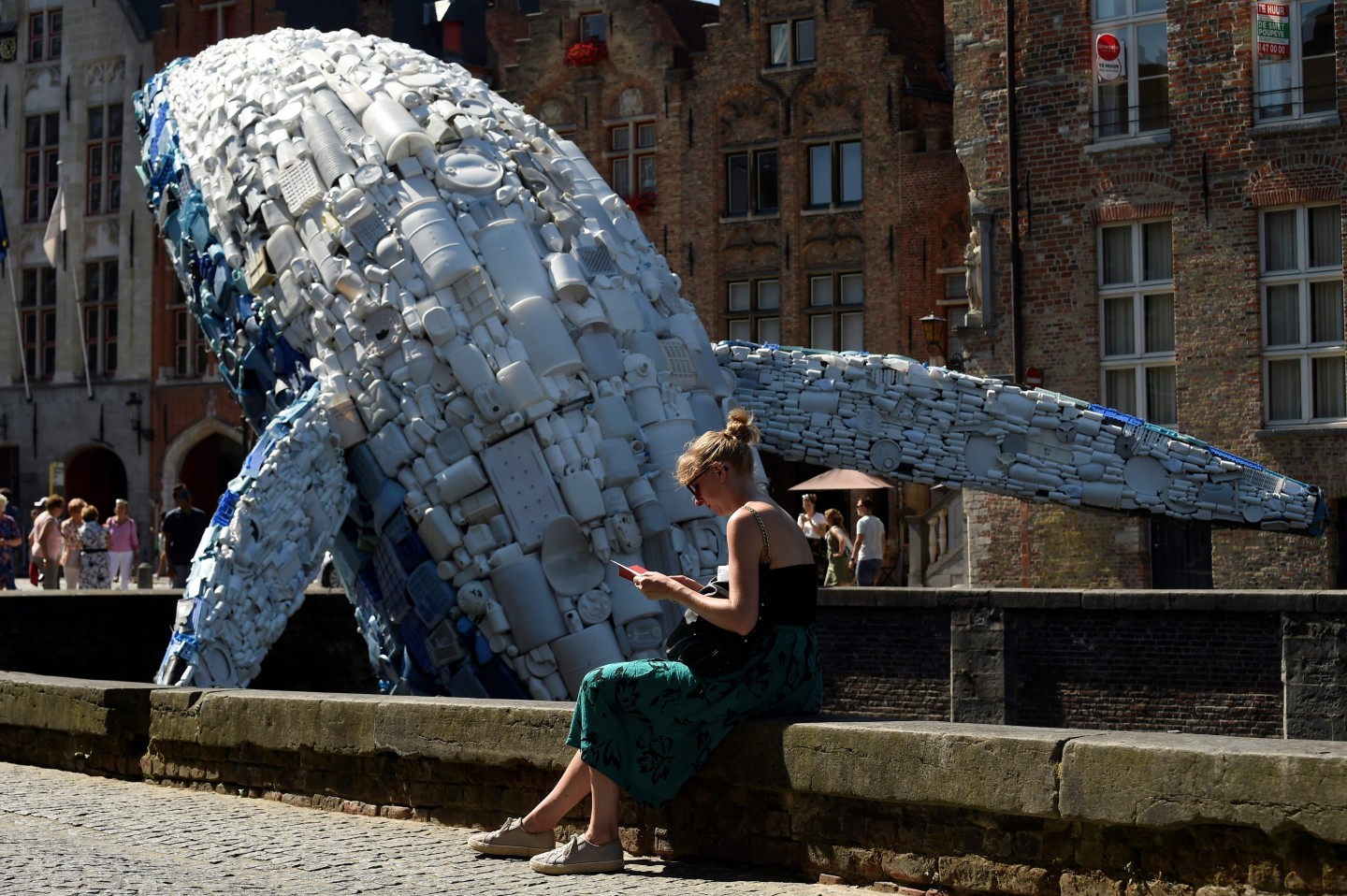 Beļģijas pilsētā Bružā no piecām tonnām plastmasas atkritumu, kuri savākti no Klusā okeāna, izveidota instalācija, kura atgādina vali.