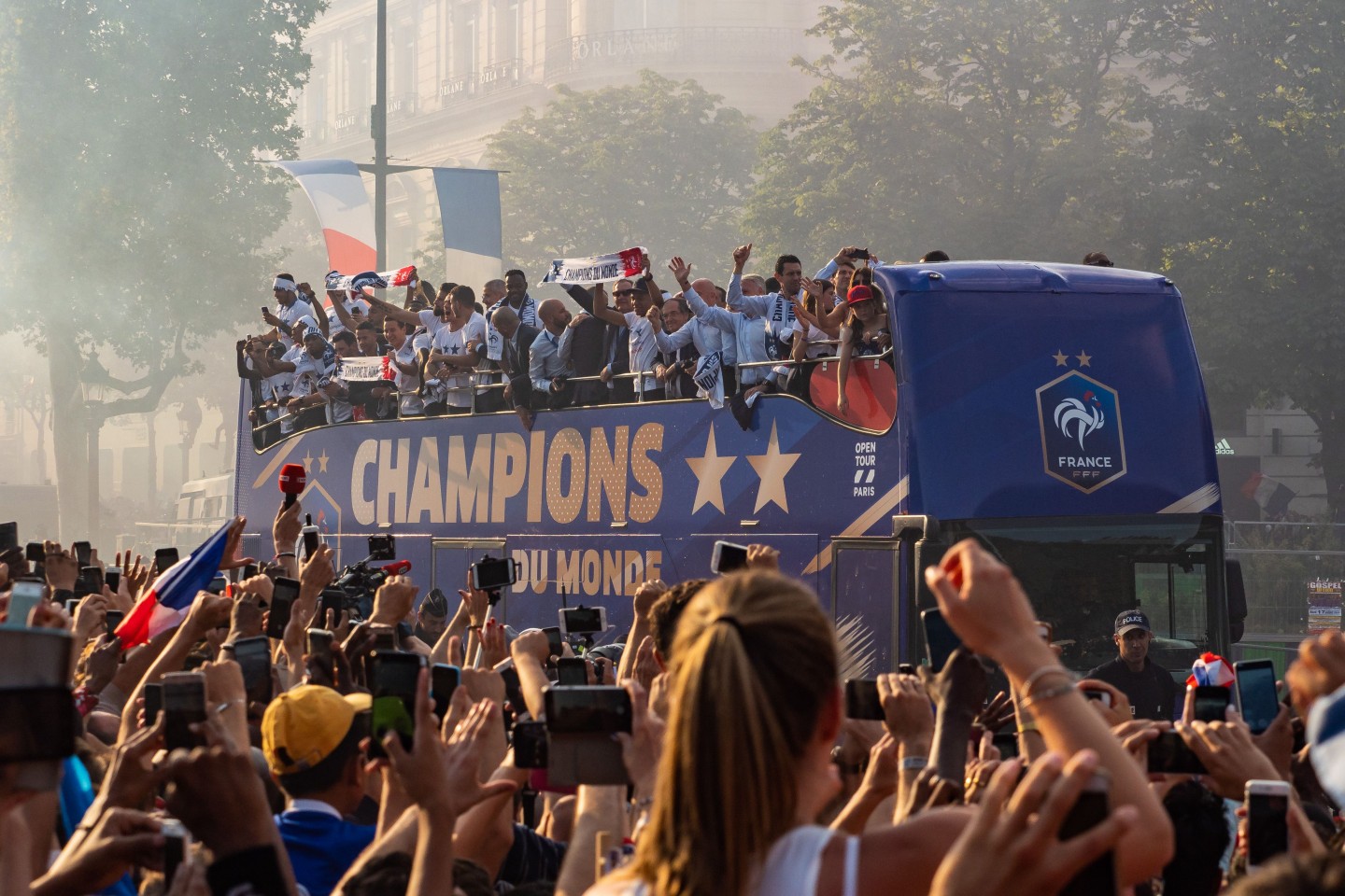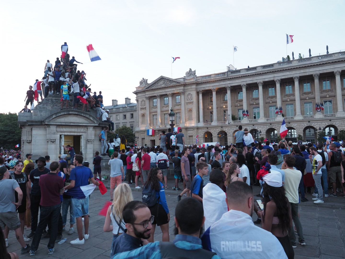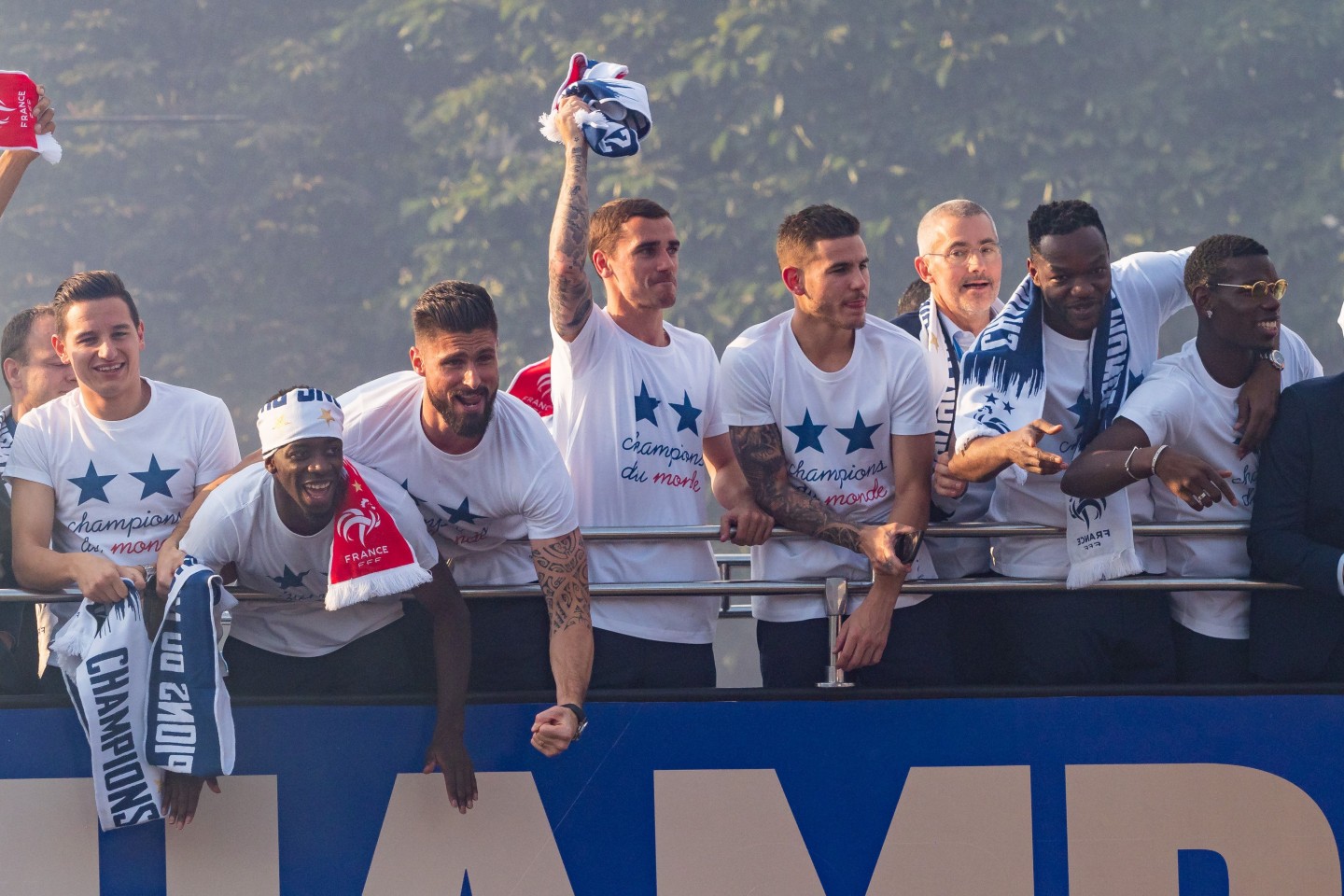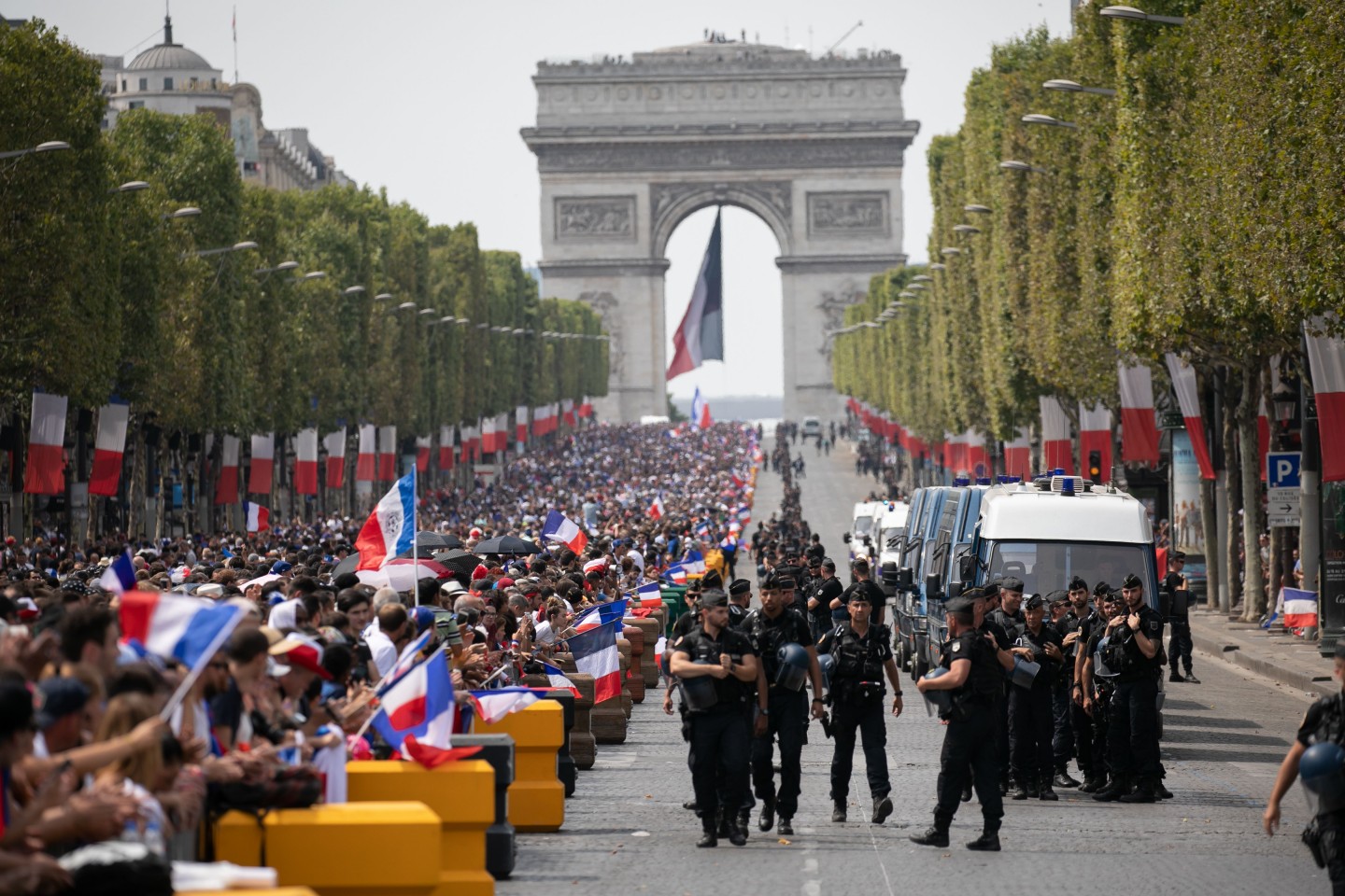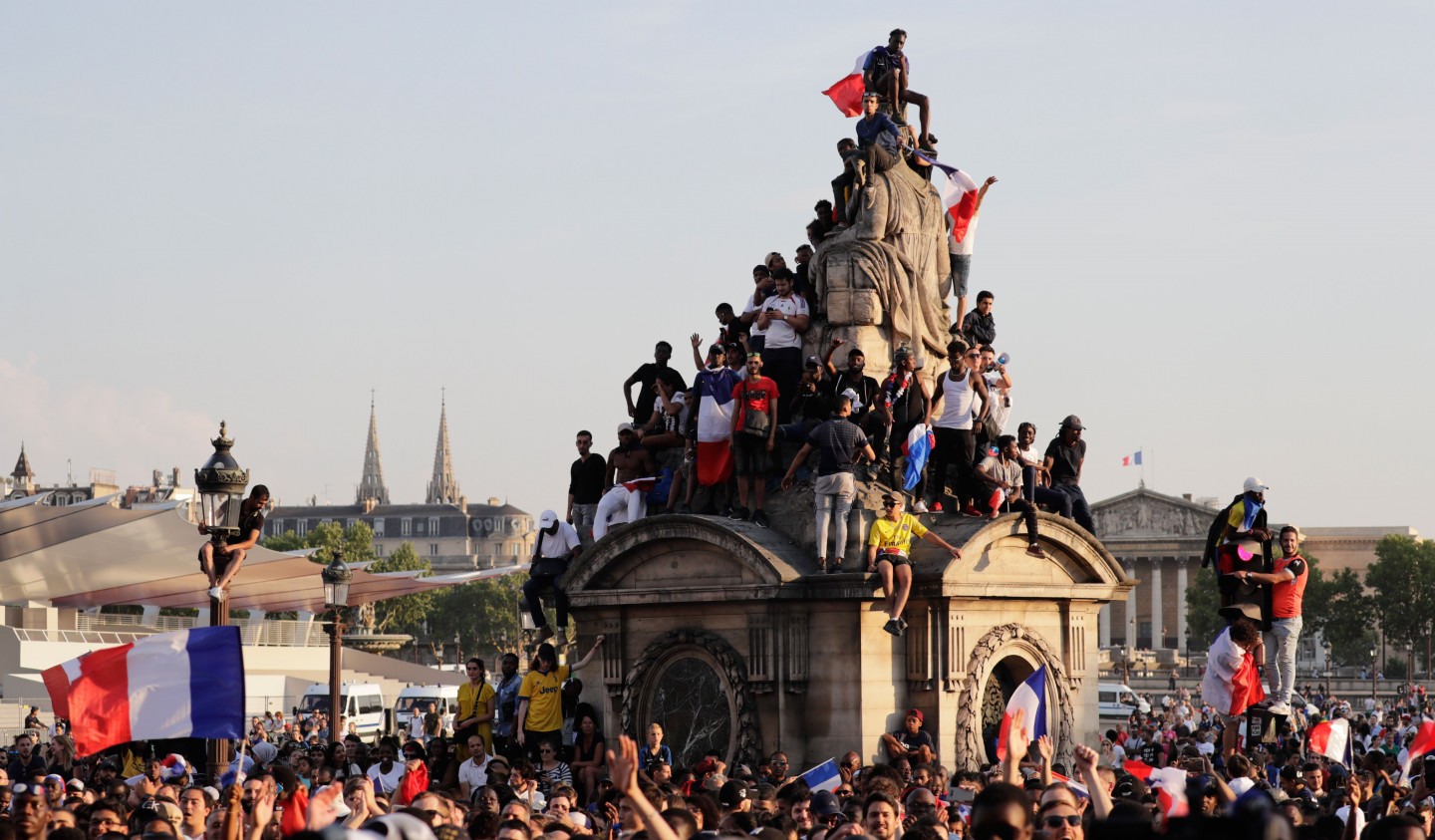 Pirmdienas pēcpusdienā vairāki tūkstoši cilvēku Parīzē sagaidīja Francijas futbola izlasi, kura mājās atgriezās ar Pasaules kausa trofeju.