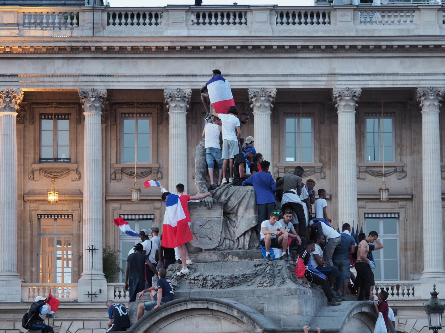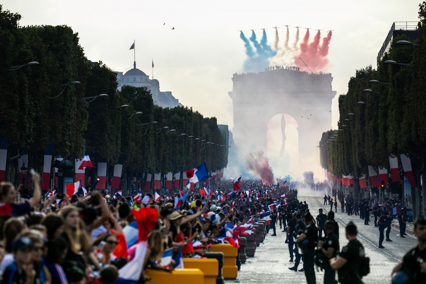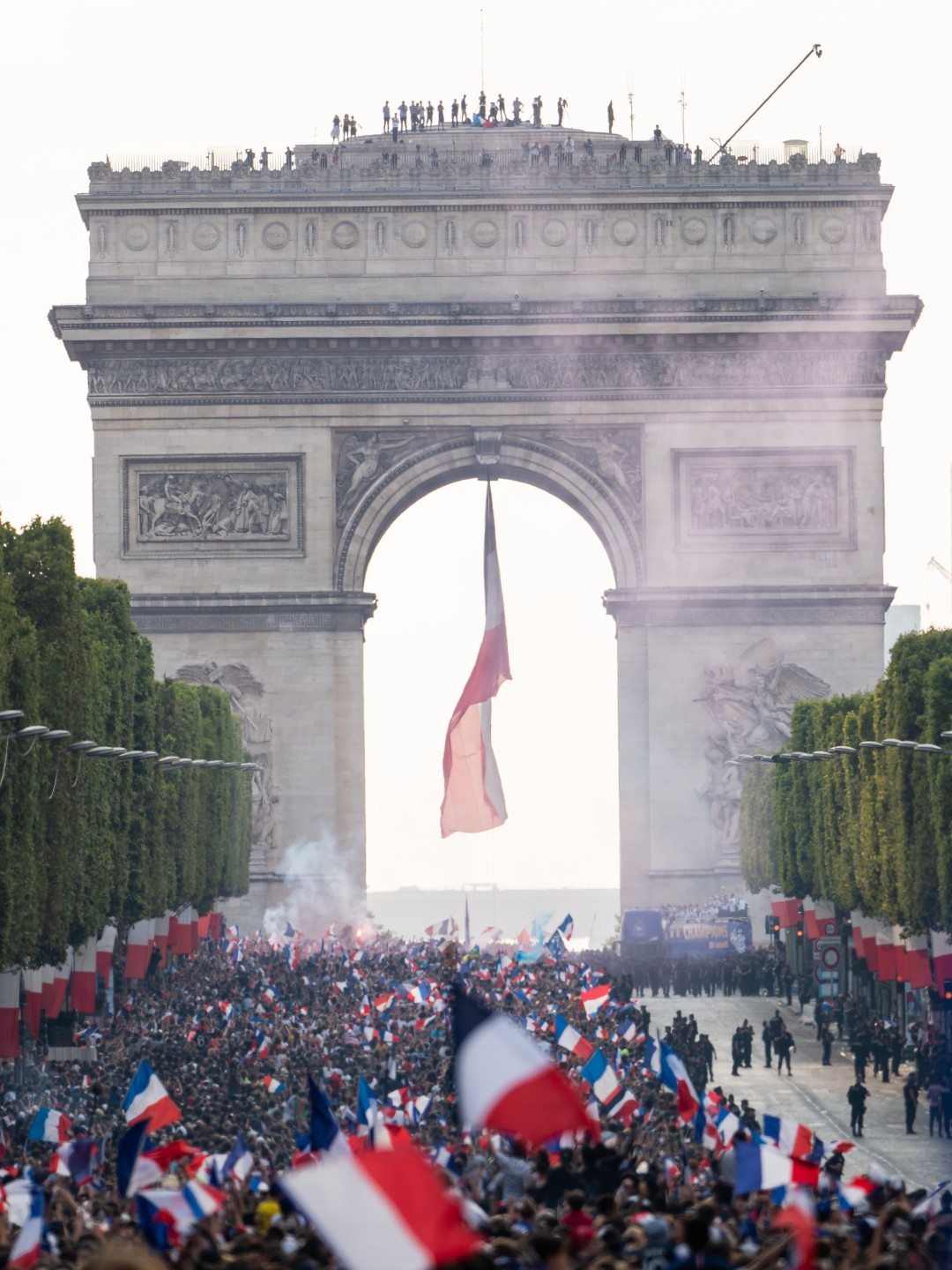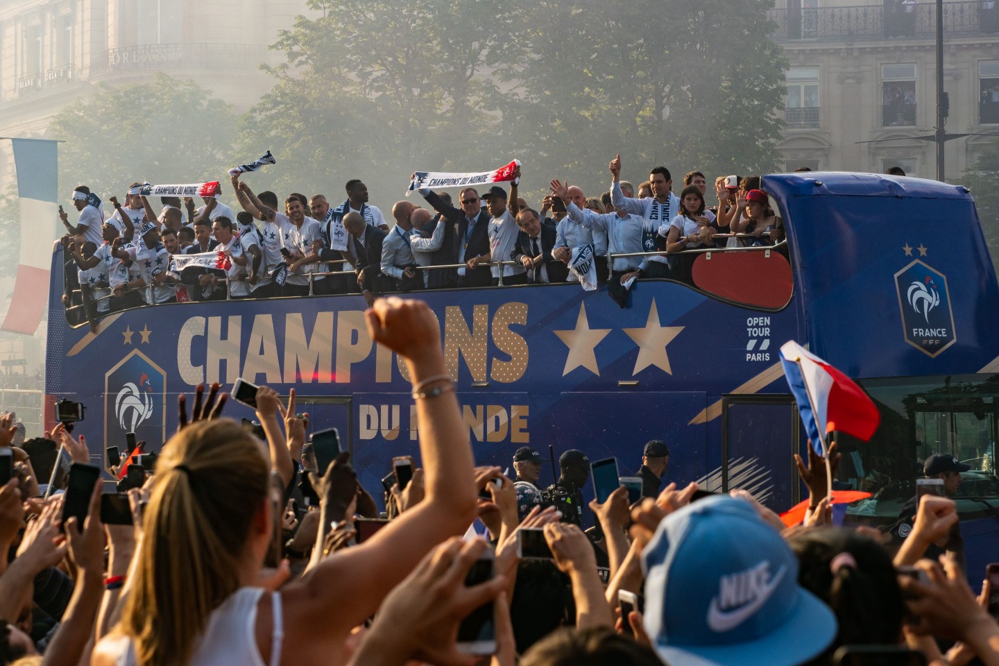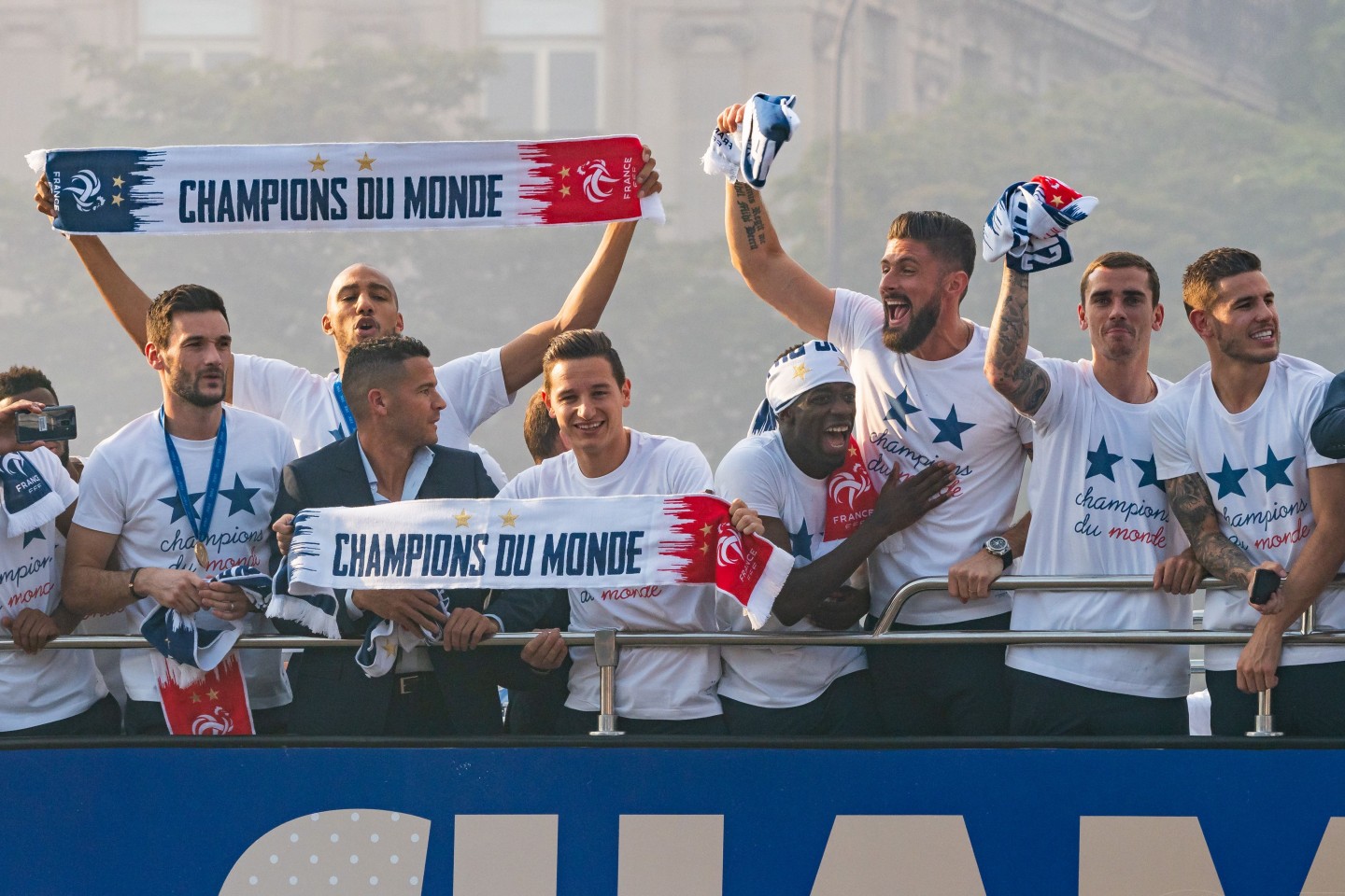 Pirmdienas pēcpusdienā vairāki tūkstoši cilvēku Parīzē sagaidīja Francijas futbola izlasi, kura mājās atgriezās ar Pasaules kausa trofeju.