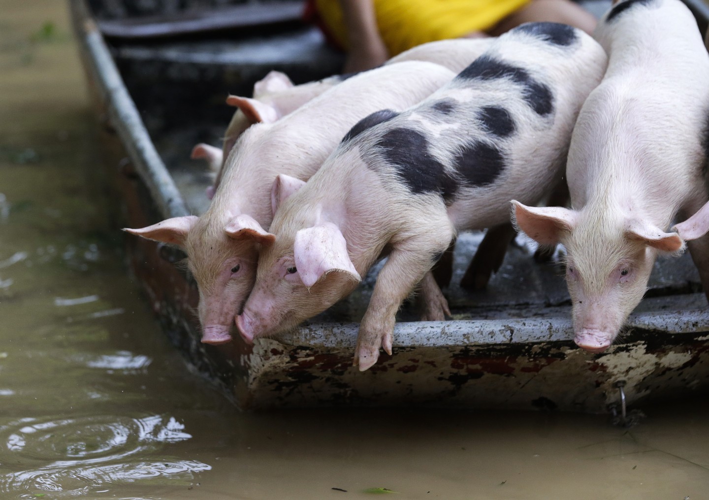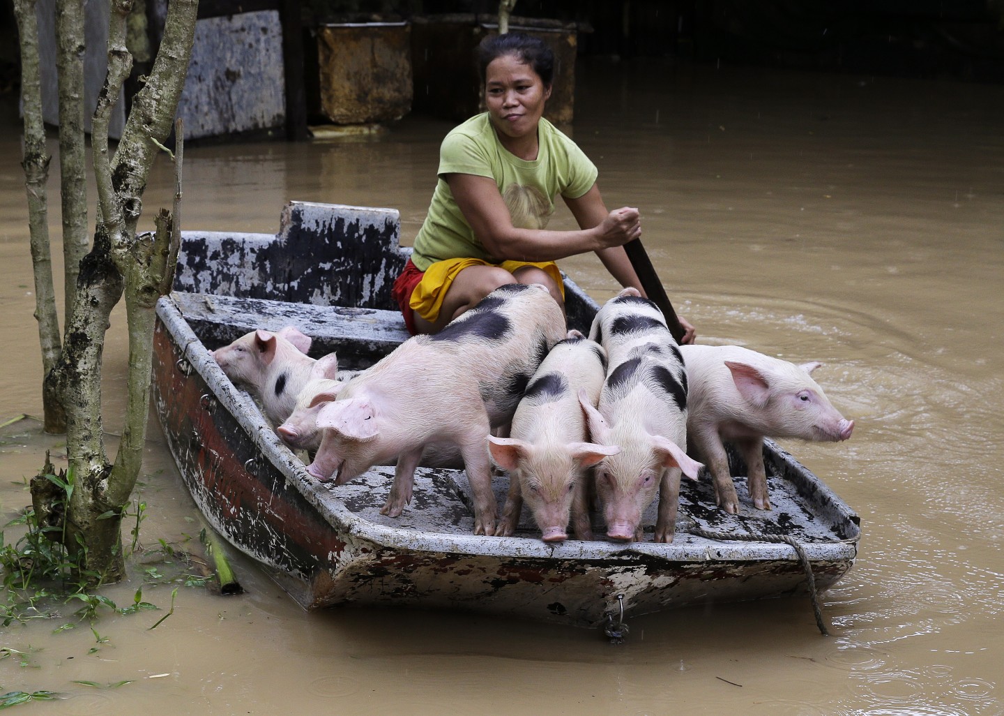 Tropisko vētru skartajai Filipīnu provincei Kezonai nākas pārvarēt pamatīgus plūdus. To ietvaros kāda sieviete ar laivu drošībā nogādājusi vairākus sivēnus.