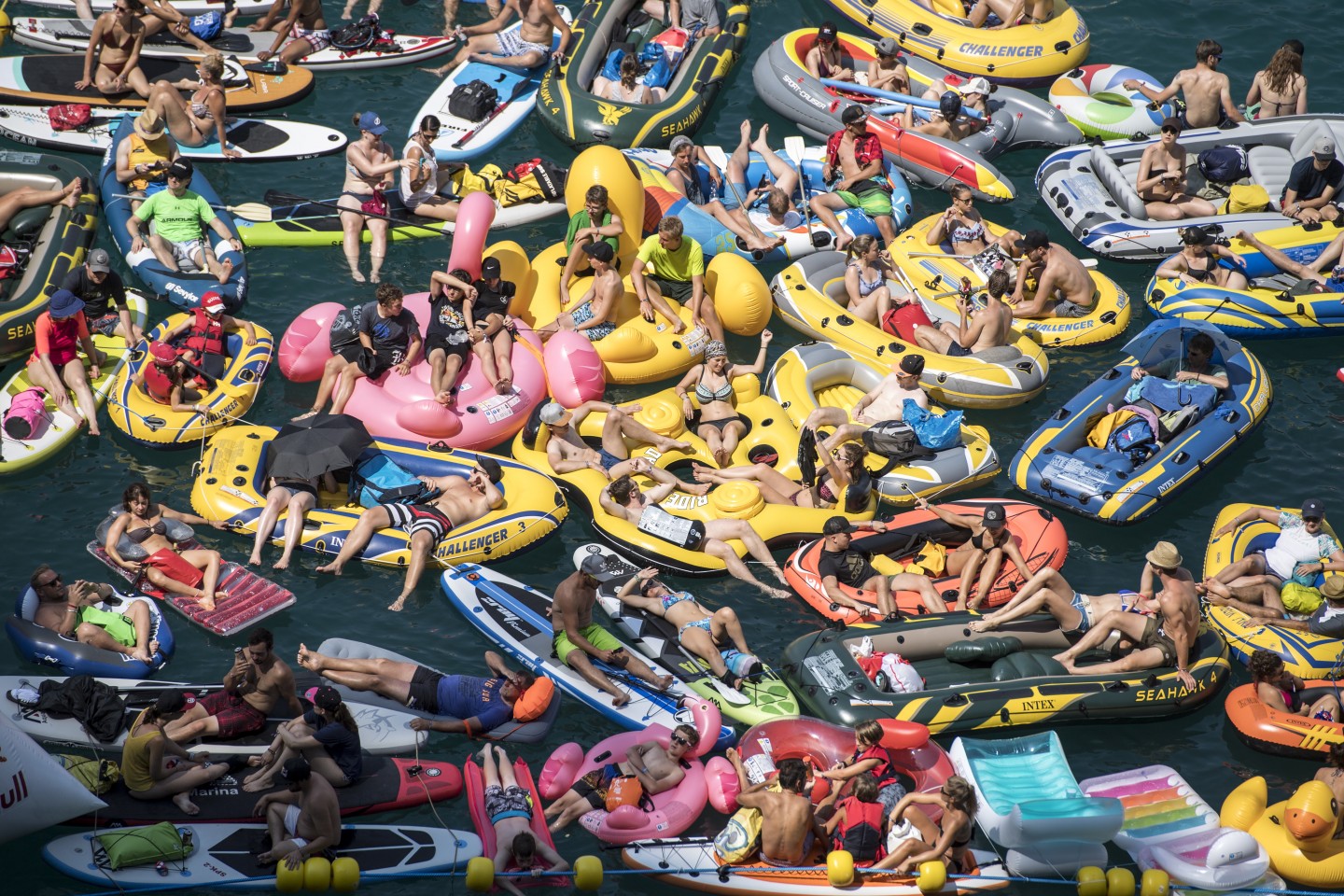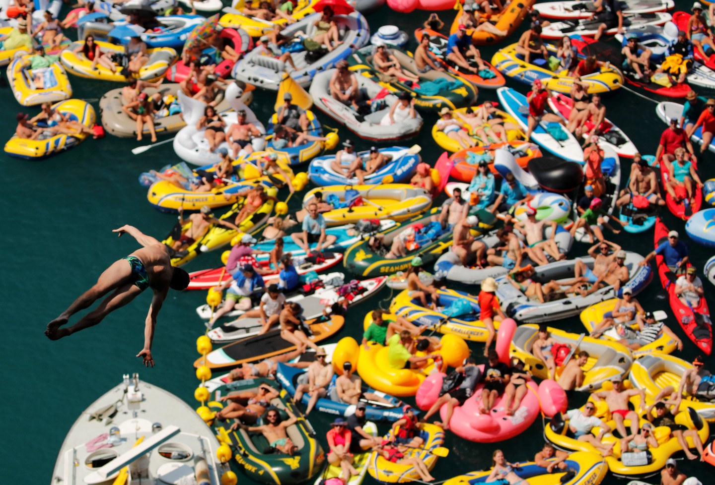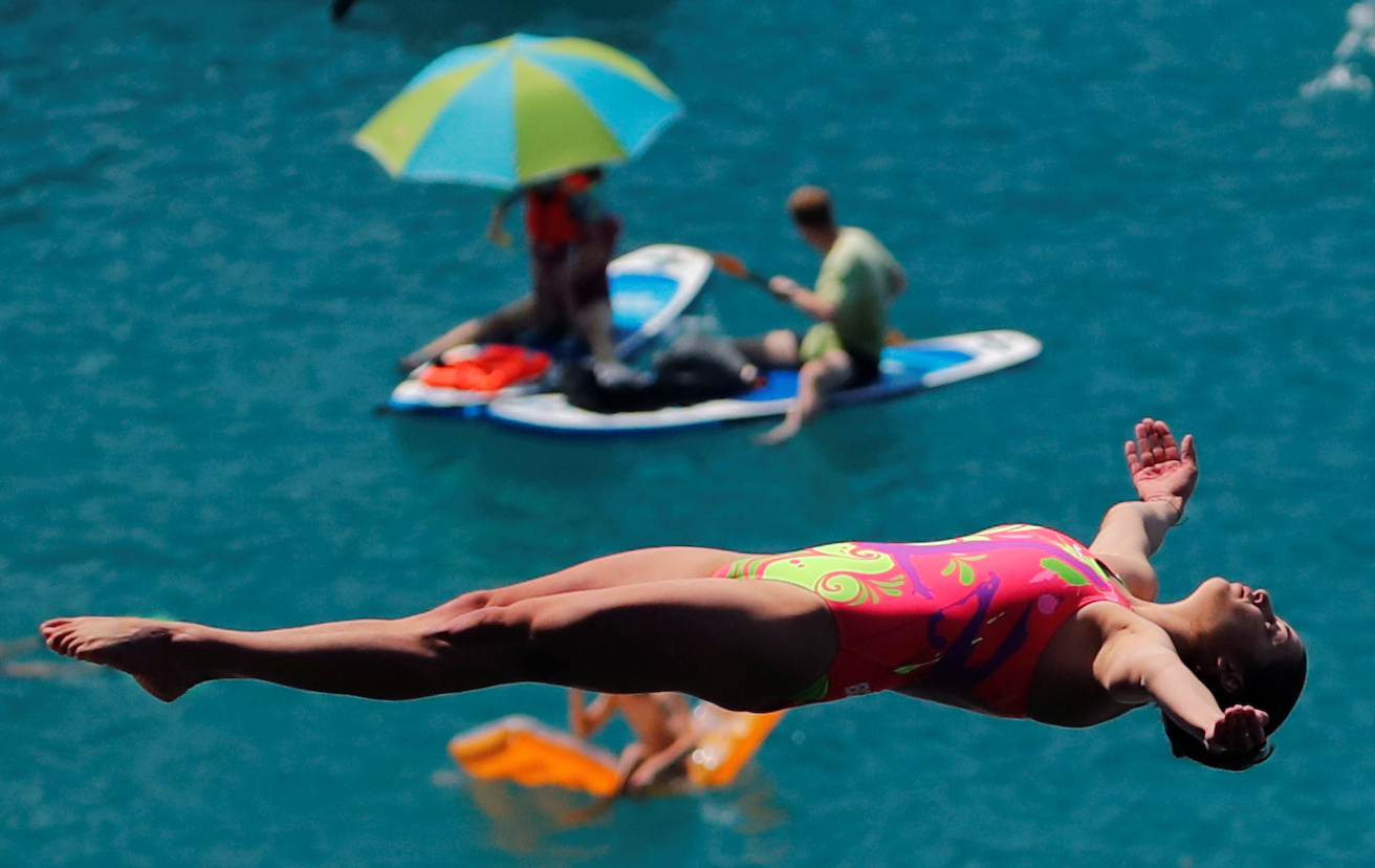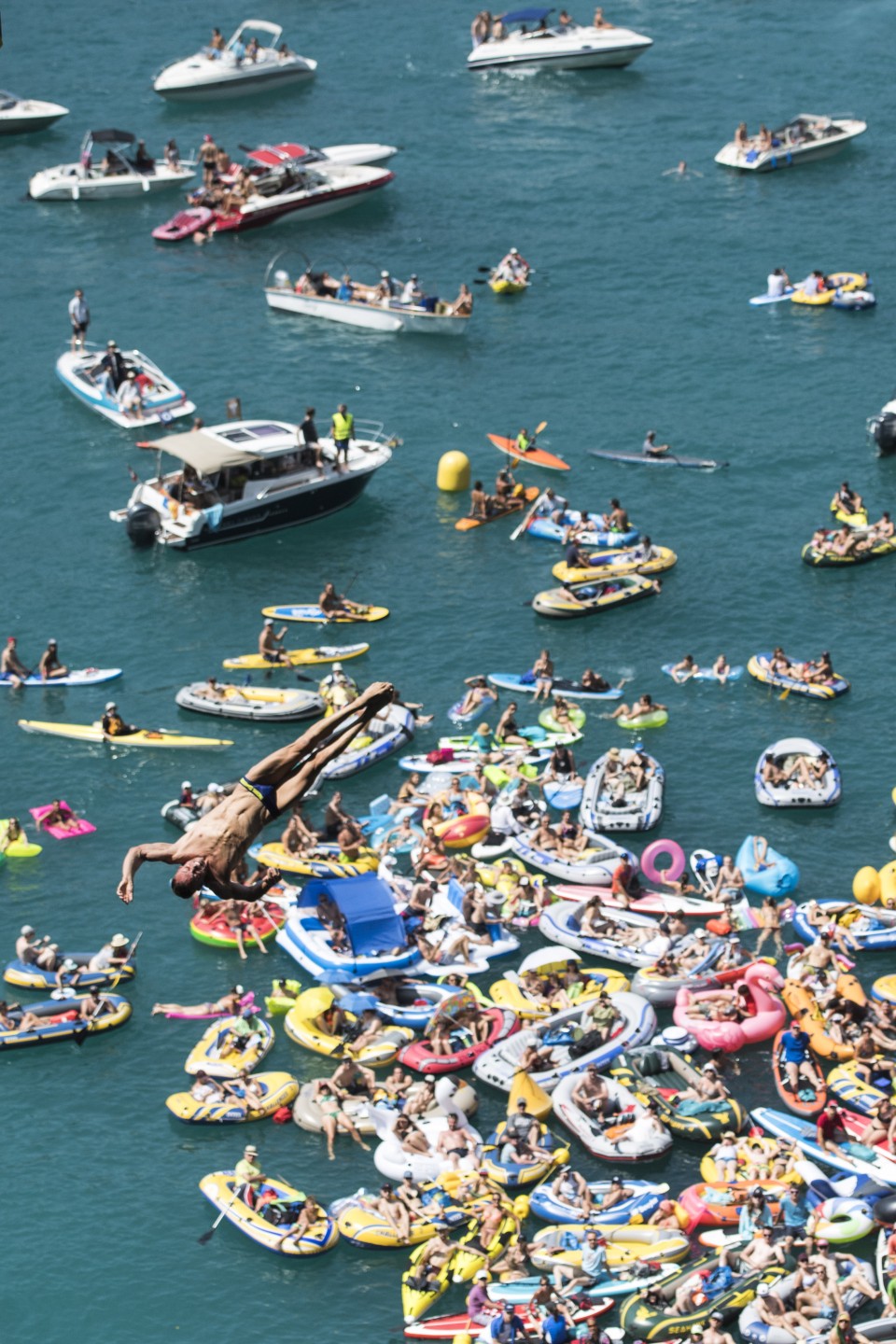 Šajā nedēļas nogalē pludmalē pie Lucernas ezera Šveicē pulcējušies desmitiem cilvēku, kuri tur bauda gan vasarīgos laikapstākļus, gan gaida sacensībās, kurās tās dalībnieki sacentīsies par skaistāko lēcienu ūdenī.