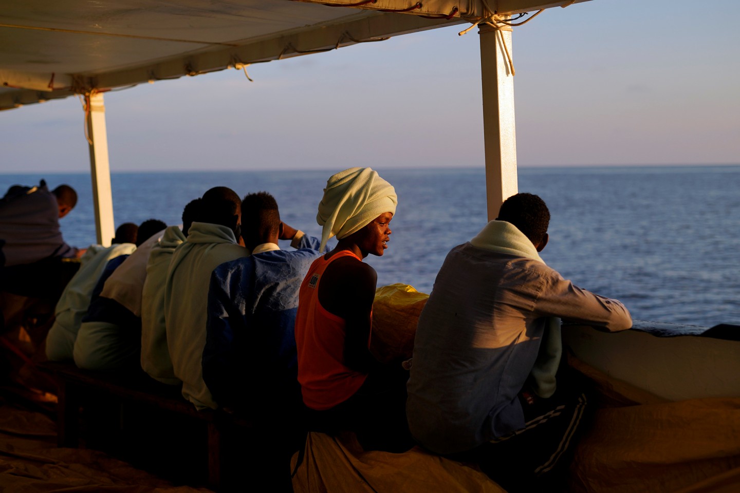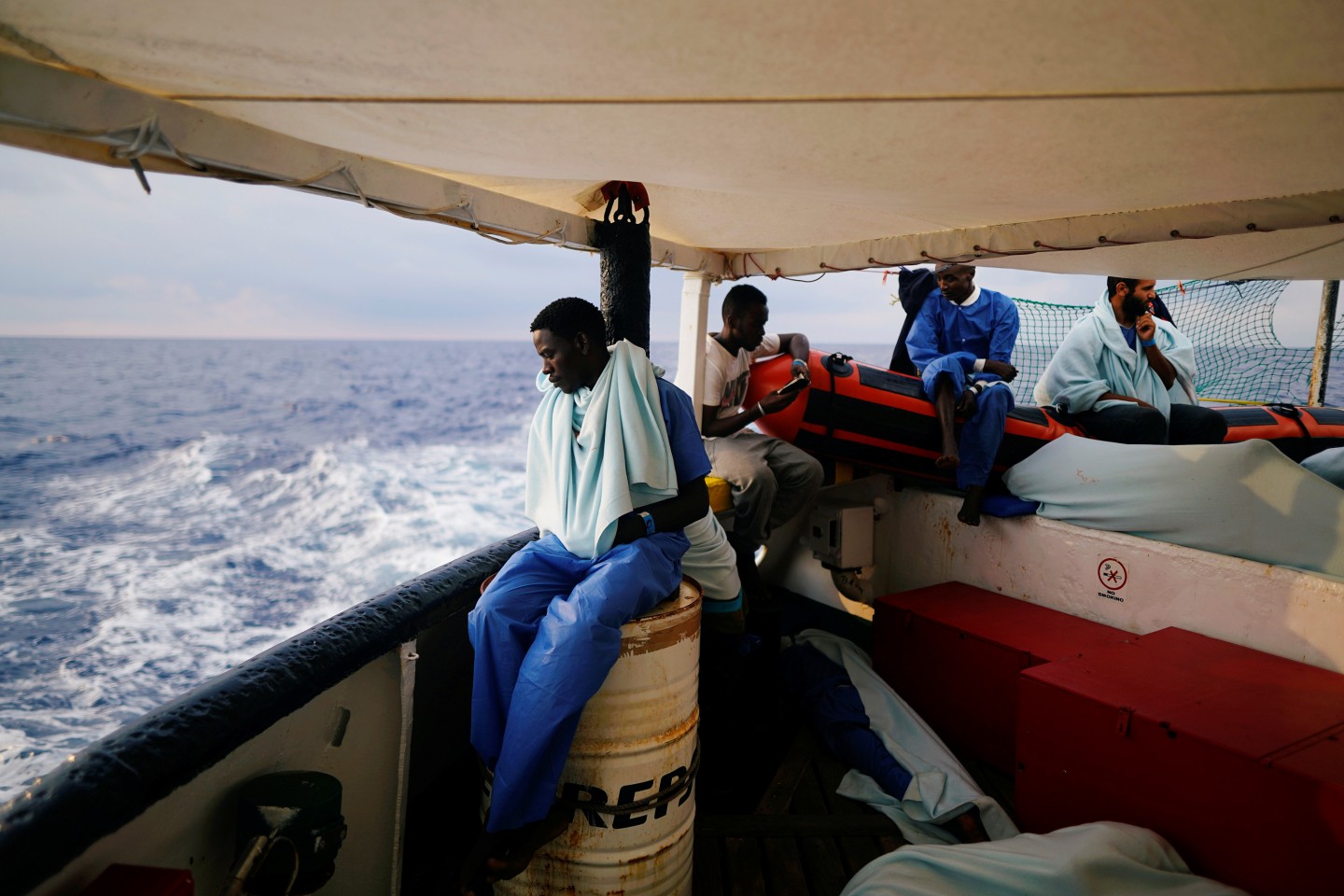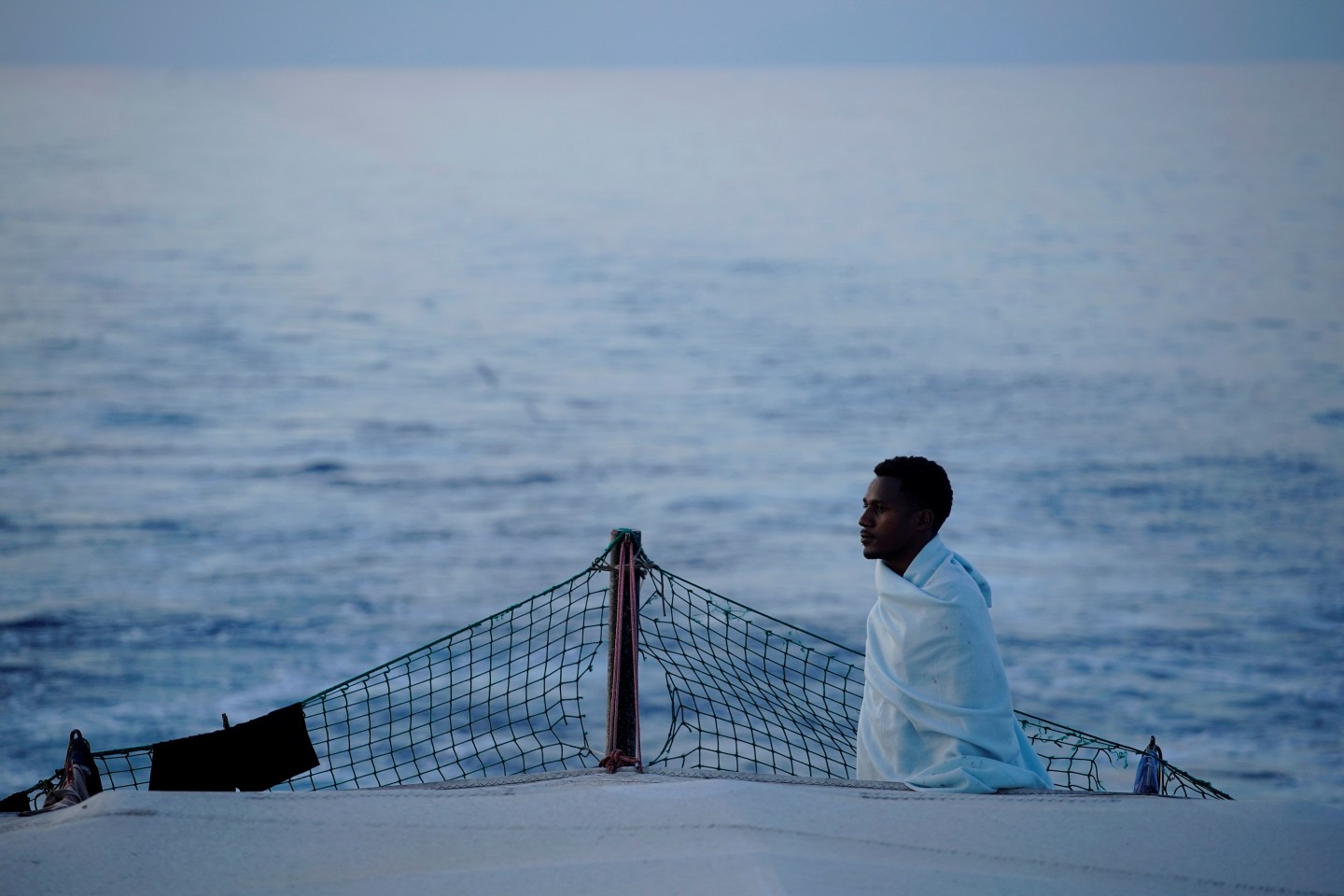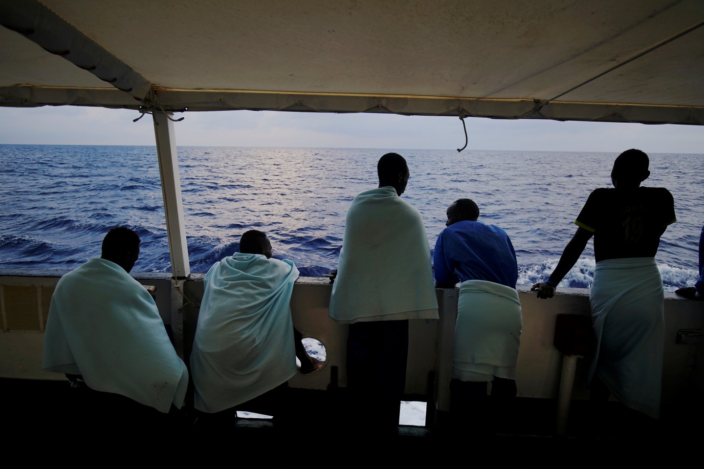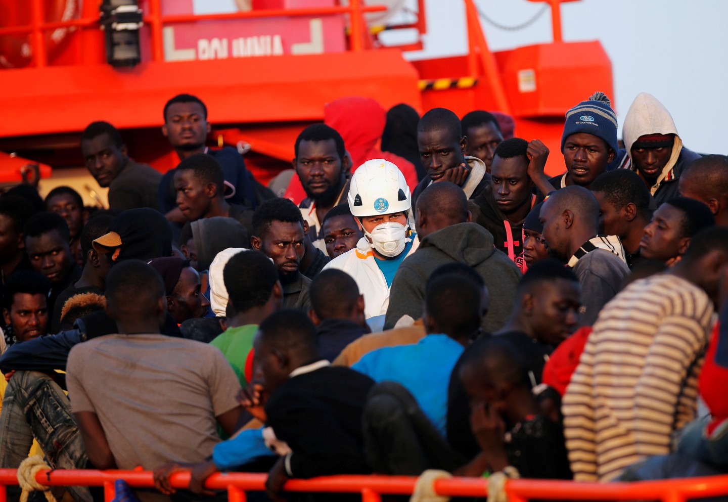 Kārtējā Vidusjūrā izglābtā migrantu grupa iemūžināta fotogrāfijās pirms nonākšanas Eiropā, šajā gadījumā - Spānijas pilsētas Malagas ostā.